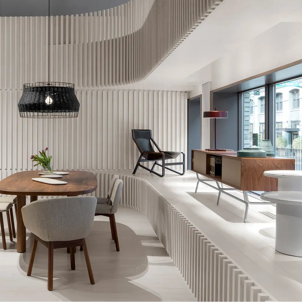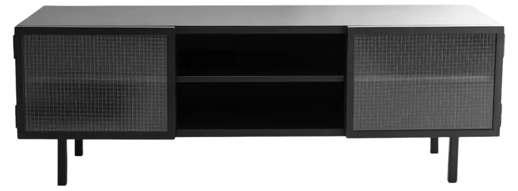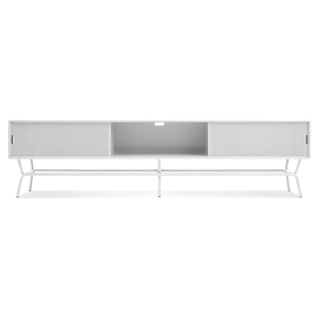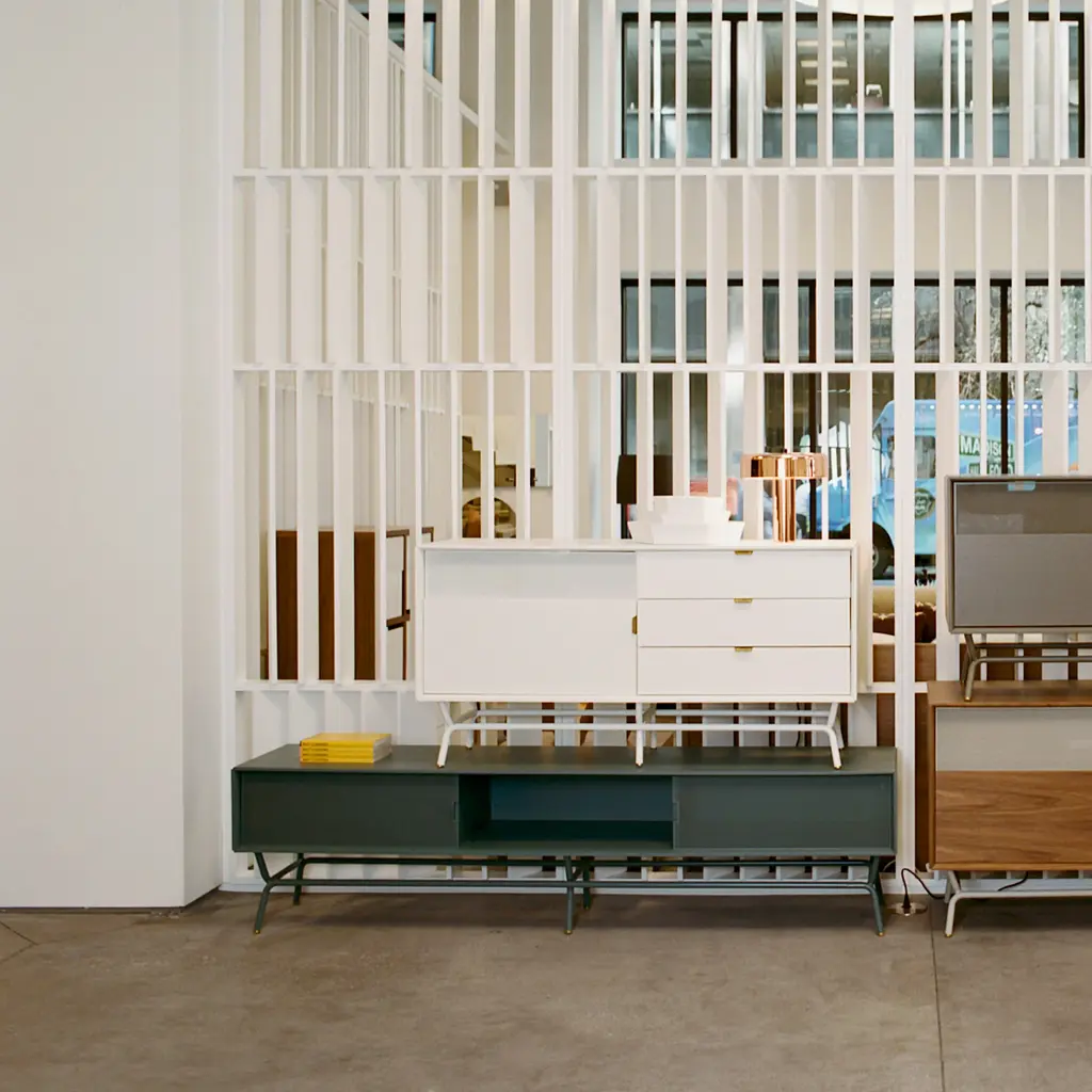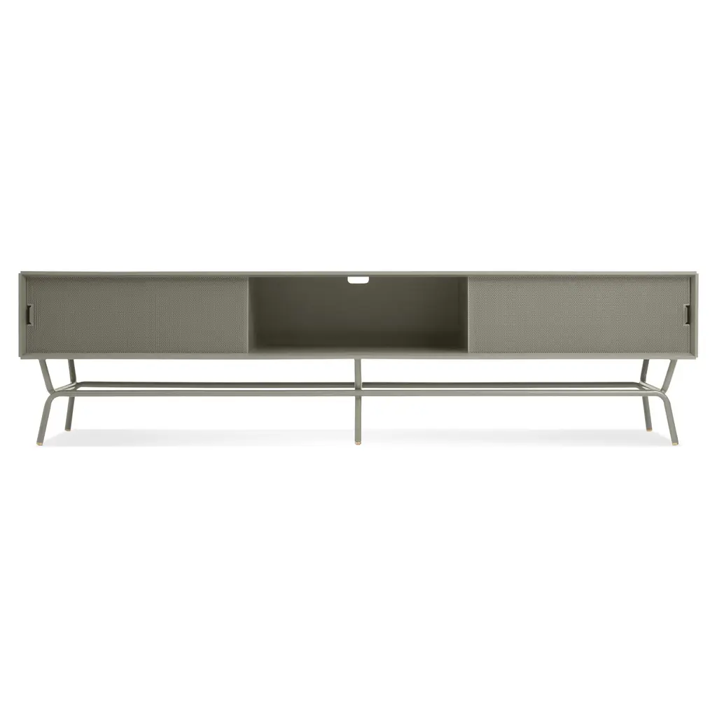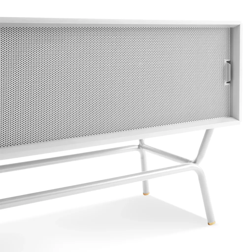 The Dang Long and Low Media Console from Blu Dot combines distinctive style with practical design. Its perforated steel doors allow remote signals to pass through without compromising aesthetics, making it ideal for living rooms. Offering two-thirds covered storage and a powder-coated steel frame for durability, it also features rear panel openings for effortless cable management, keeping your entertainment area sleek and organized. Highlights