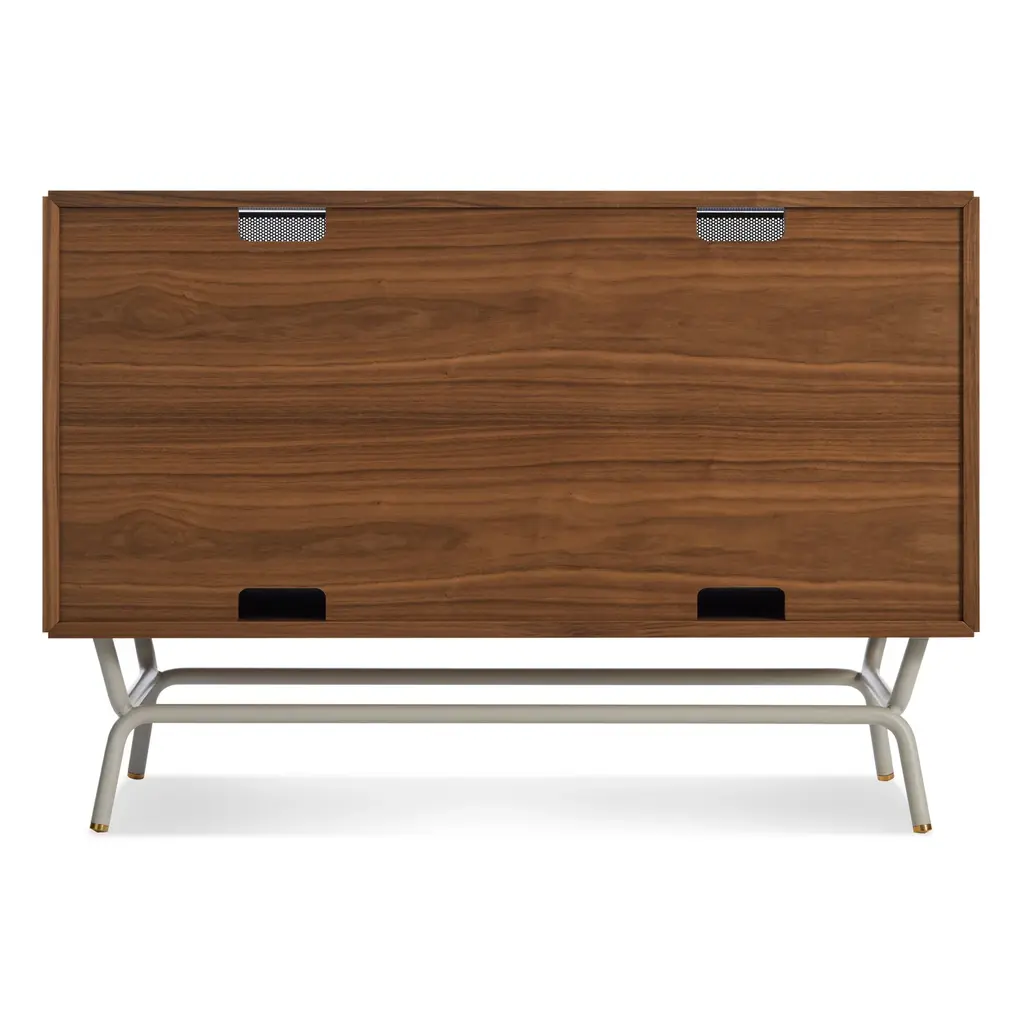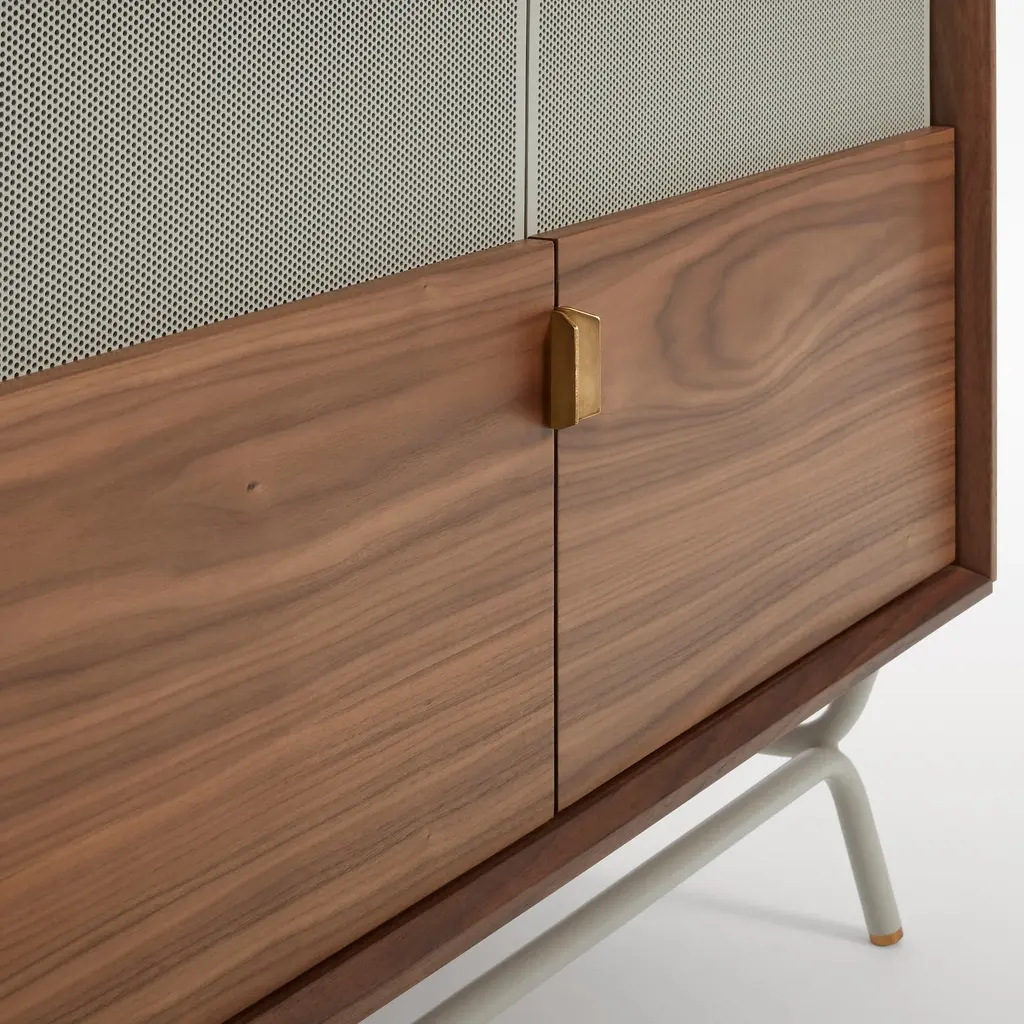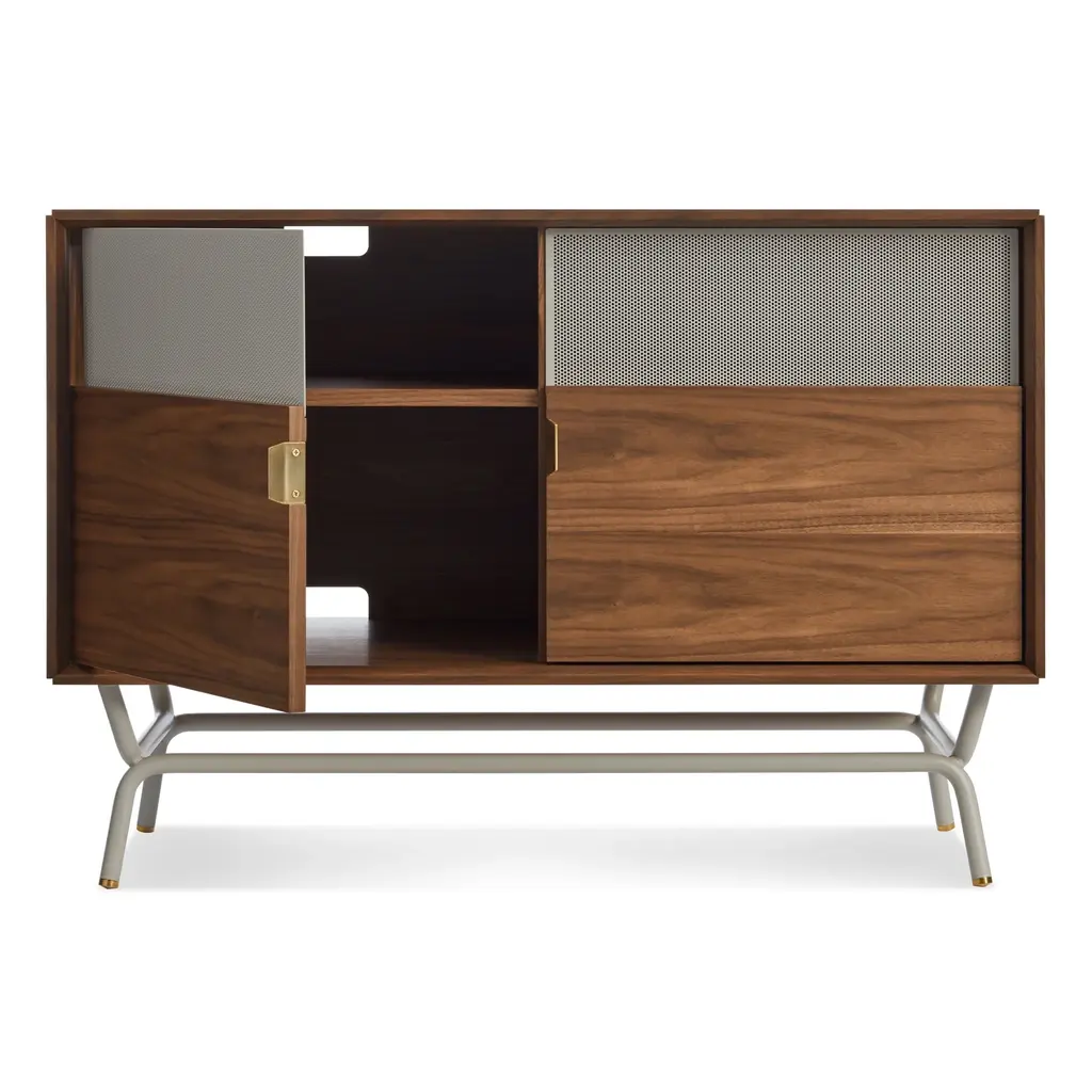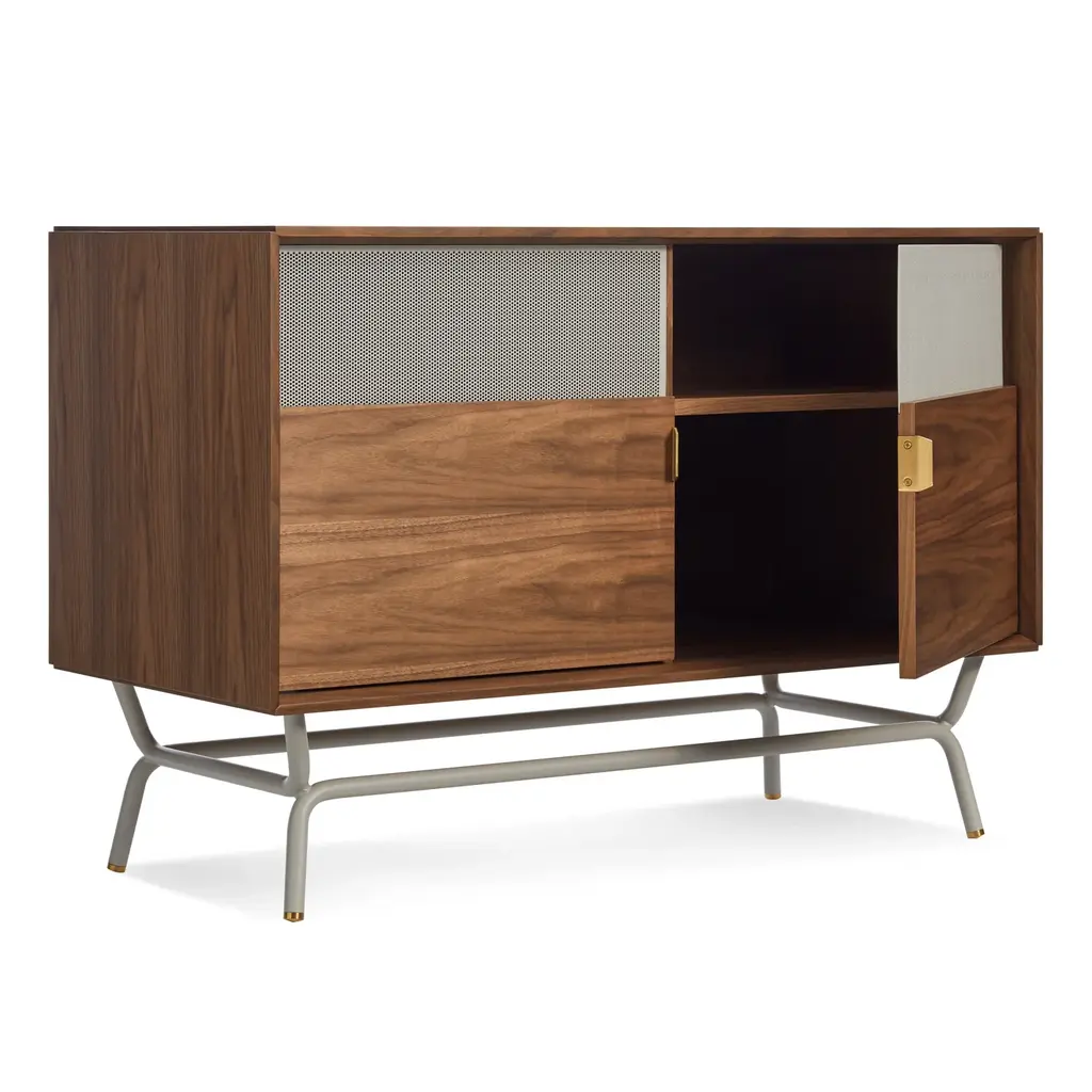 Perforated steel door fronts allow use of remotes without spoiling the view. Brass details and powder-coated steel base.