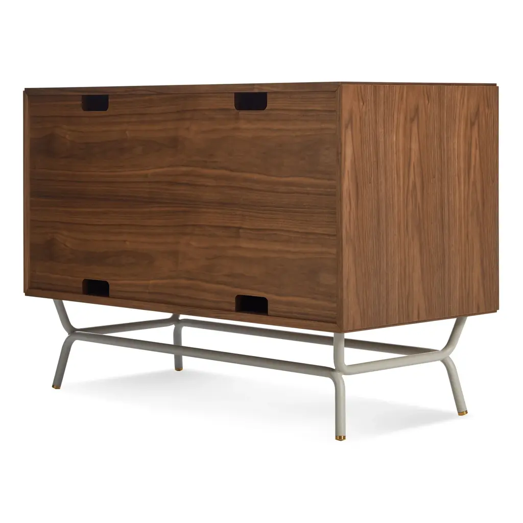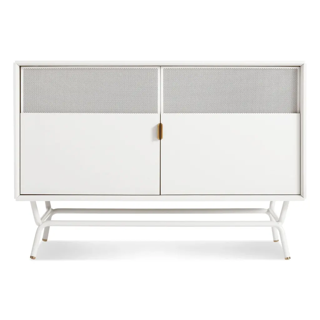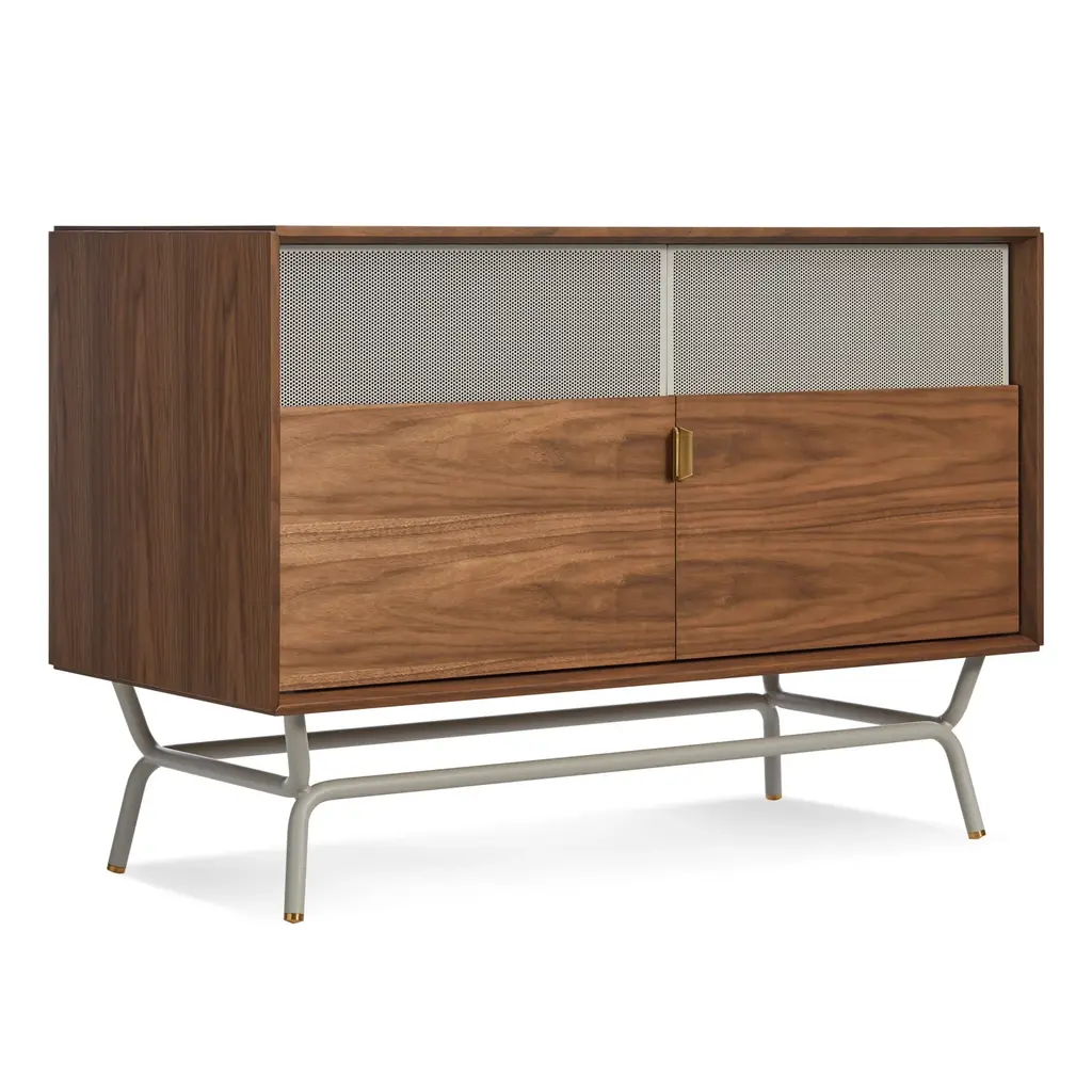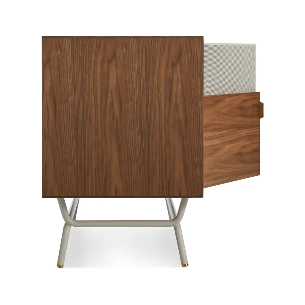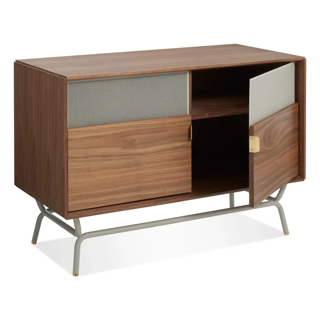 Perforated steel door fronts allow use of remotes without spoiling the view. Brass details and powder-coated steel base.