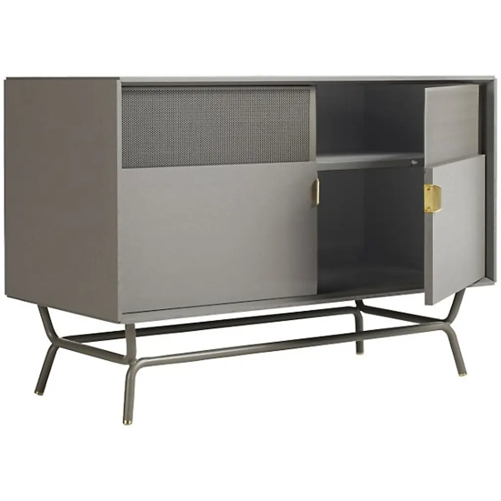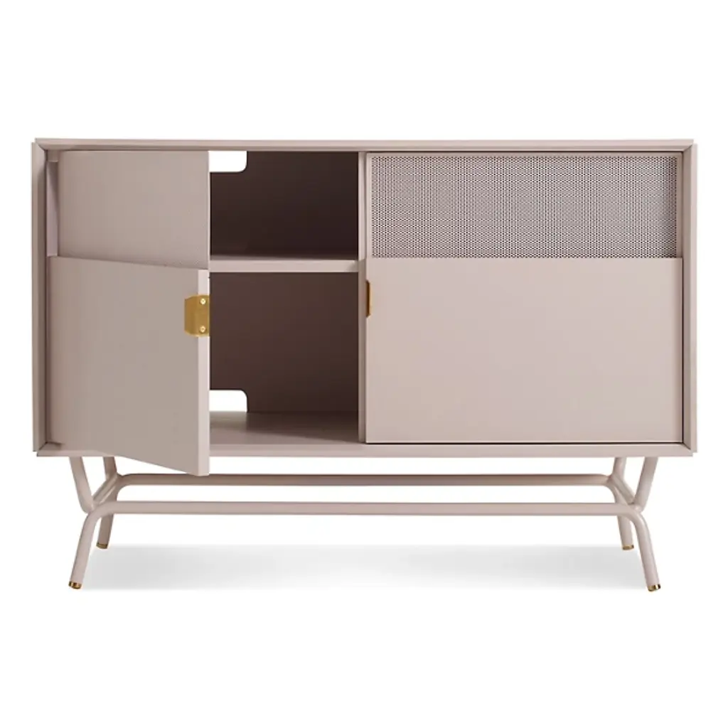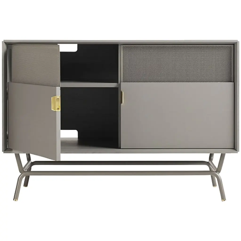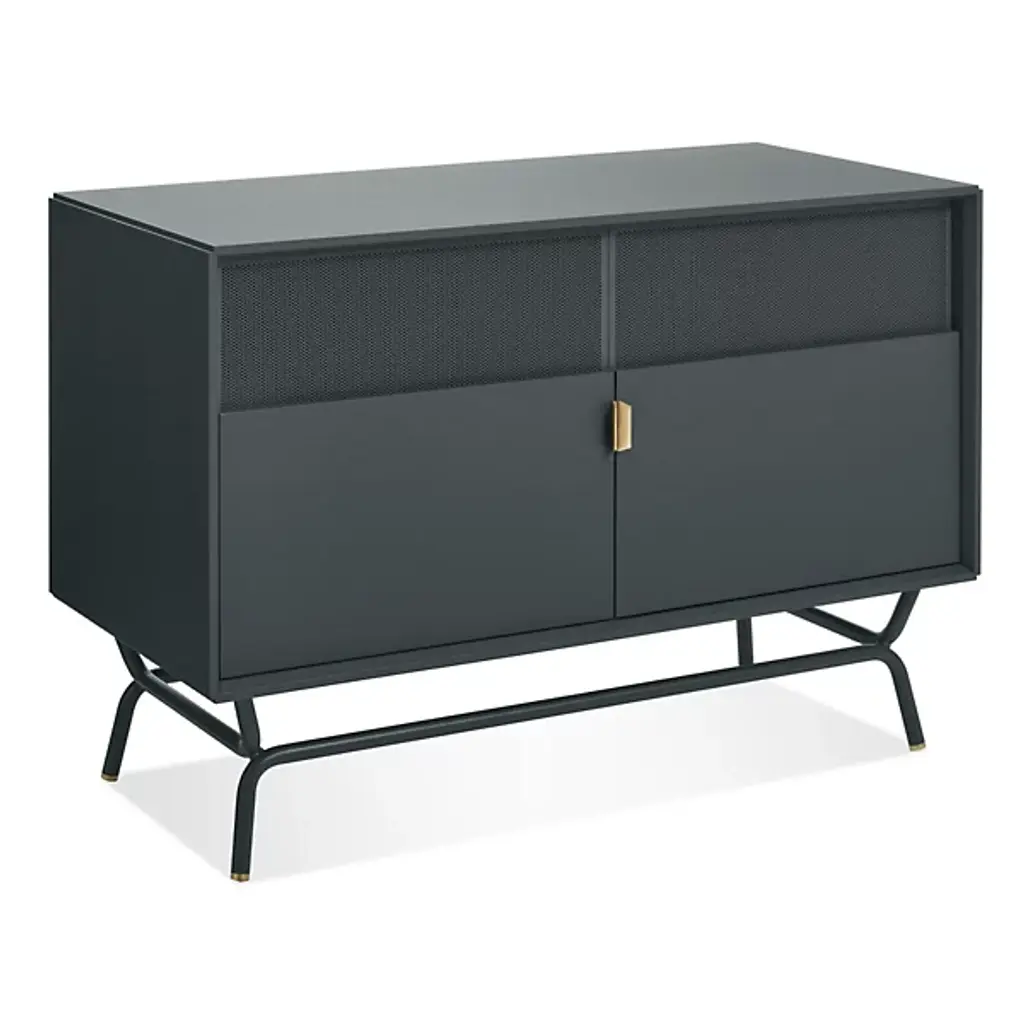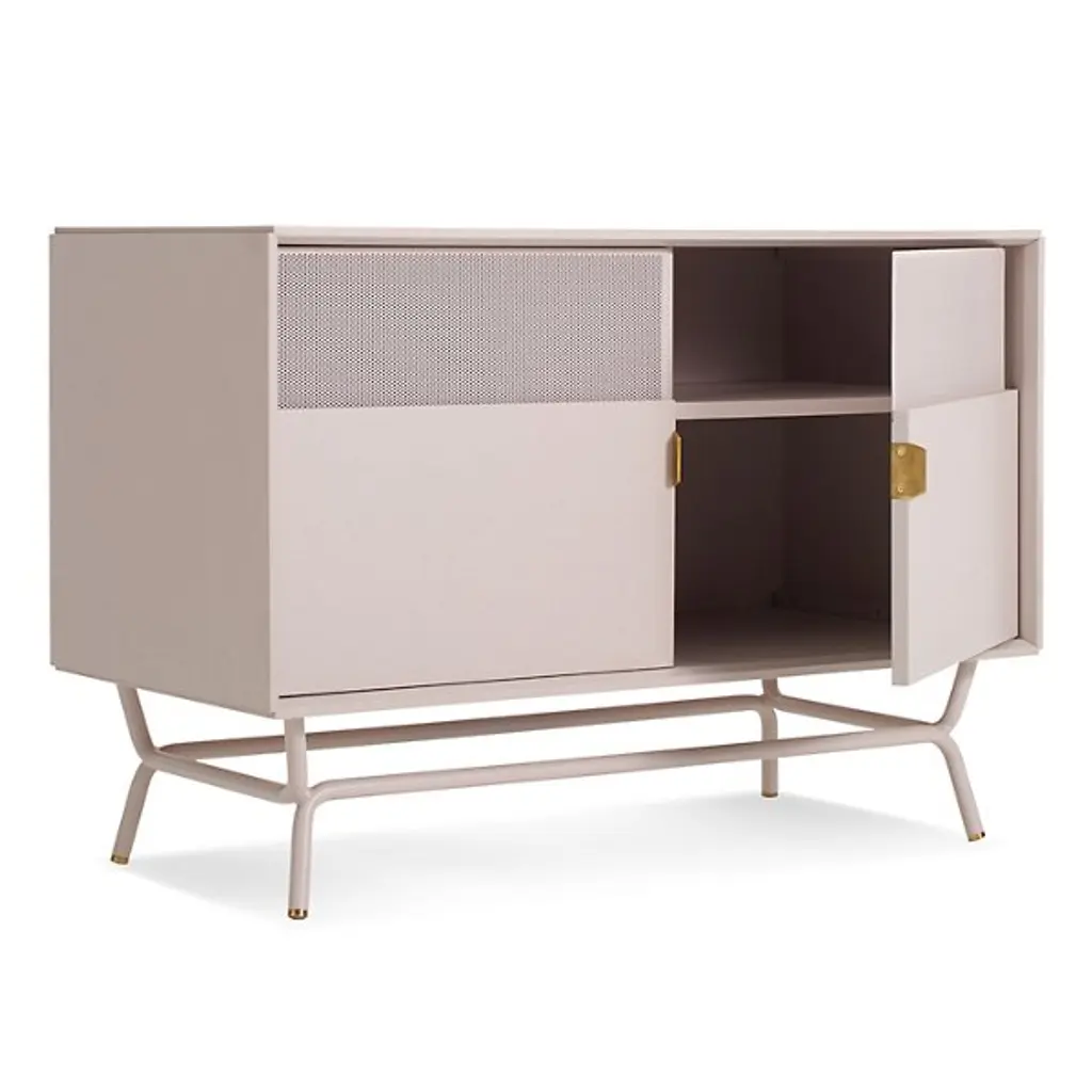 The Blu Dot Dang Media Stand is no cause for frustration--on the contrary, its perforated doors allow the use of remotes without having to keep the doors open, avoiding annoying visual obstructions. Bright brass handles bring a bit of bling to the powder-coated steel doors and wood cabinet, and add a pop of mid-century modern personality.