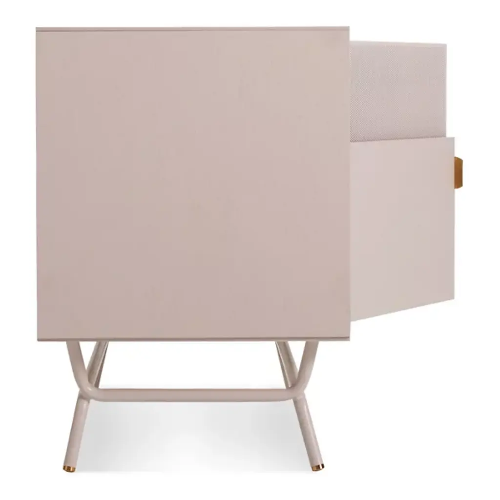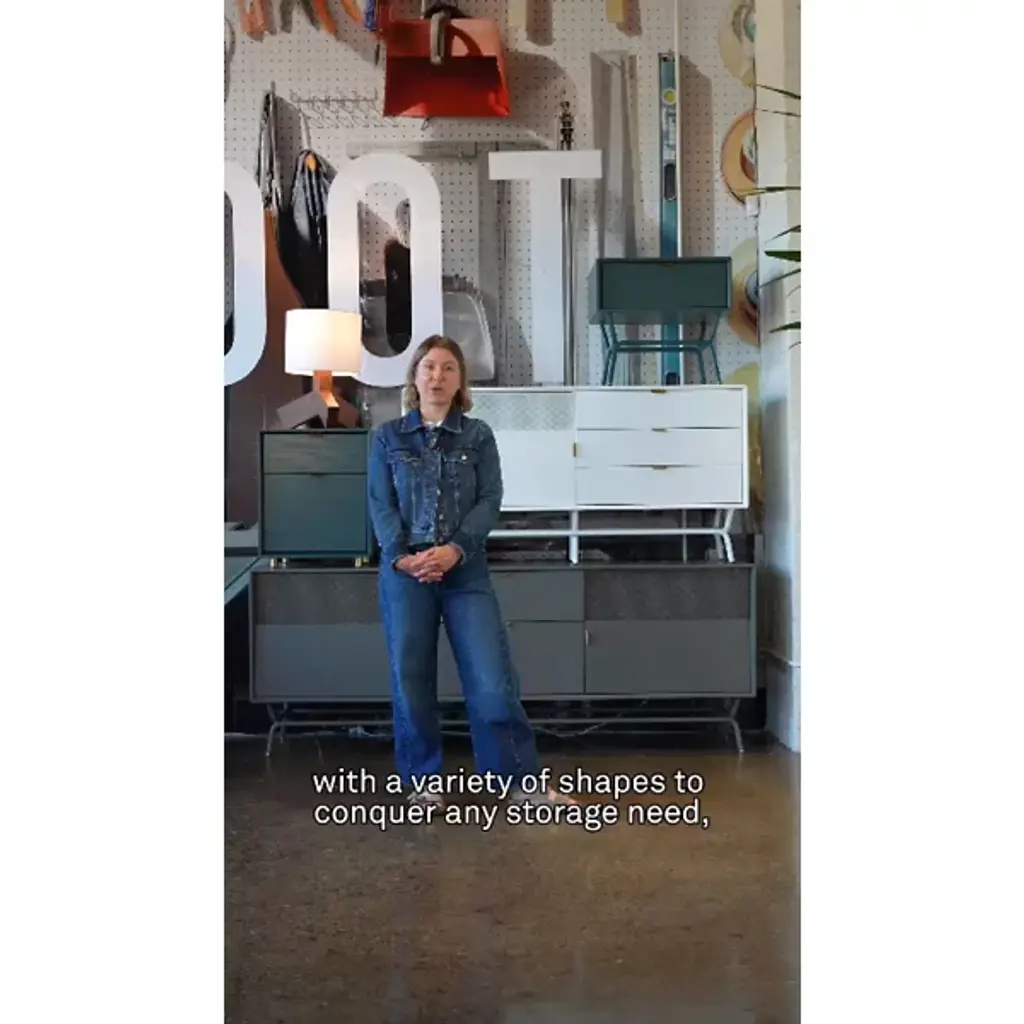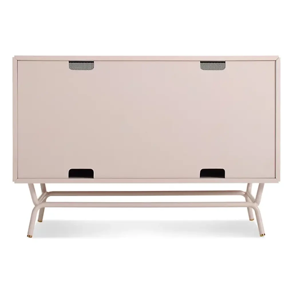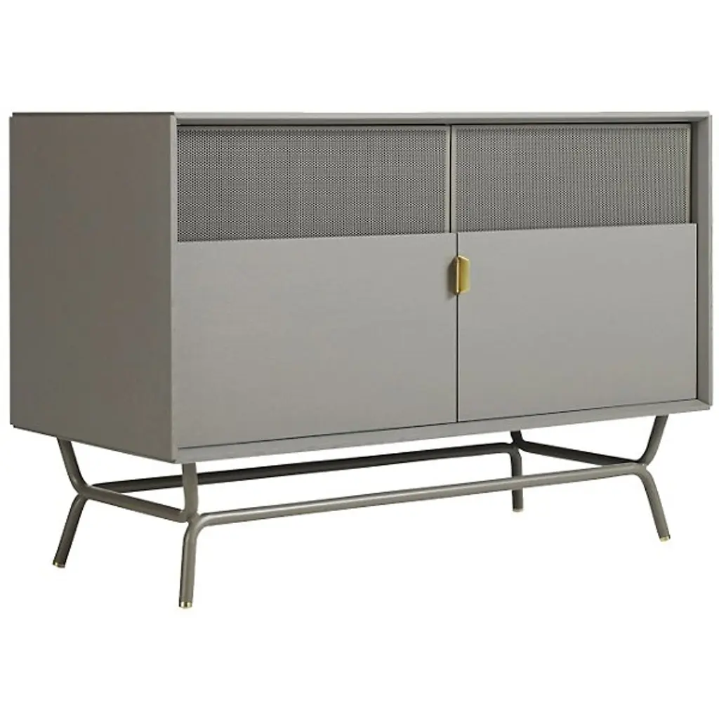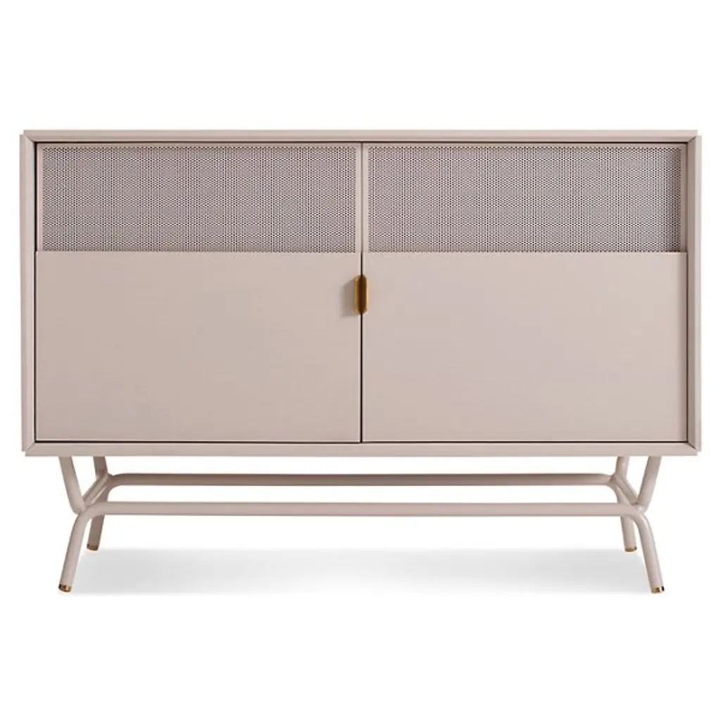 The Blu Dot Dang Media Stand is no cause for frustration--on the contrary, its perforated doors allow the use of remotes without having to keep the doors open, avoiding annoying visual obstructions. Bright brass handles bring a bit of bling to the powder-coated steel doors and wood cabinet, and add a pop of mid-century modern personality.
