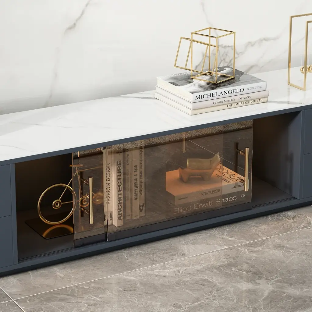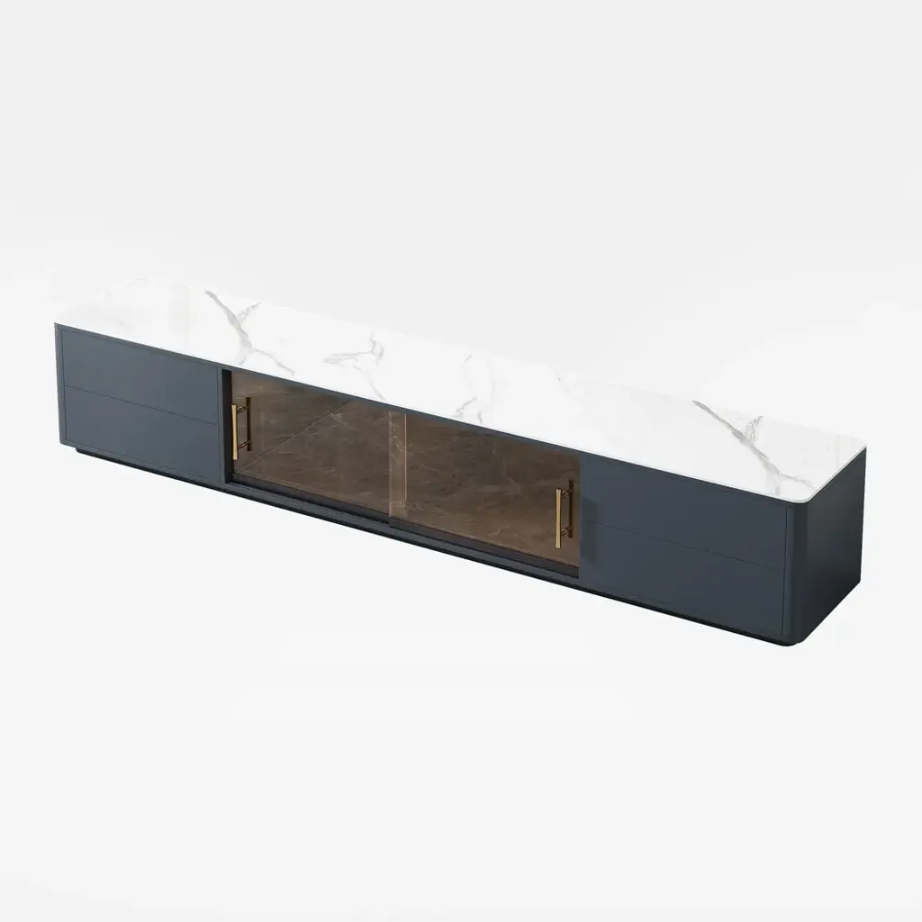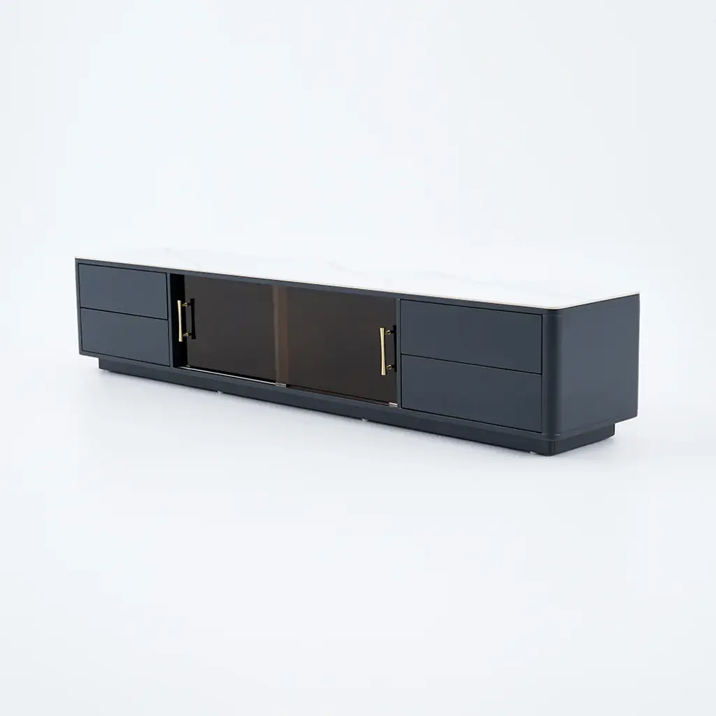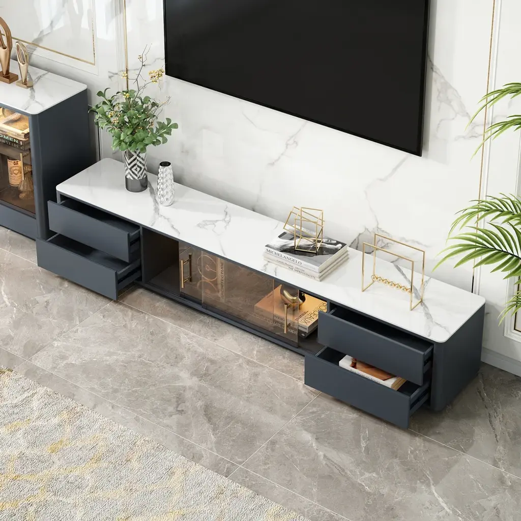 The TV console combines scratch-proof sintered stone surfaces with practical storage: two glass-door cabinets showcase collectibles while four deep drawers organize media gear. Functionality meets contemporary elegance.