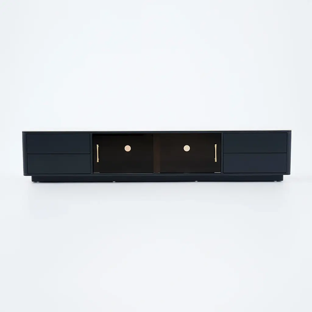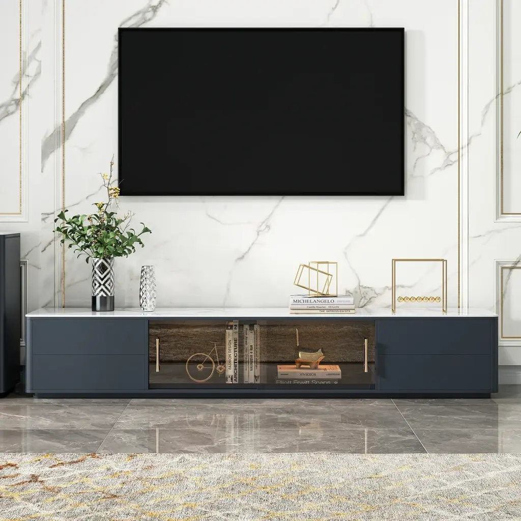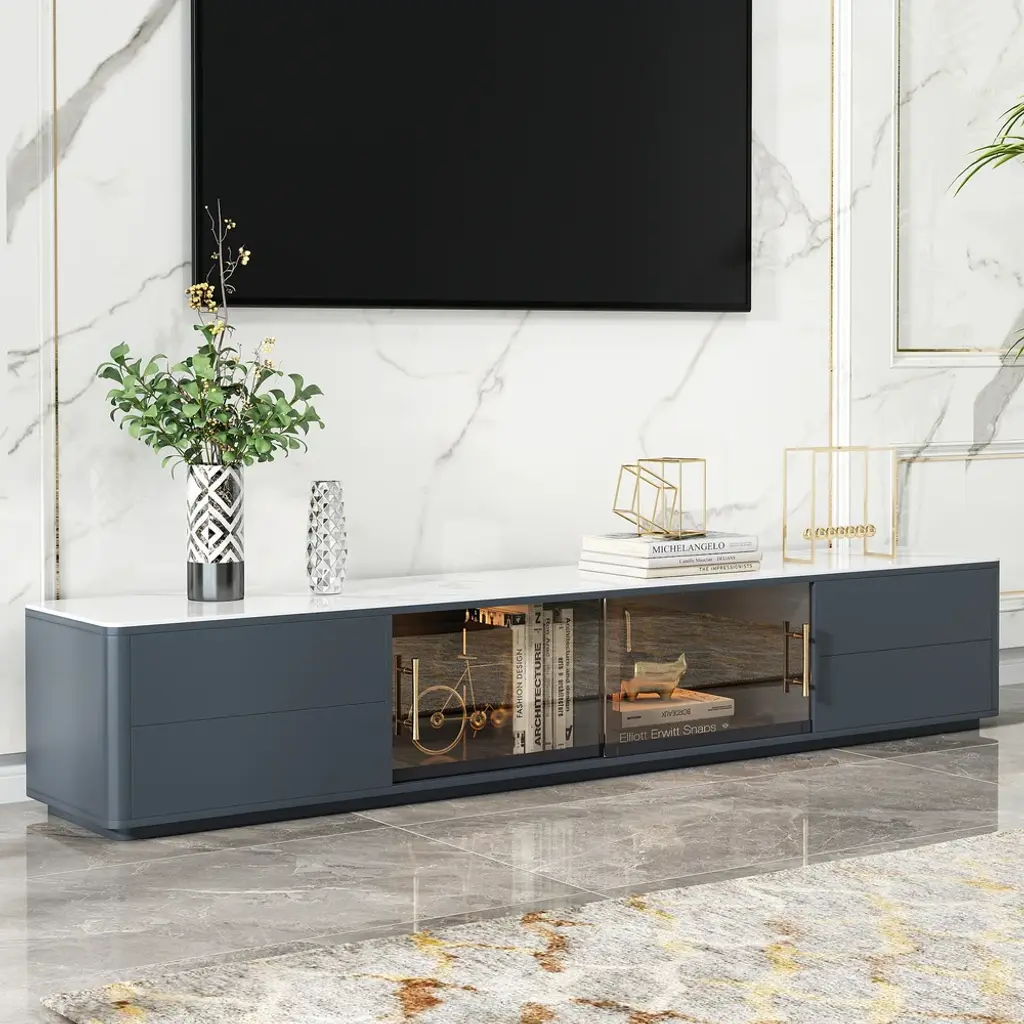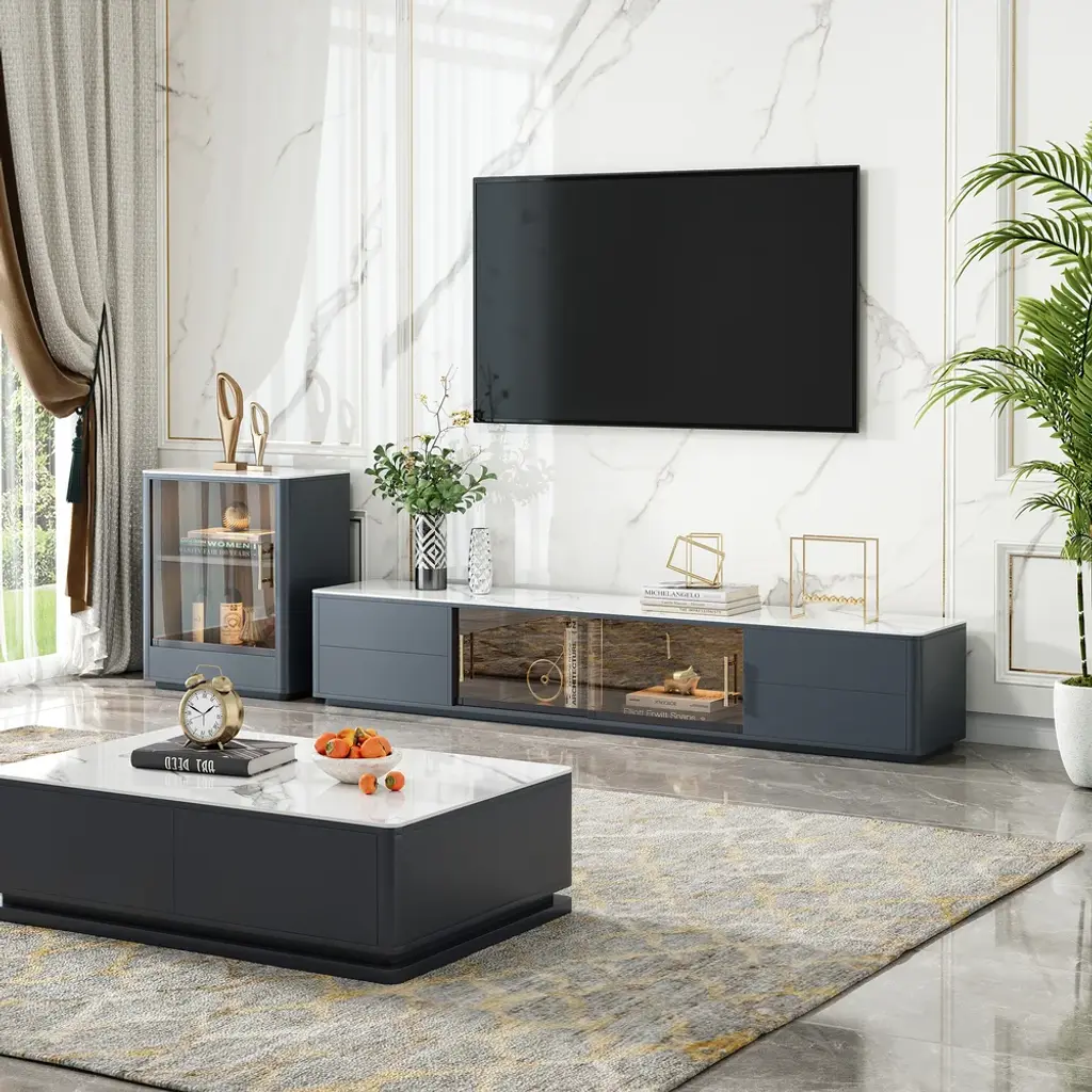 The TV console combines scratch-proof sintered stone surfaces with practical storage: two glass-door cabinets showcase collectibles while four deep drawers organize media gear. Functionality meets contemporary elegance.