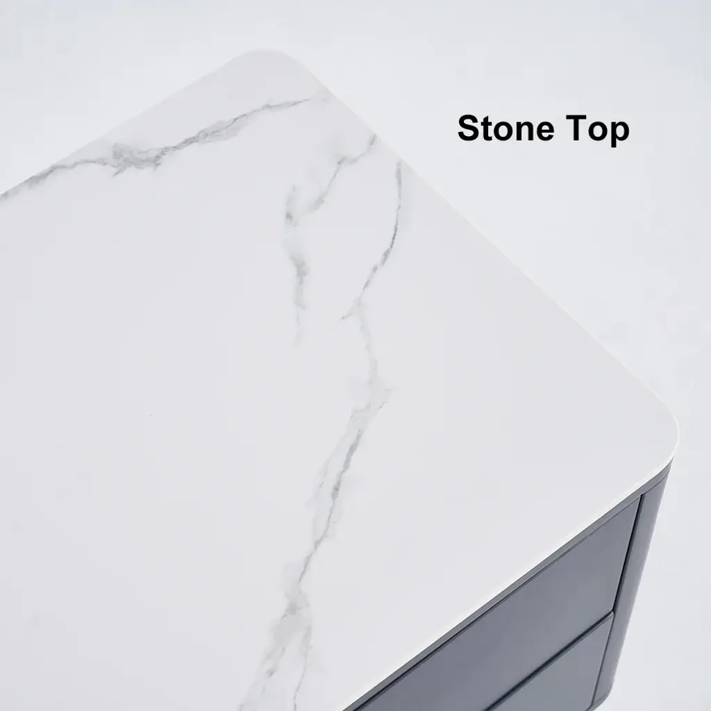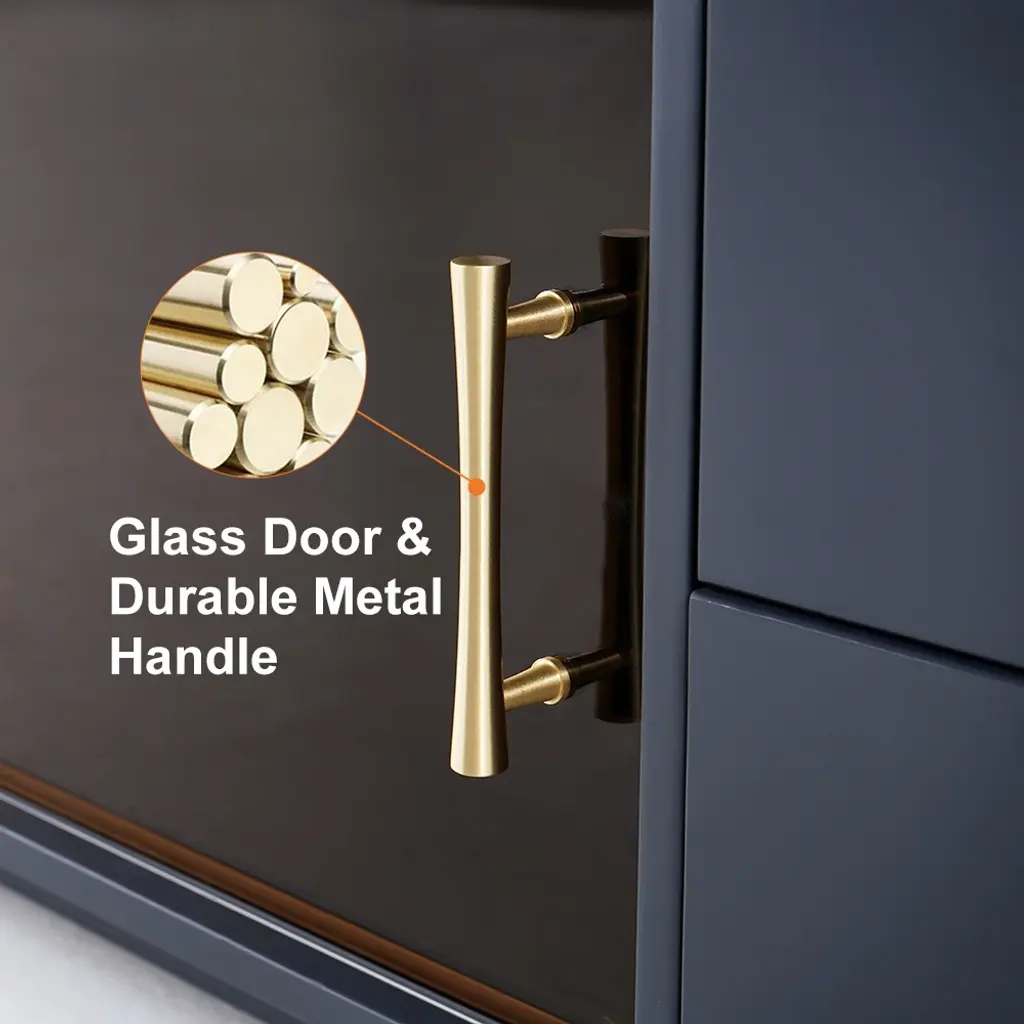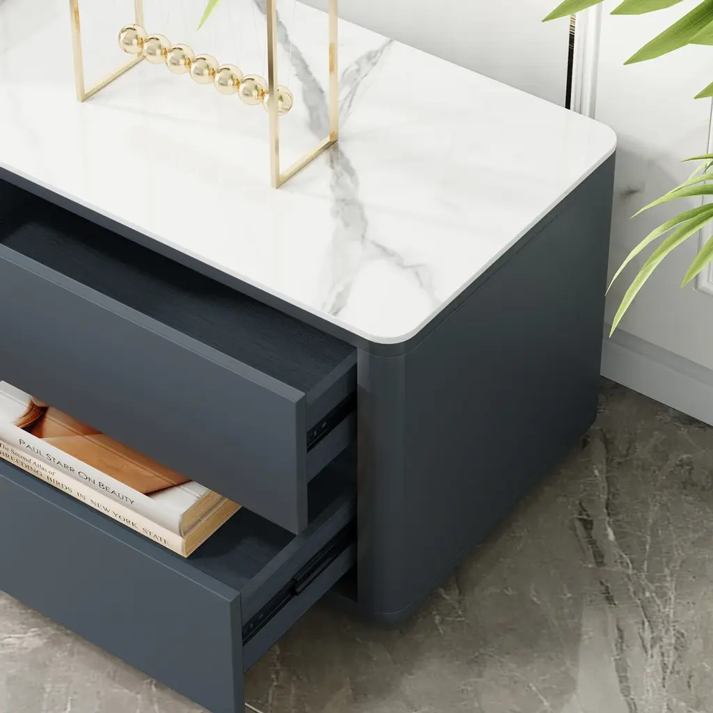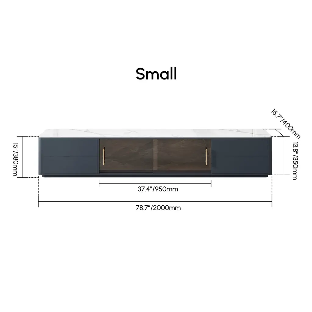 The TV console combines scratch-proof sintered stone surfaces with practical storage: two glass-door cabinets showcase collectibles while four deep drawers organize media gear. Functionality meets contemporary elegance.