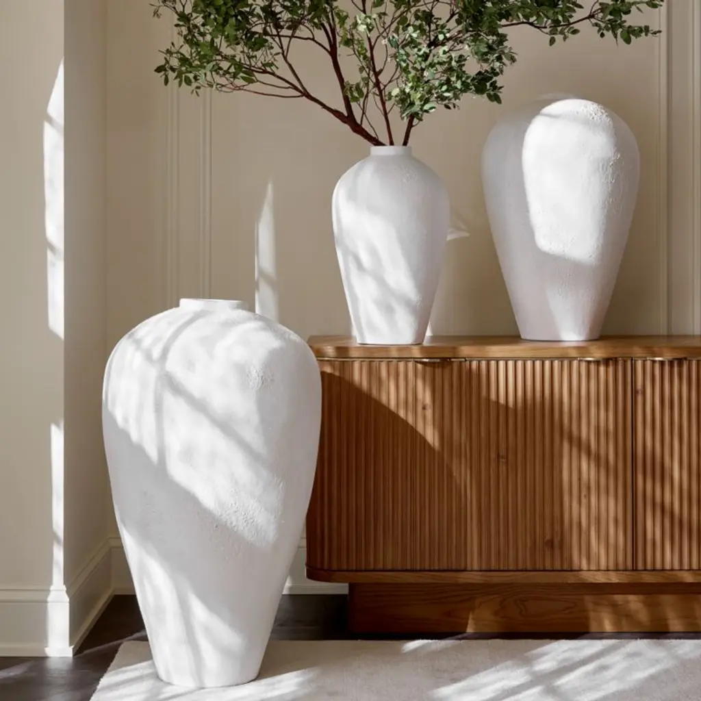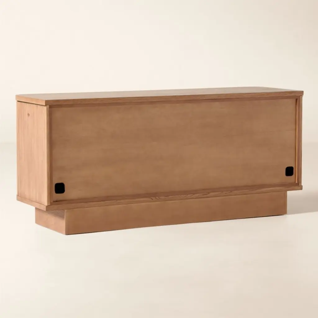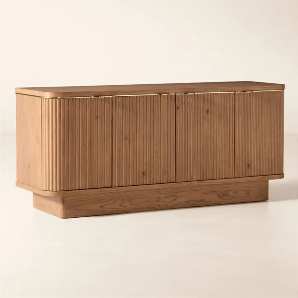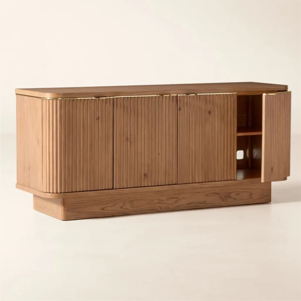Designed by Studio ANANSI, the soft, fluid silhouette of the Davison media console makes a stunning statement. Fluted door fronts are complemented by polished unlacquered brass handles, offering a living finish that will develop the patina of a vintage find. Simply polish the brass to restore its original luster. CB2 exclusive.
