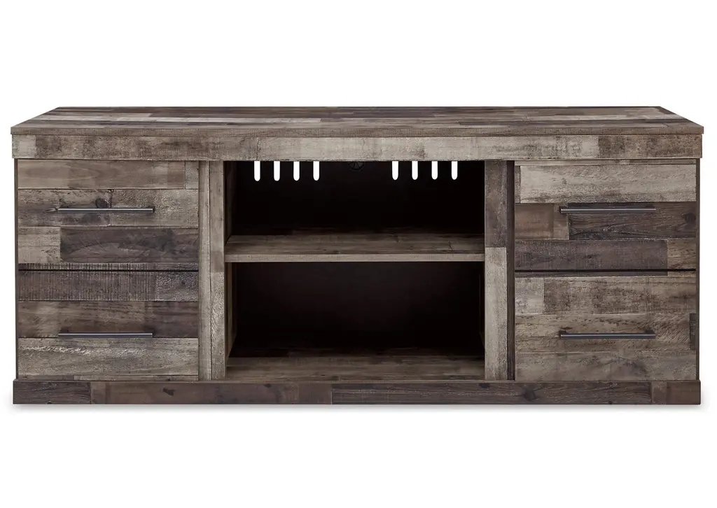 Make this TV stand with LED fireplace insert the center of attention with its popular urban eclectic style. Its rustic finish over a replicated pine grain creates an authentic natural look for your home entertainment area. You'll love its functionality. Two spacious cabinets with shelved storage easily accommodate media needs. What really turns up the heat: an electric infrared fireplace insert with faux firebrick surround that operates with or without infrared heat. With the touch of a button, adjust the temperature and the flame brightness, and set the timer for long-lasting enjoyment. Weight 131.000 lbs. (58.95kgs.)