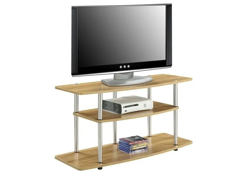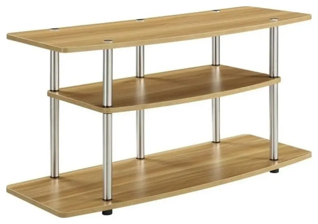The Designs2Go 3 Tier Wide TV Stand is the perfect complement to any living room décor. Featuring an open modern design that allows for easy cable management. Made of wood and stainless steel components, this TV stand is built to last for many years of enjoyment. With three shelves, there is plenty of room for all of your electronic components, as well as movies, games, and even decor pieces. Bring it home today and spruce up your entertainment.Features:Beautiful Off White light oak wood finishMaterial: wood grainNo tools requiredStainless steel chrome polesWill provide years of enjoyment22.25" H x 42" W x 15.75" DSpecifications:Product Dimensions: 22.25" H x 42" W x 15.75" DProduct Color: Faux Oak