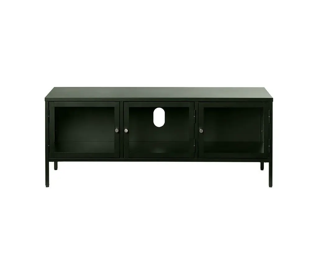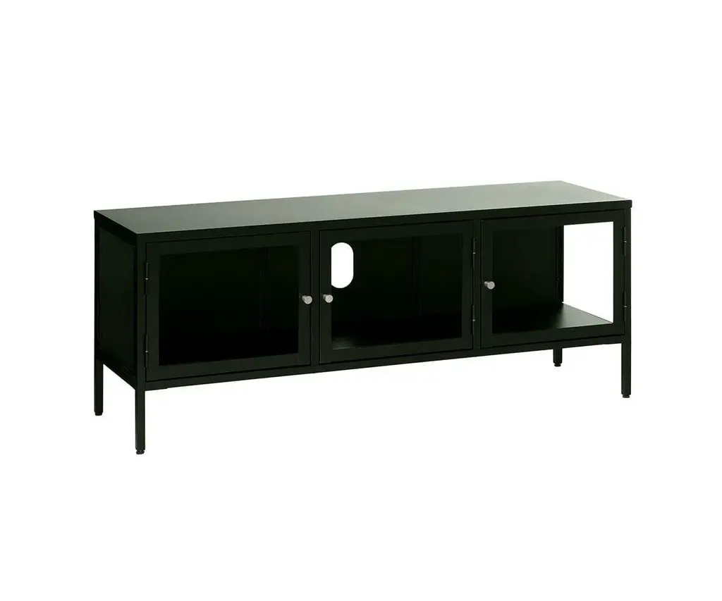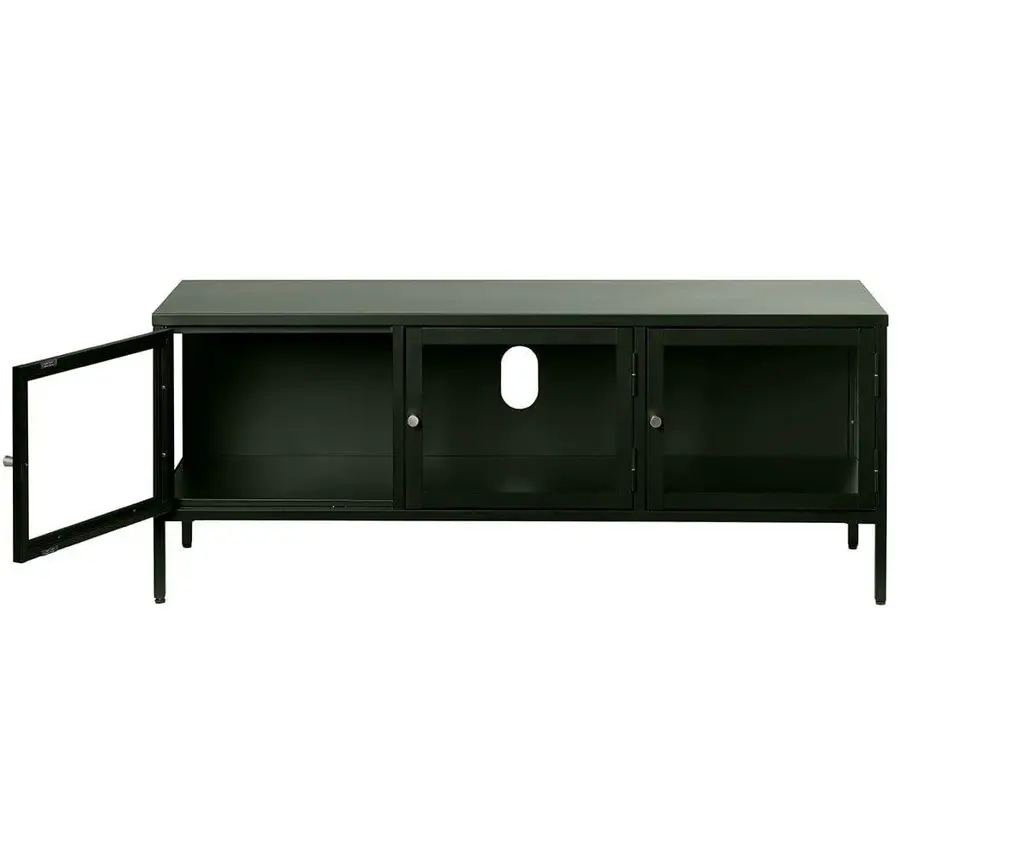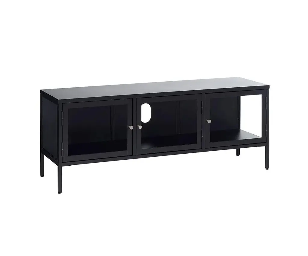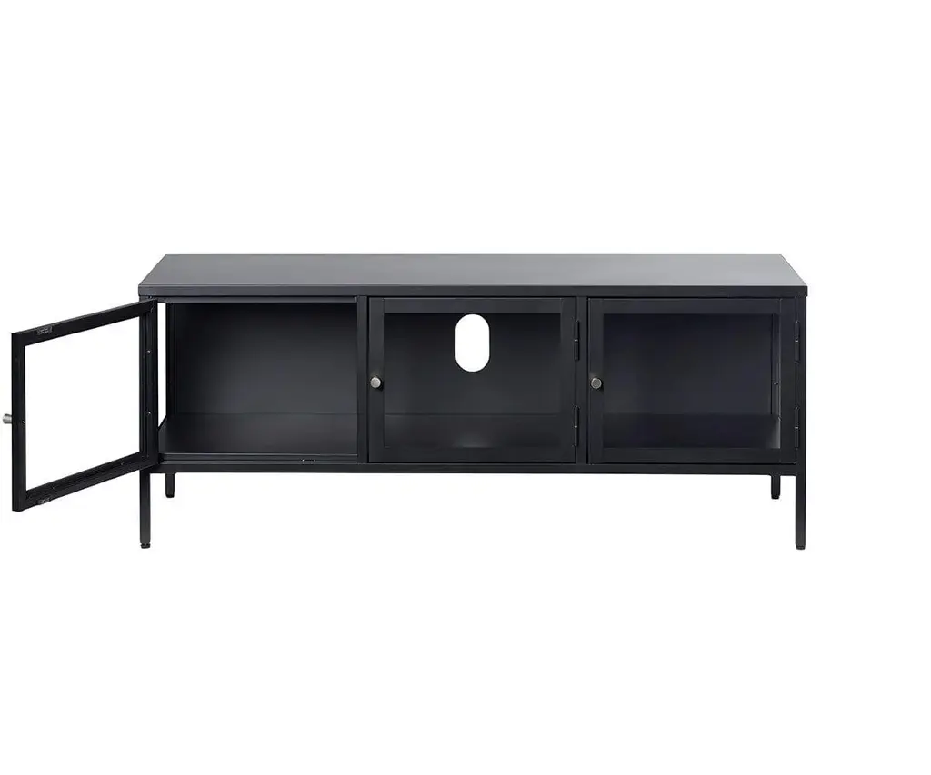 The Dion Media Stand is a svelte, modern addition to any living room. Ample storage offers you the chance to showcase your media necessities in style while keeping them safe behind closed doors. A flat surface is the perfect place for your TV, and convenient cord-organizing cutouts allow you to connect your media items seamlessly. The Dion Collection pairs tempered glass doors and sides with sturdy metal framework to create an airy look that's both modern and minimalistic. Platinum hardware and crisp, clean lines mean that the pieces in this collection can be easily styled within a wide variety of design aesthetics.