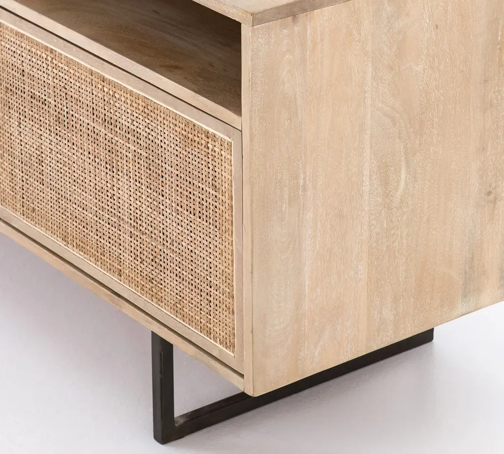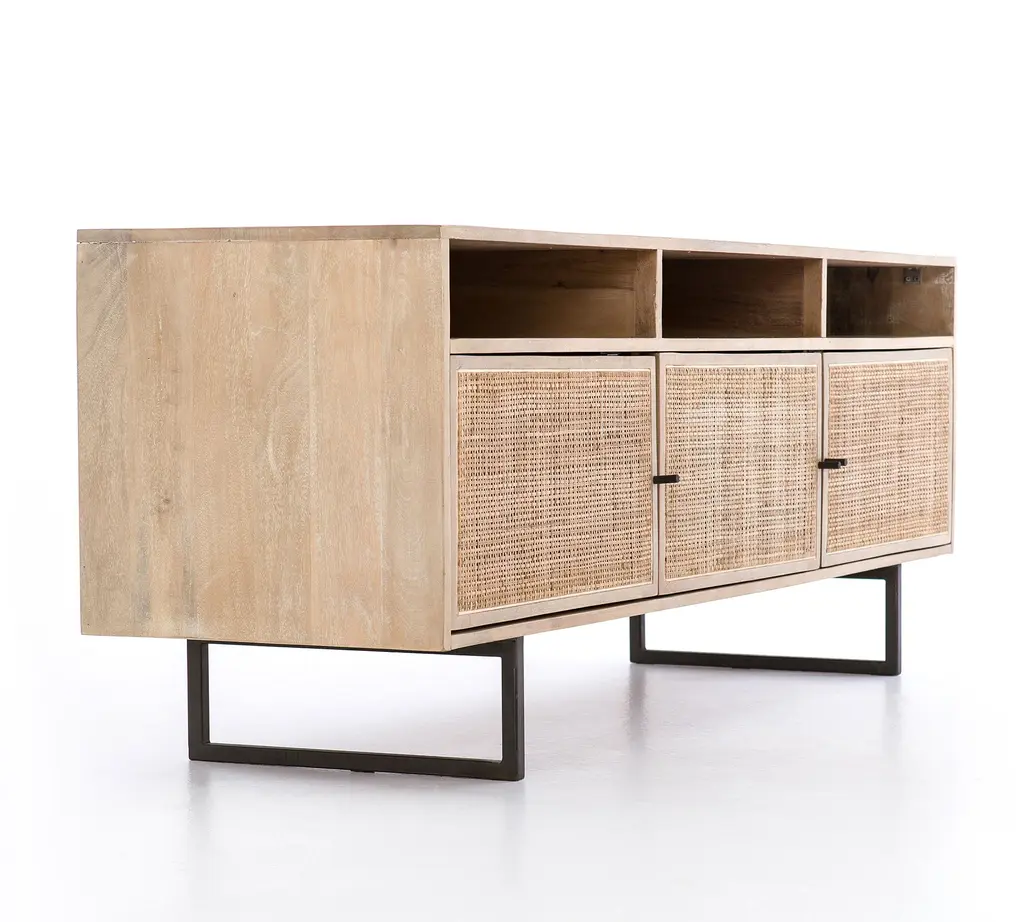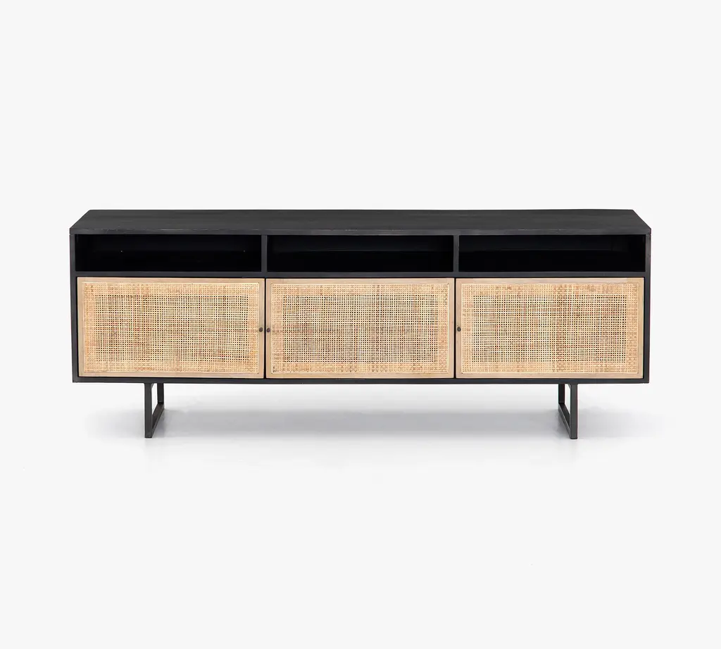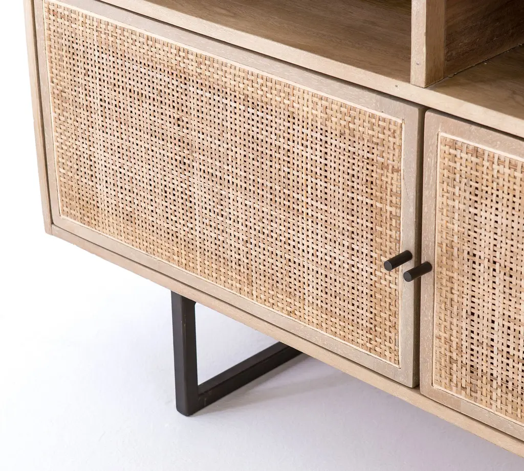 The cane work on the Dolores Collection is expertly woven by hand for an organic texture that beautifully balances the sleek, airy profile of each piece. Resting on a sturdy iron frame in a contrasting Gunmetal finish, the media console is an elegant addition to a room.