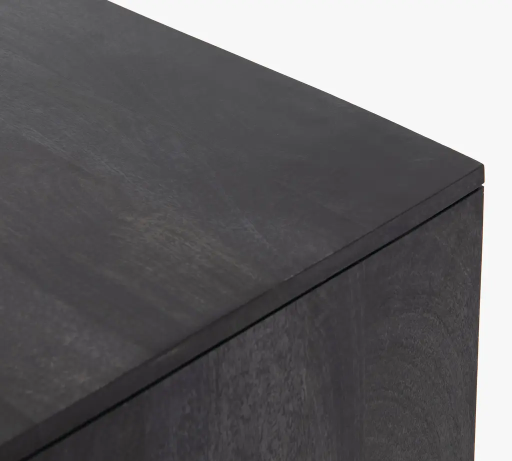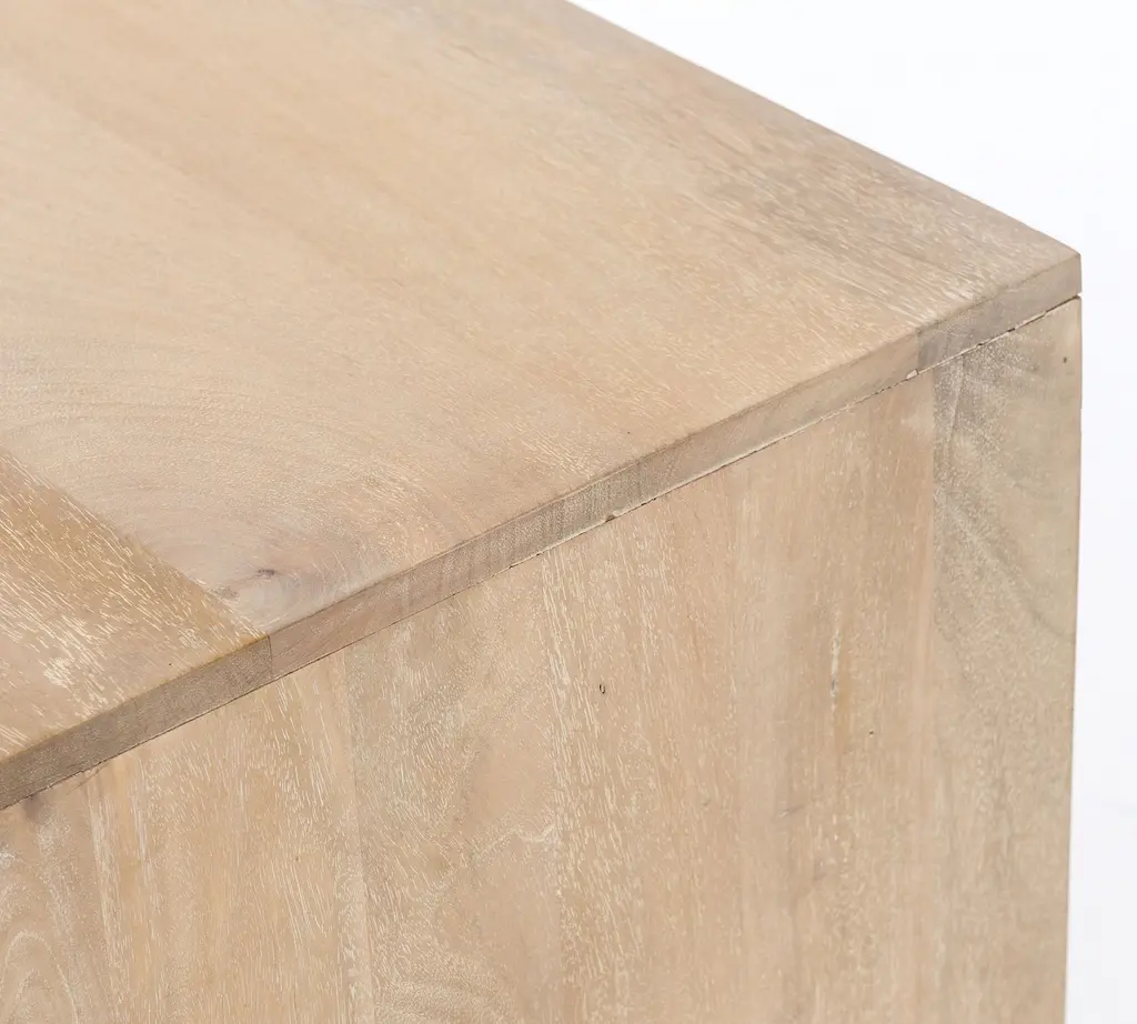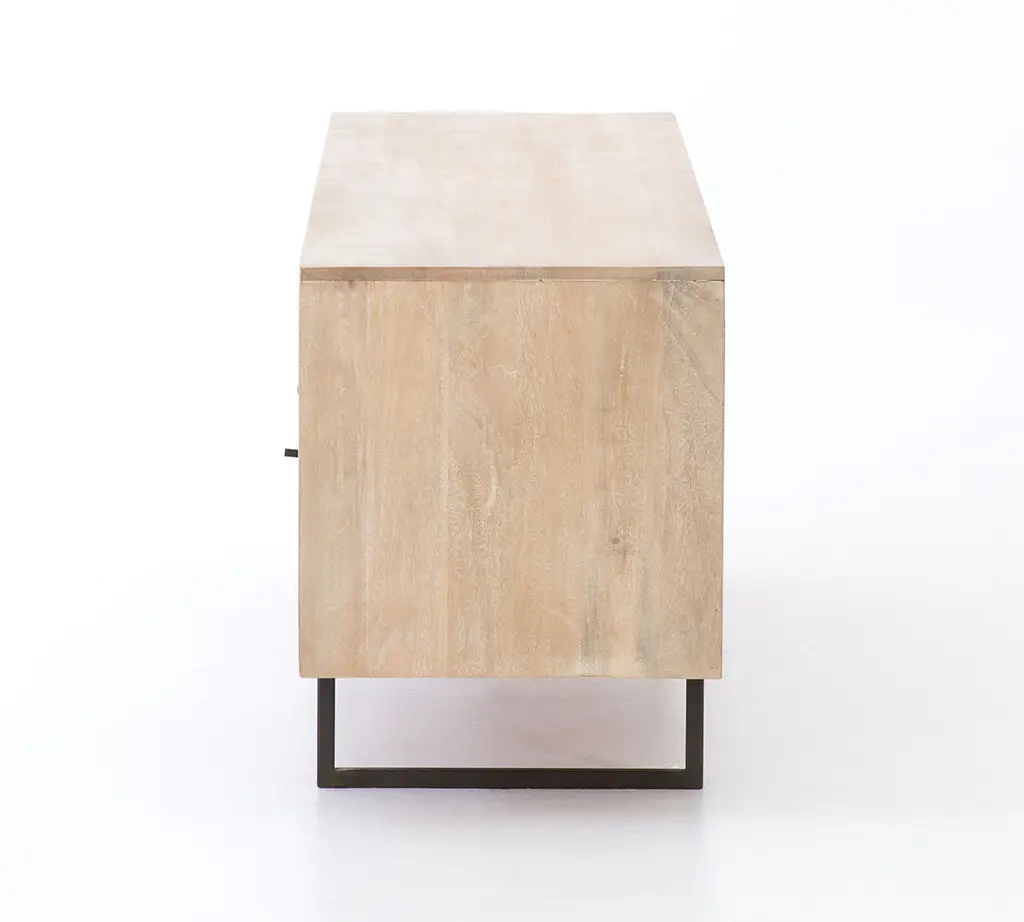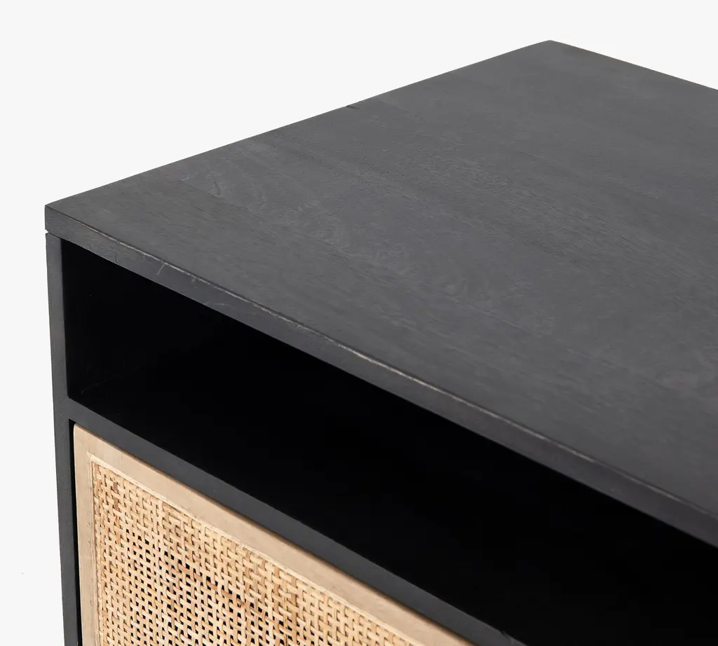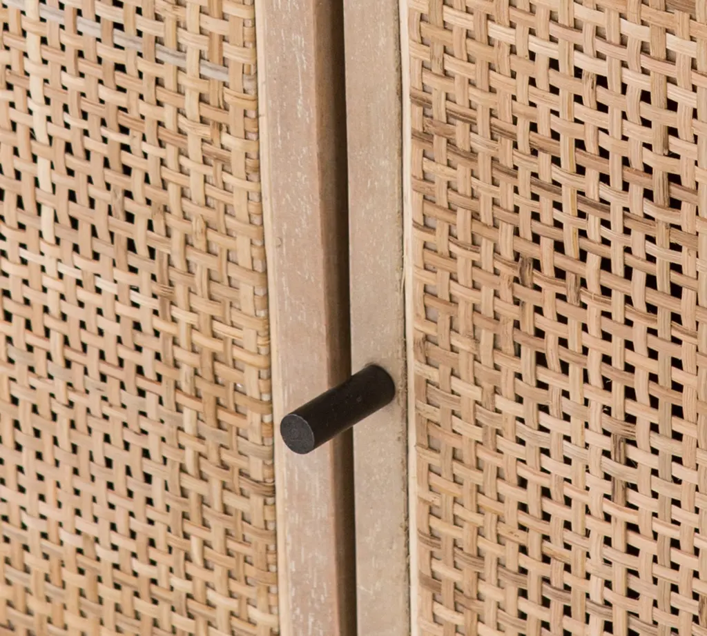 The cane work on the Dolores Collection is expertly woven by hand for an organic texture that beautifully balances the sleek, airy profile of each piece. Resting on a sturdy iron frame in a contrasting Gunmetal finish, the media console is an elegant addition to a room.