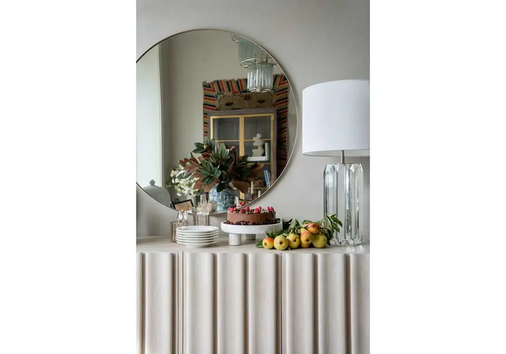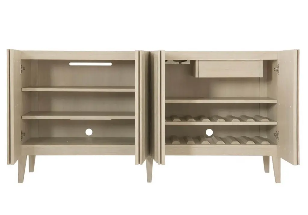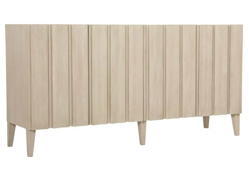 This console features clean lines with its ample size and dimensional vertical lines. Slightly tapered legs provide an additional touch of sophistication, creating a balanced, tasteful piece. Its four-door design opens to reveal substantial storage, effortlessly stowing electronics and cords. Display in a living room or entryway for a tasteful, attractive style.
