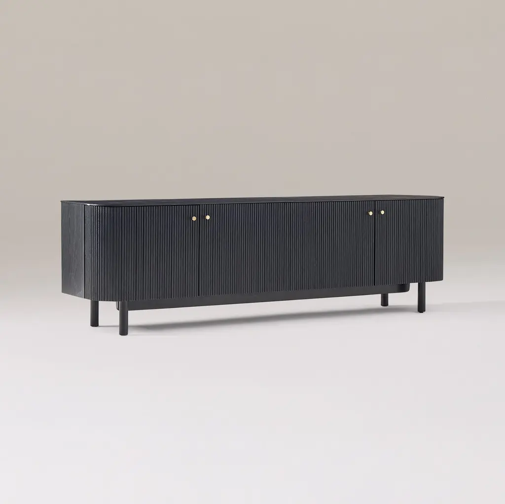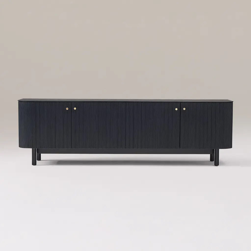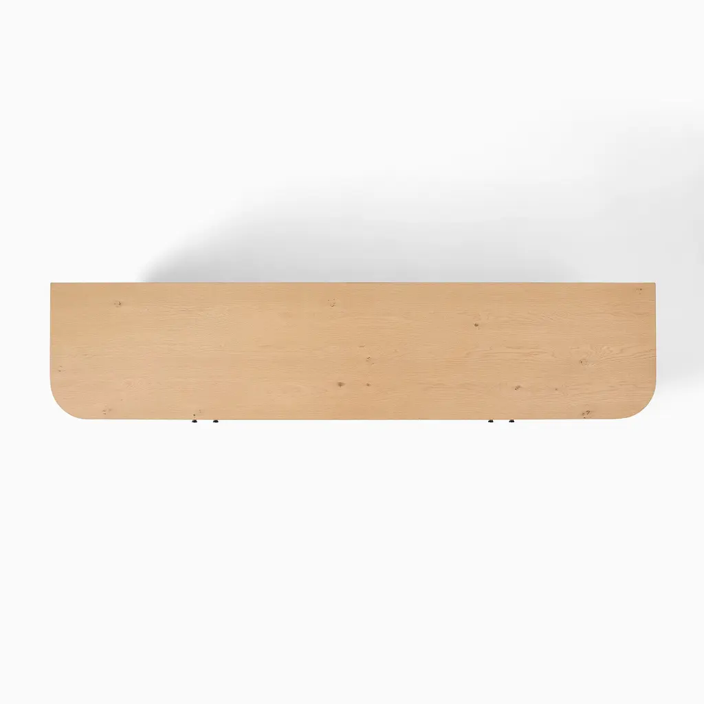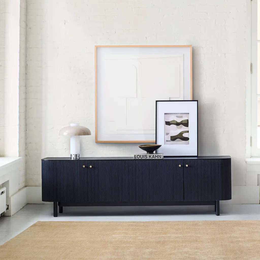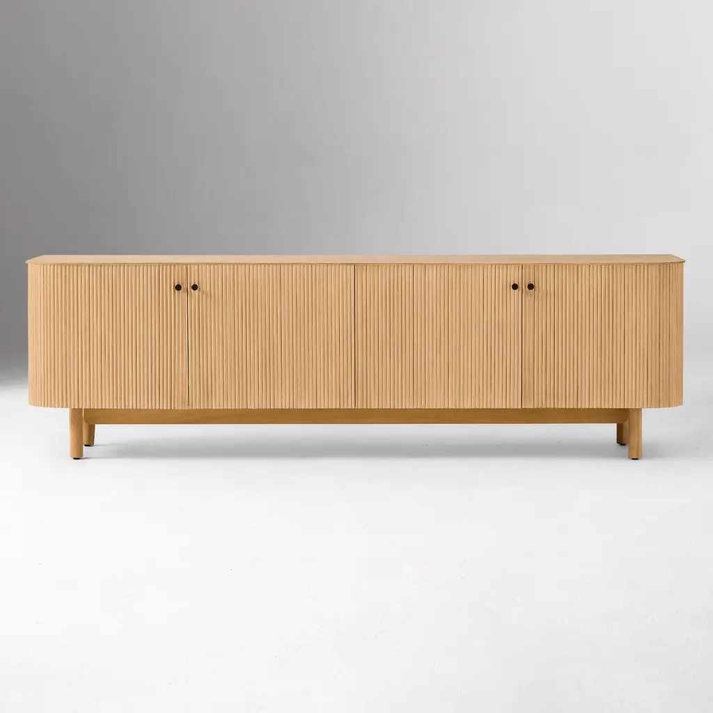 Rounded corners accentuate the fluted front. Elegant cylindrical legs keep it lofted off the floor. Sustainably sourced and Fair Trade Certified™. Contract Grade, so you know it's built to last.