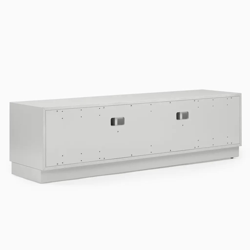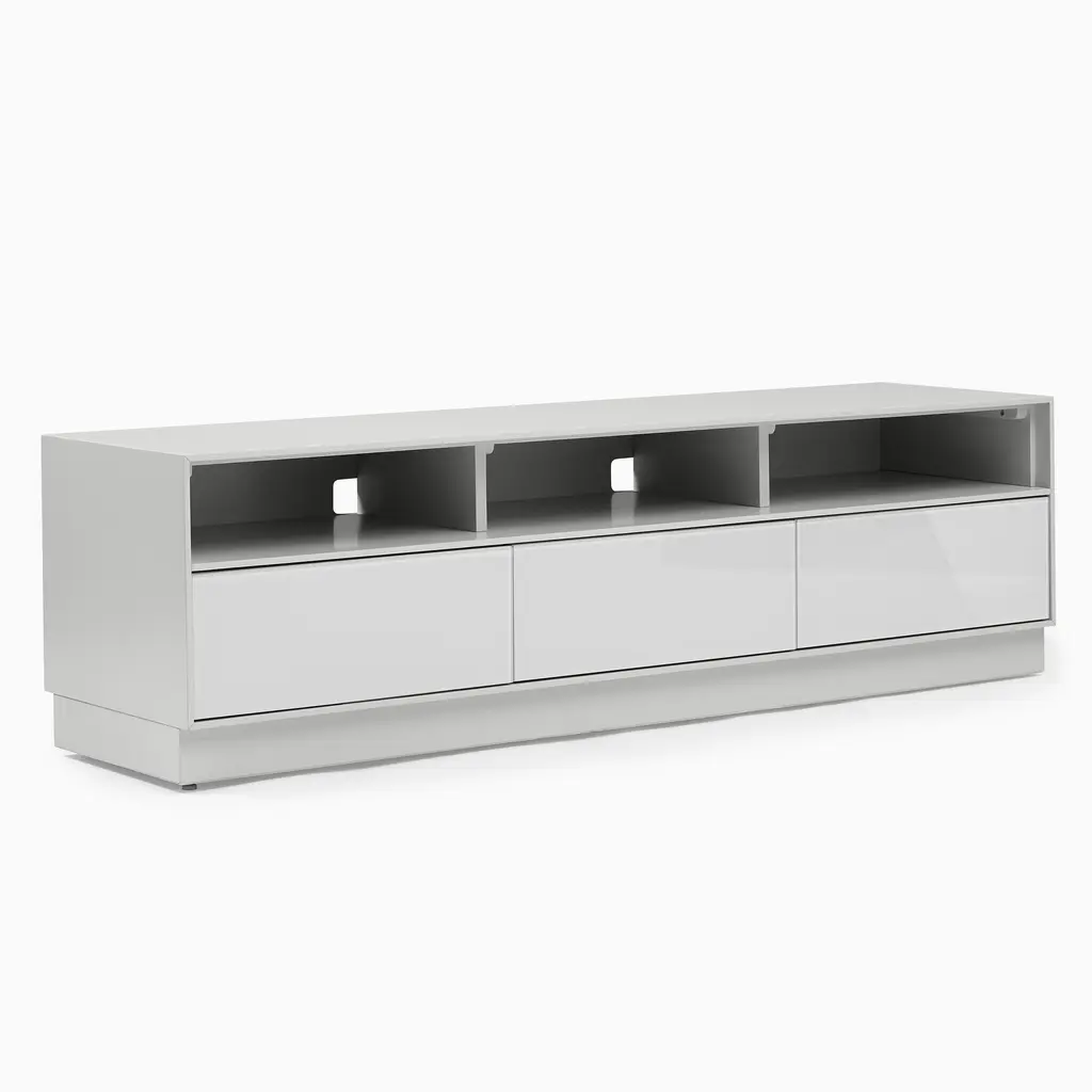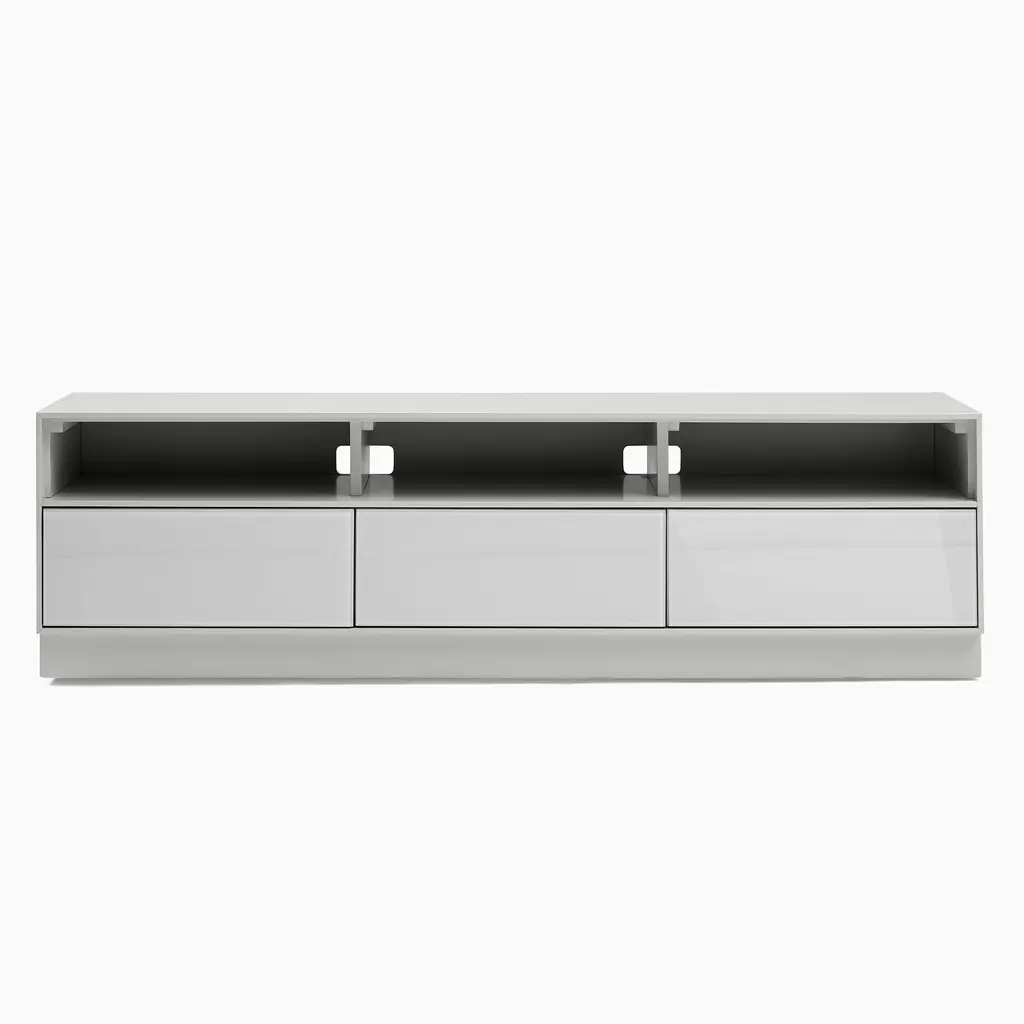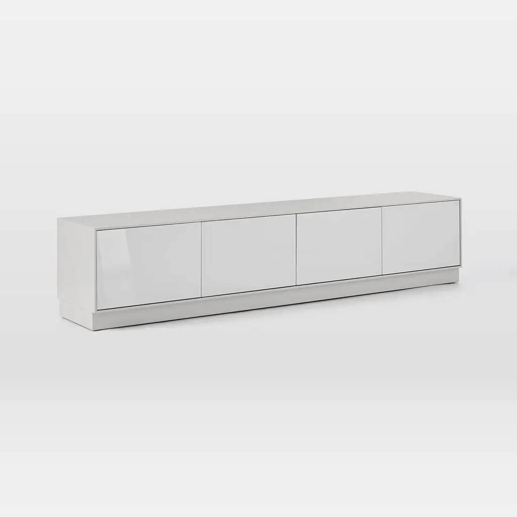 Striking in its simplicity, our Emilia Media Console's clean-lined shape is enhanced by a glossy lacquer finish, a back-painted glass facade and push-to-open doors or drawers that reveal plenty of room for books, routers and more.