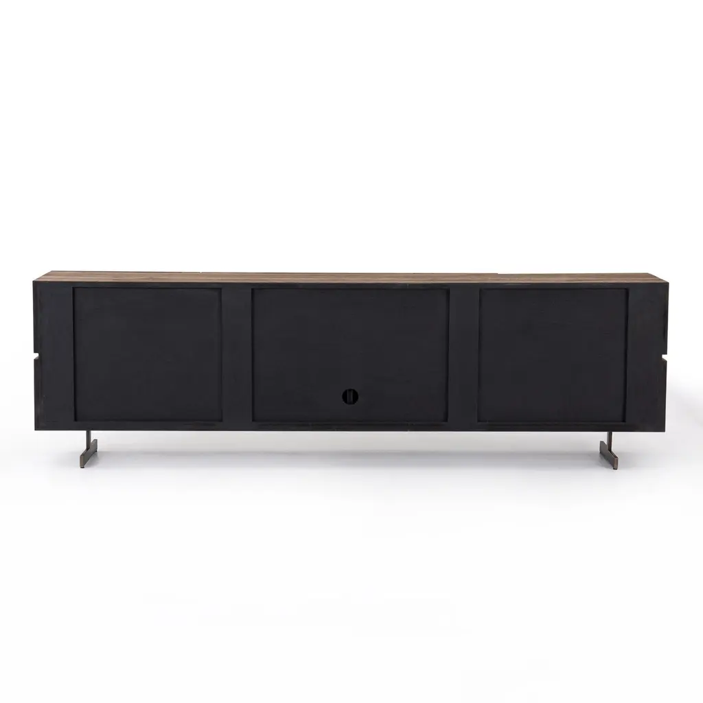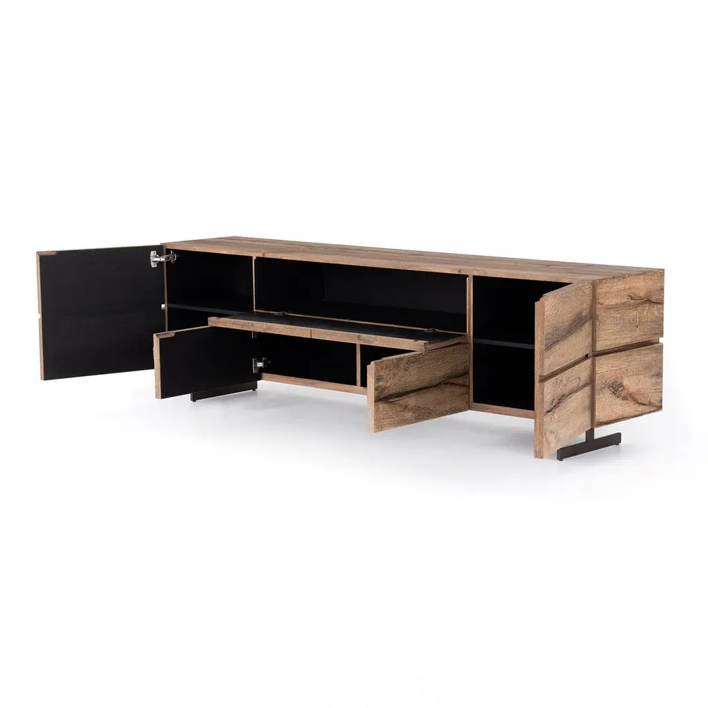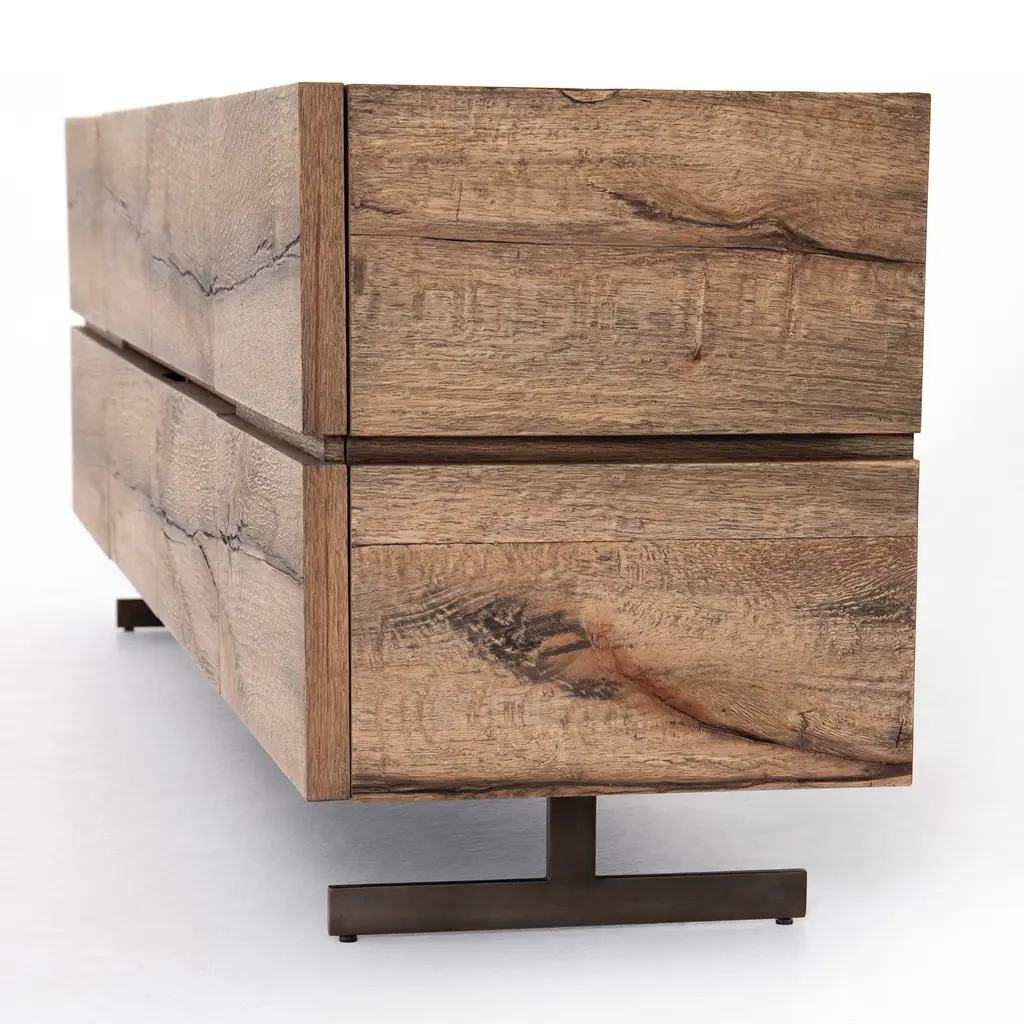 Made from reclaimed oak with modern iron legs, a stately, clean-lined console features horizontal recessing for a look of lightness with movement. Traditional door plus drop-down storage add a forward-thinking finishing touch. Rear cutouts for media cord management.
