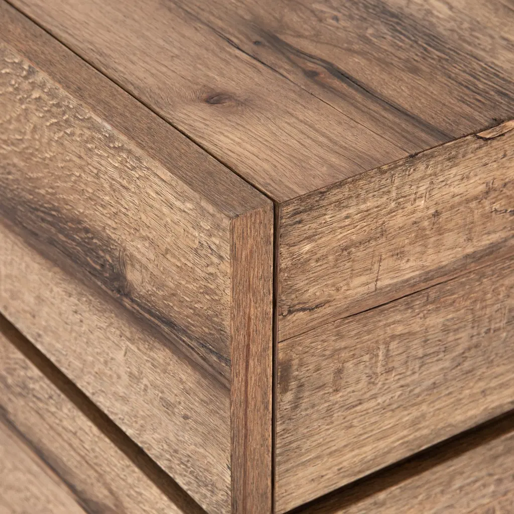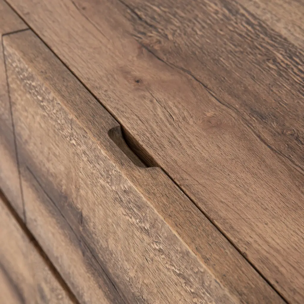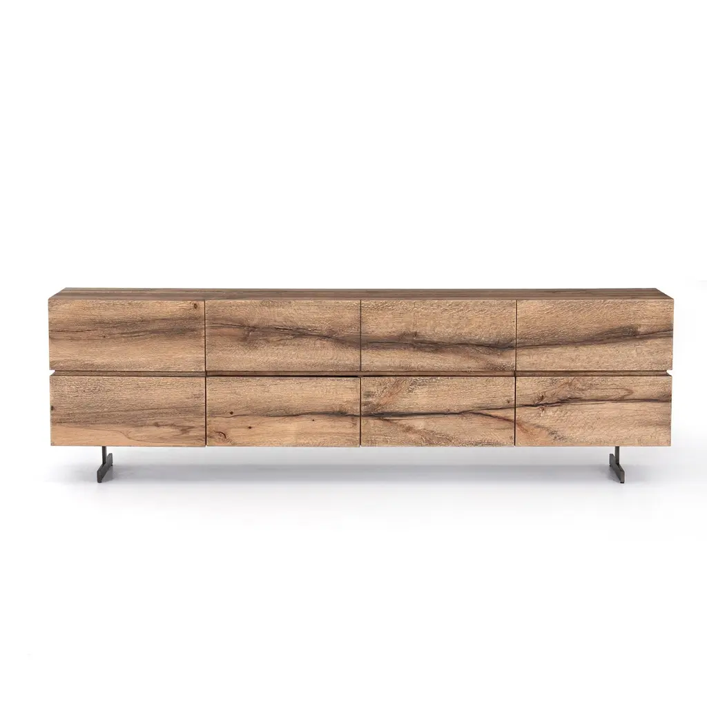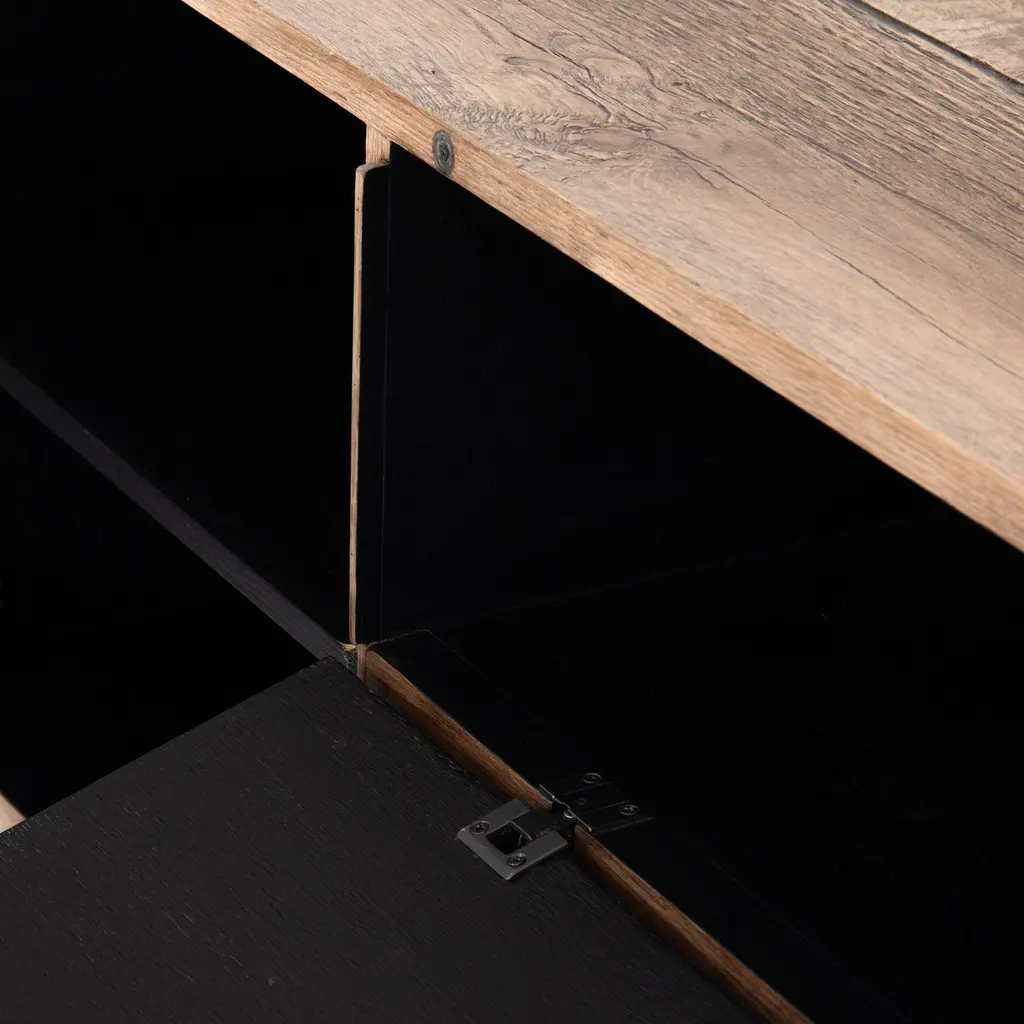 Made from reclaimed oak with modern iron legs, a stately, clean-lined console features horizontal recessing for a look of lightness with movement. Traditional door plus drop-down storage add a forward-thinking finishing touch. Rear cutouts for media cord management.