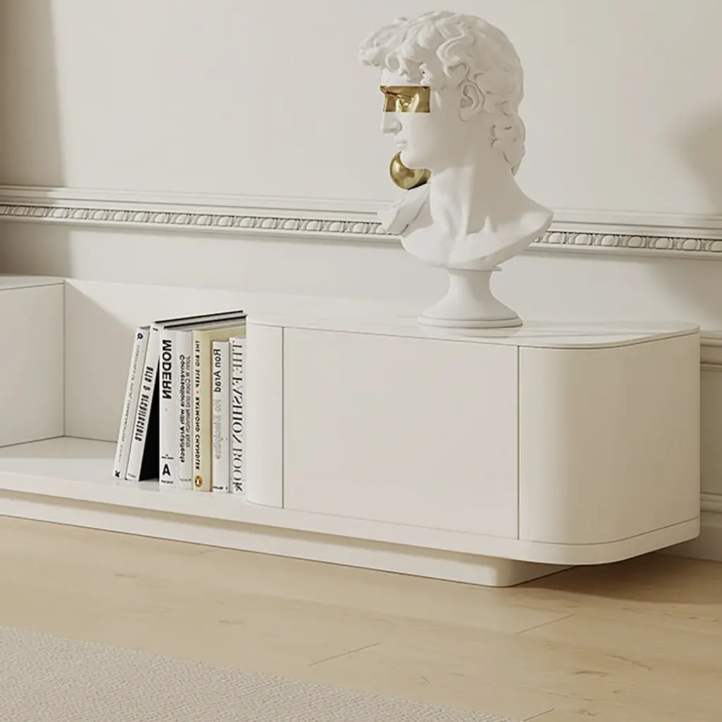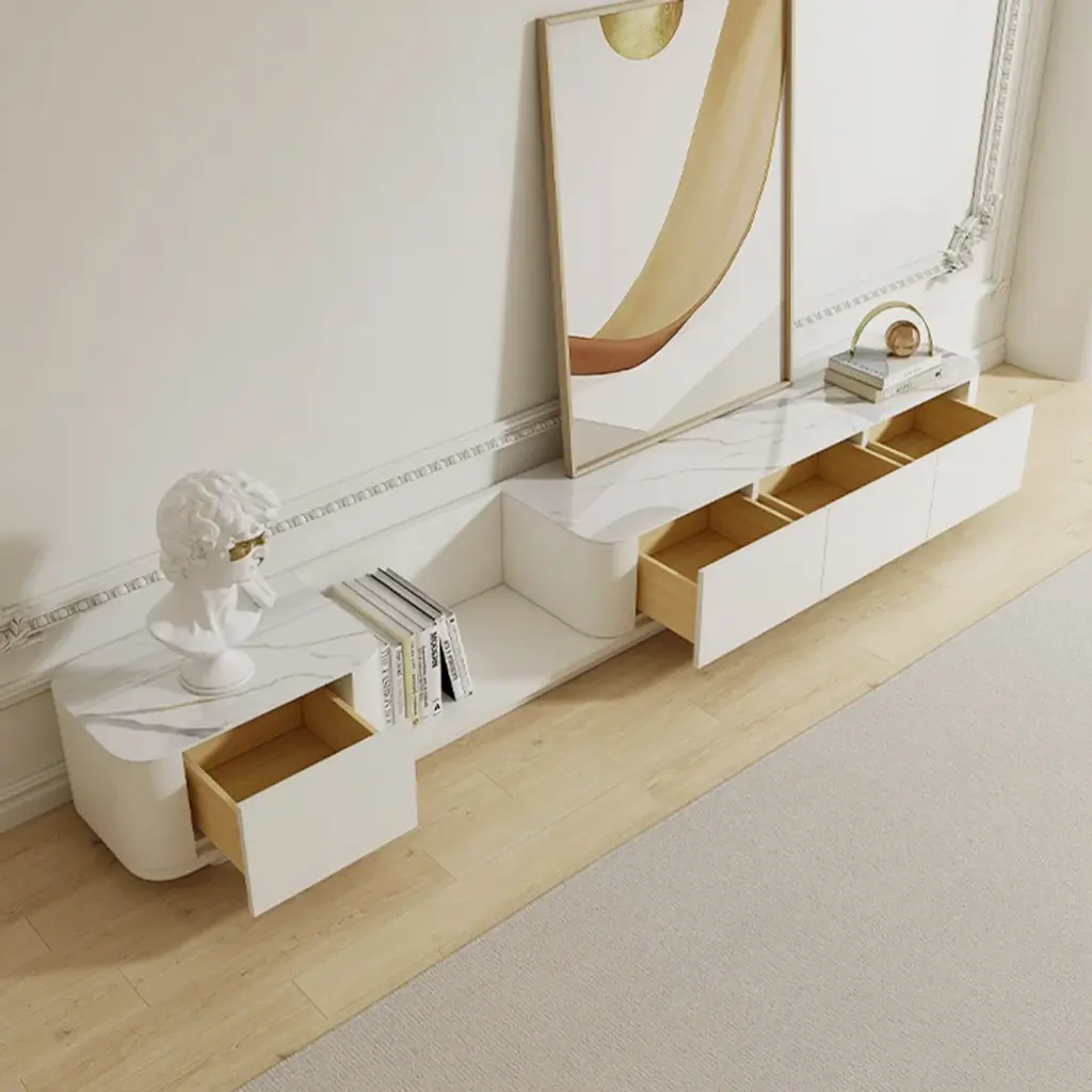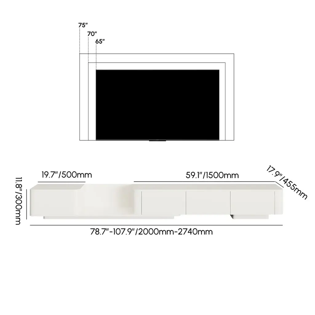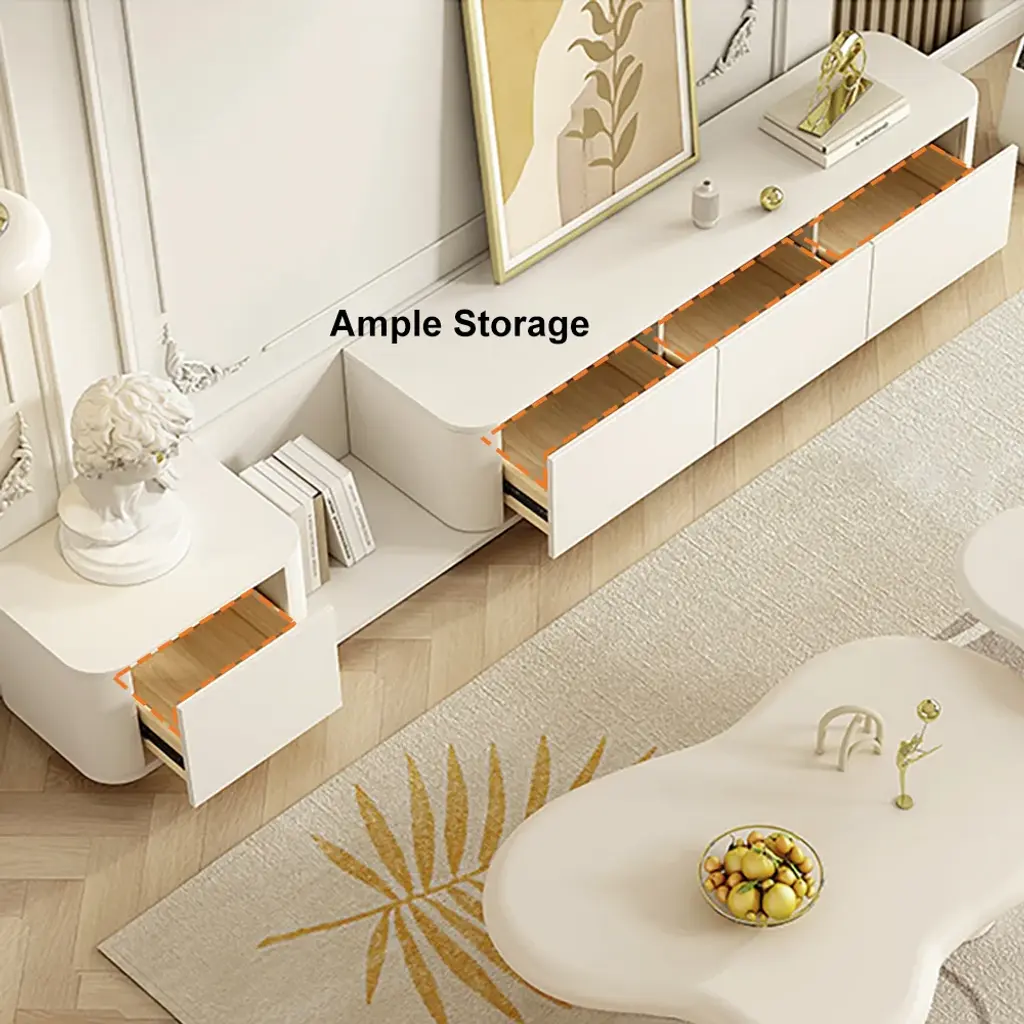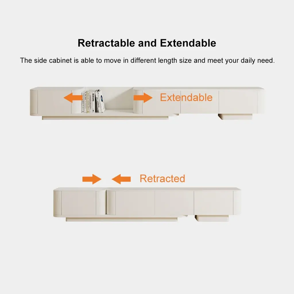 This extendable TV stand features a sleek design with a retracted and expandable function. The cream color creates a calming atmosphere, while four drawers and multiple sections provide organized storage. Made from high-quality engineered wood with a matte lacquer finish, it is durable and easy to maintain.
