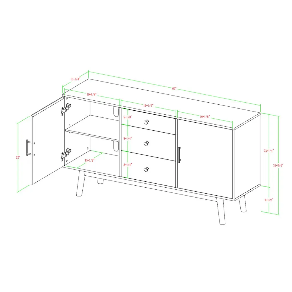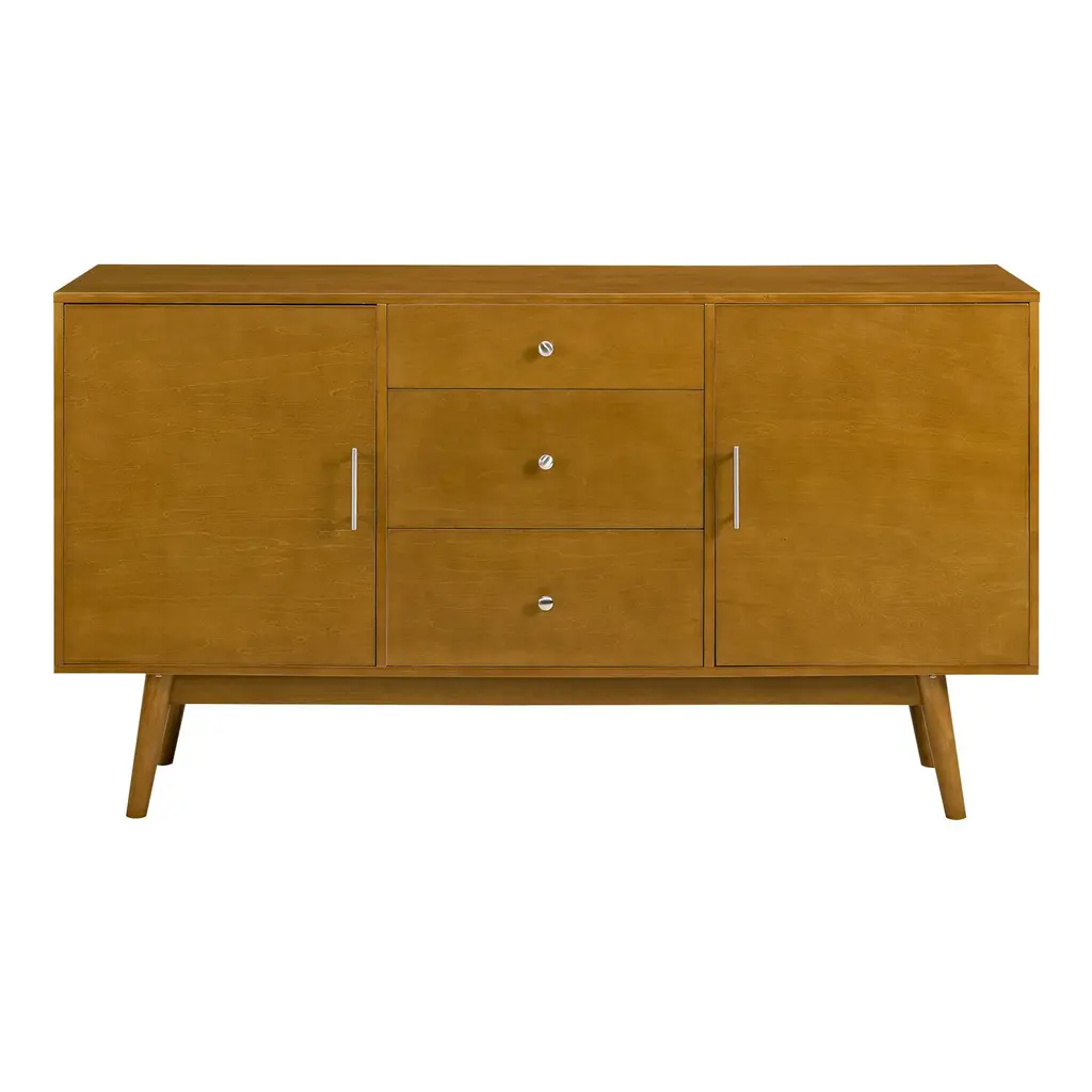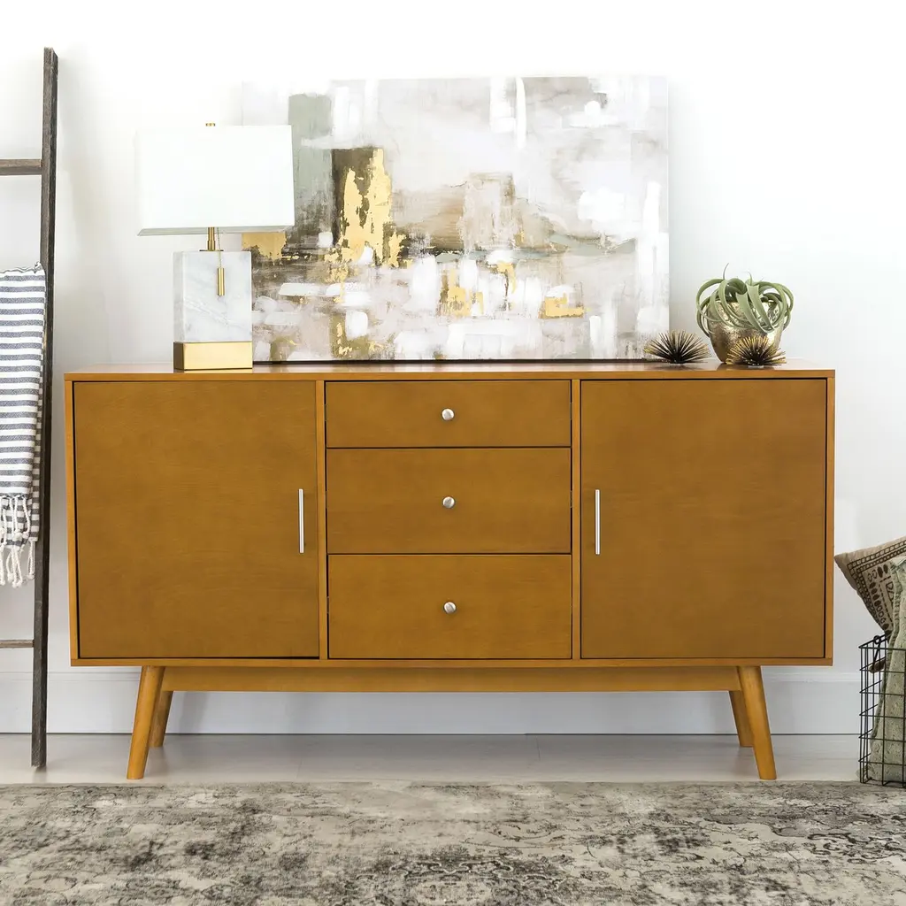 Our warm brown TV cabinet combines refined mid-century modern styling with the storage space a contemporary home media setup requires. Designed to hold a 60-inch flat-screen TV, it features two doors that open to reveal spacious, adjustable shelves, and three drawers for accessories, plus a cord management system.