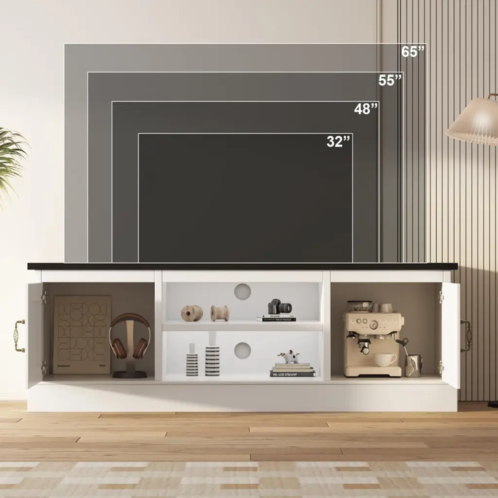 Enhance your living room or office with this charming Farmhouse TV Stand designed for 65-inch TVs. Featuring a distinctive wood grain finish paired with sleek metal accents and handles, this entertainment center blends rustic charm with modern elegance. Its 21.7-inch height is perfectly suited to support your TV while elevating the room's aesthetic.