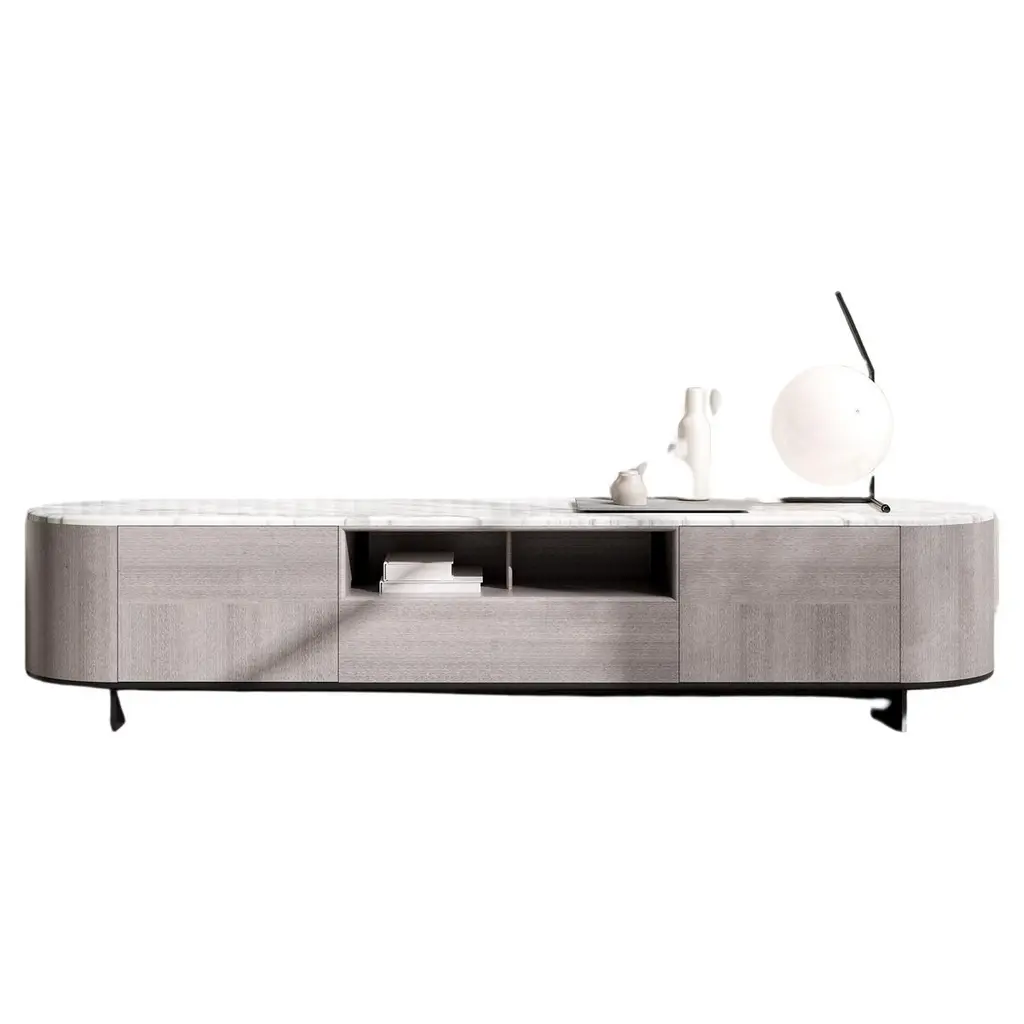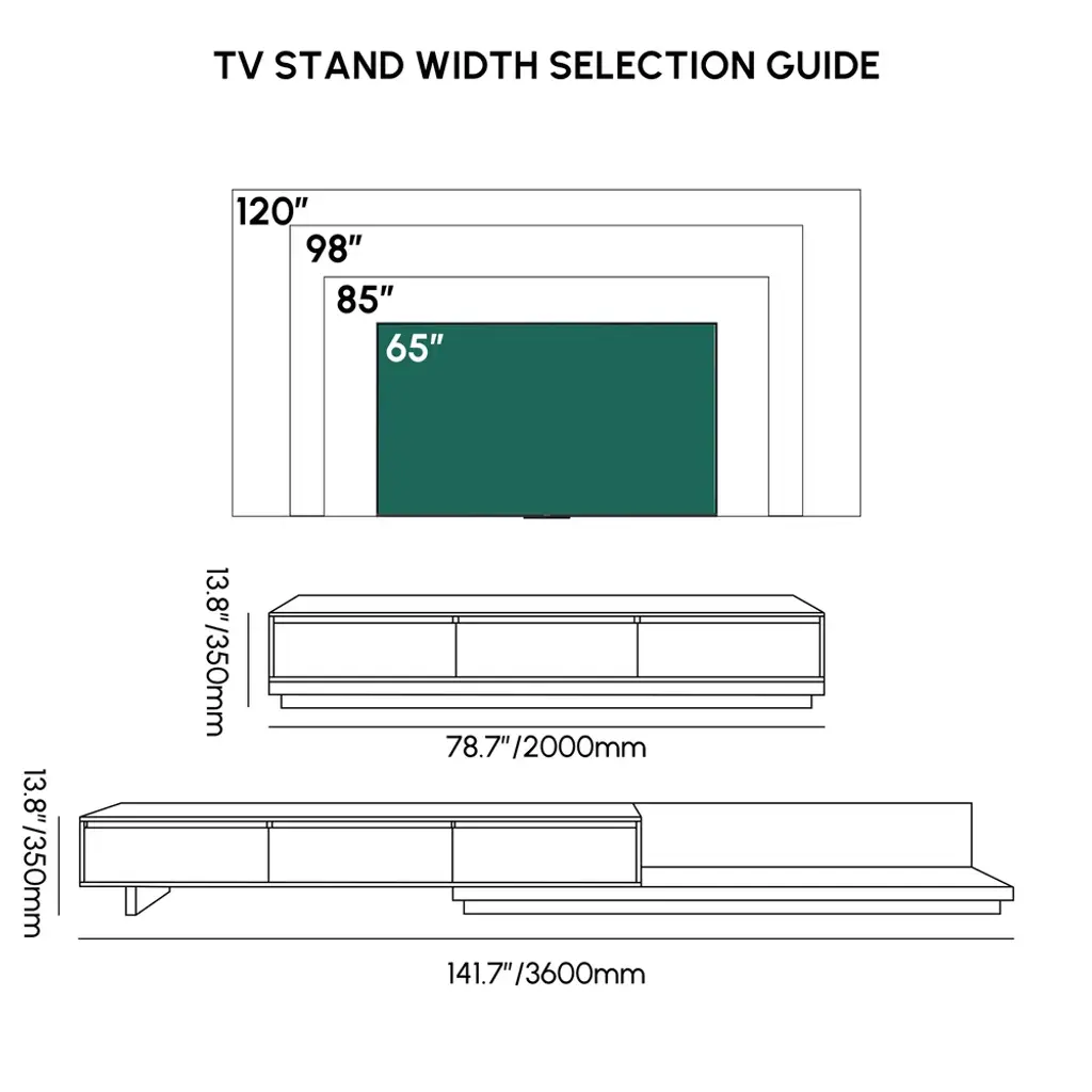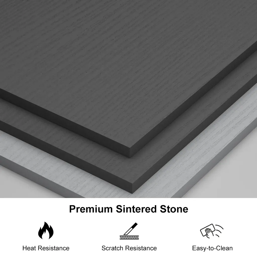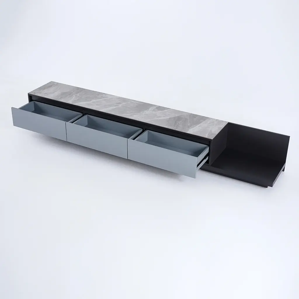 Fero console now features premium sintered stone – heatproof, scratch-resistant, and stunning marble-like finish. Extends 78.7"-141.7" for 120" screens with three silent drawers. Luxury meets resilience.