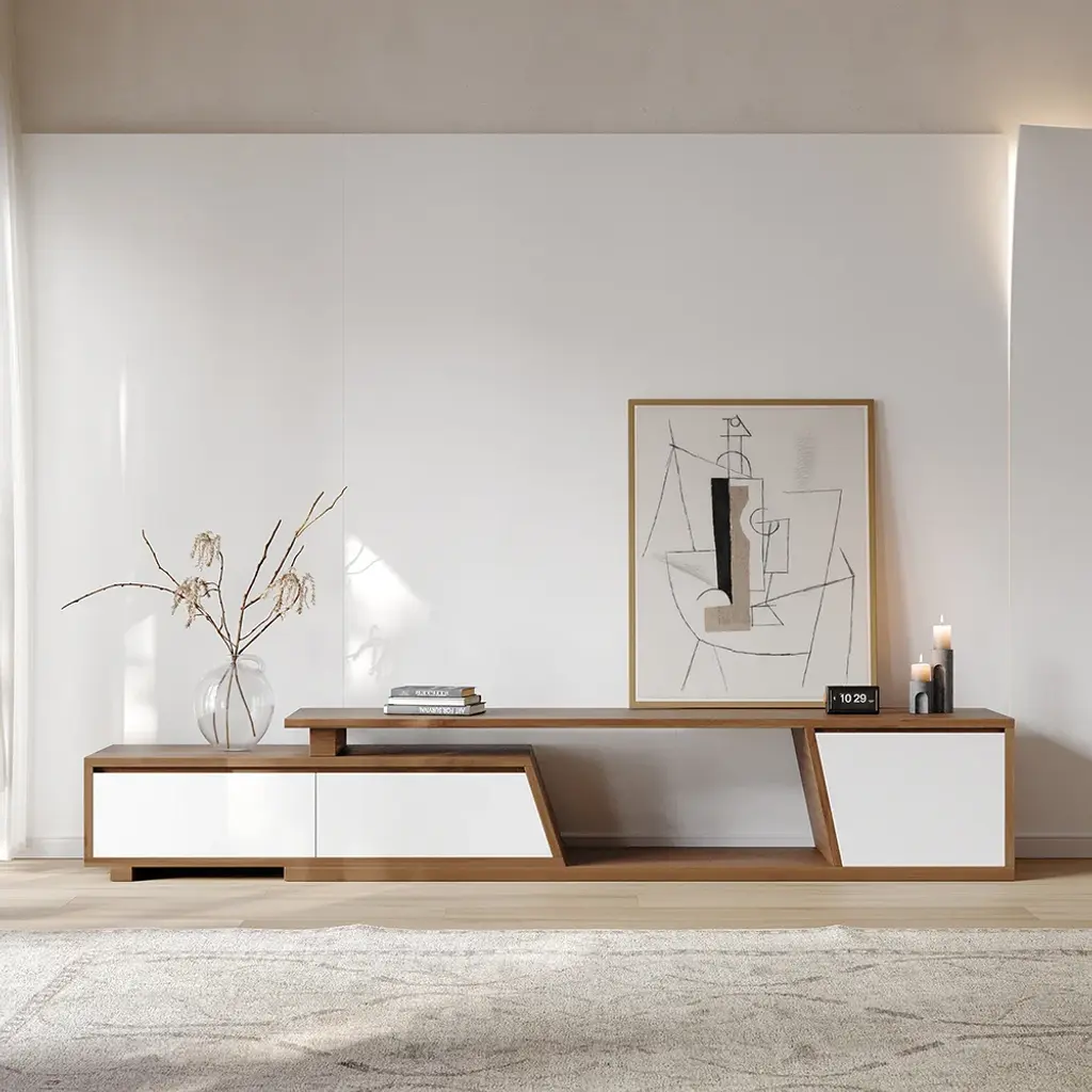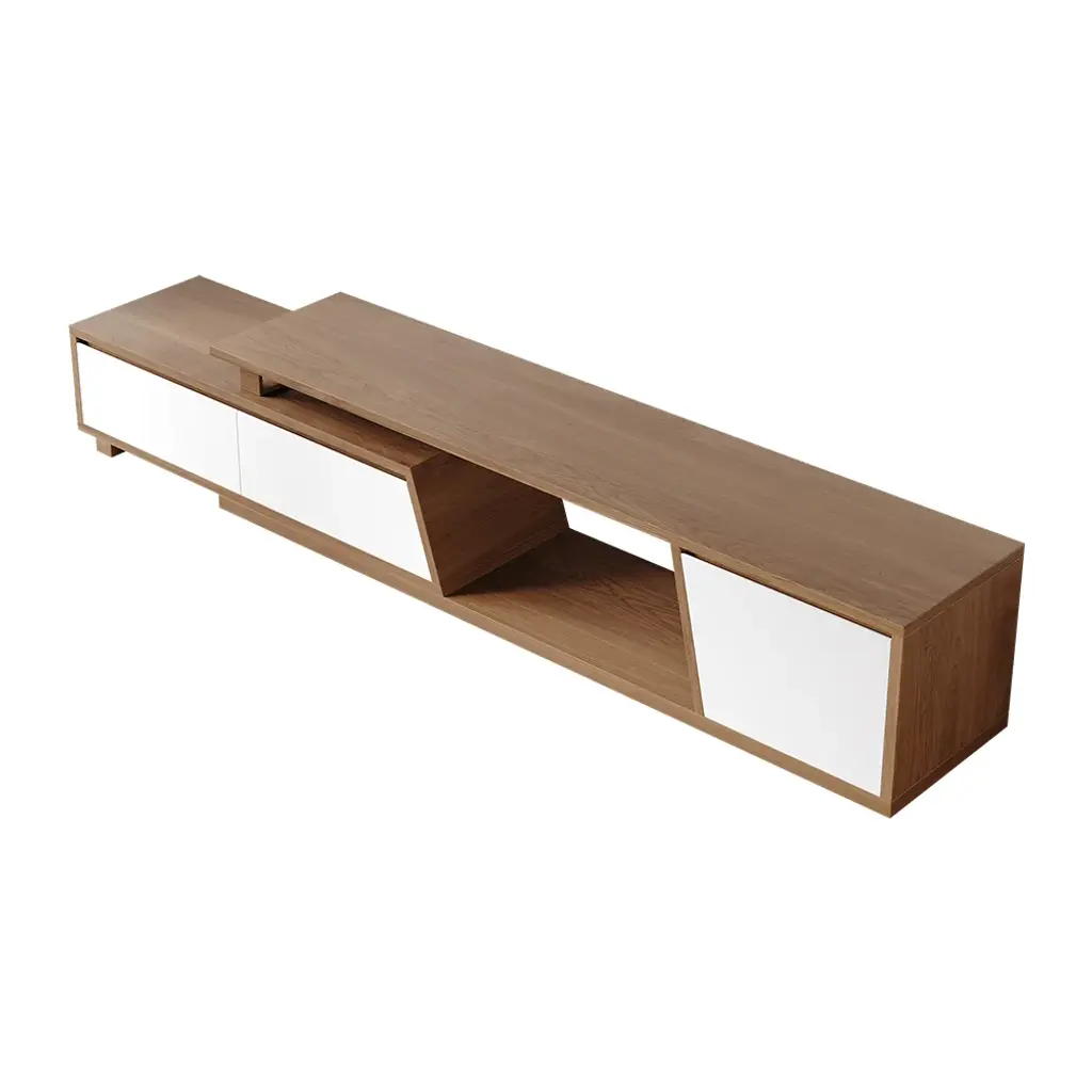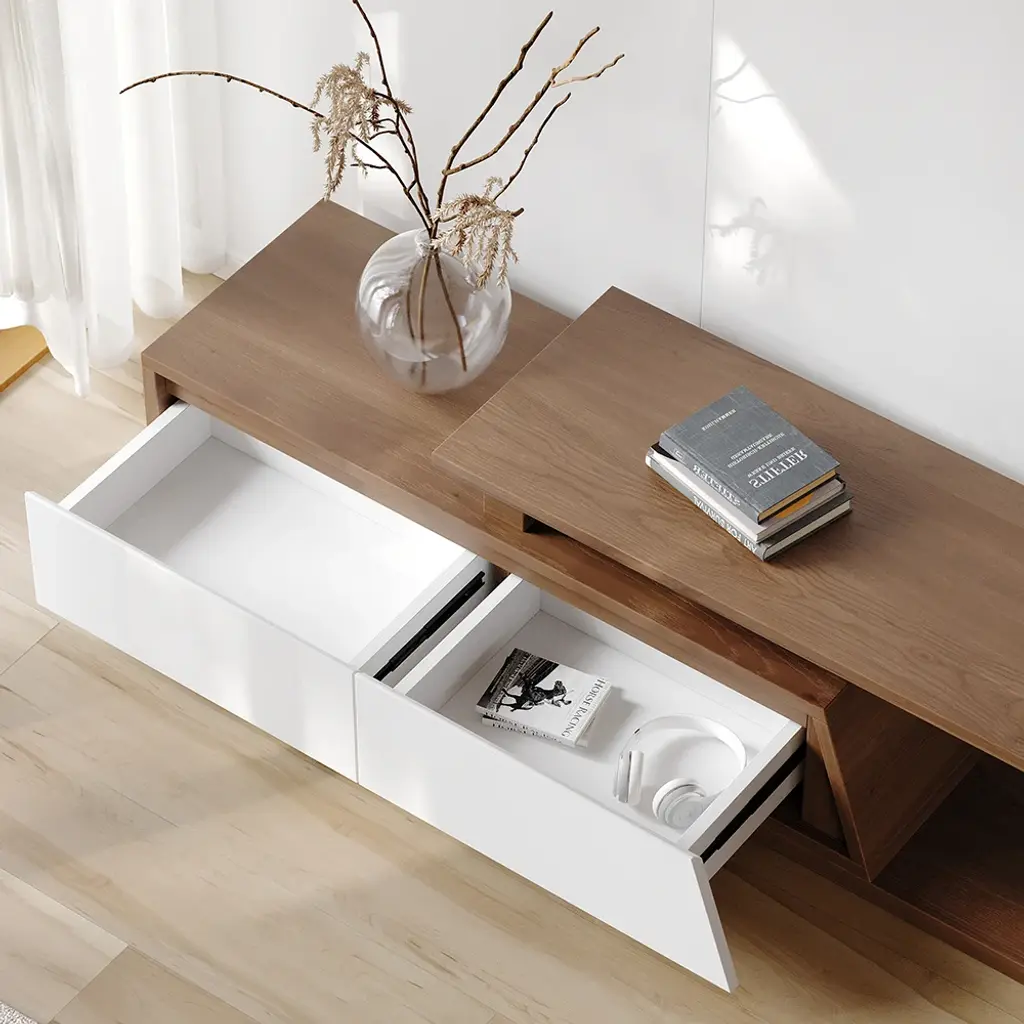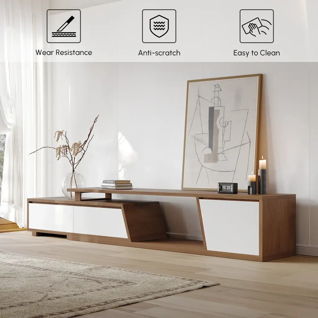 Fero TV stand features an extendable design and three spacious drawers, designed to complement TVs up to 120 inches in size. The extendable function provides great flexibility to fit various room layouts. This TV stand offers stylish decoration and practical storage options for contemporary living rooms. Note: The central storage area is not suitable for items weighing more than 22 lbs (10 kg).