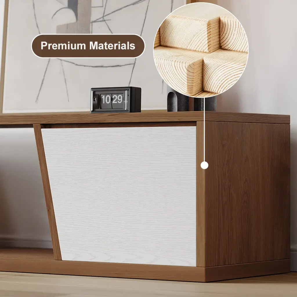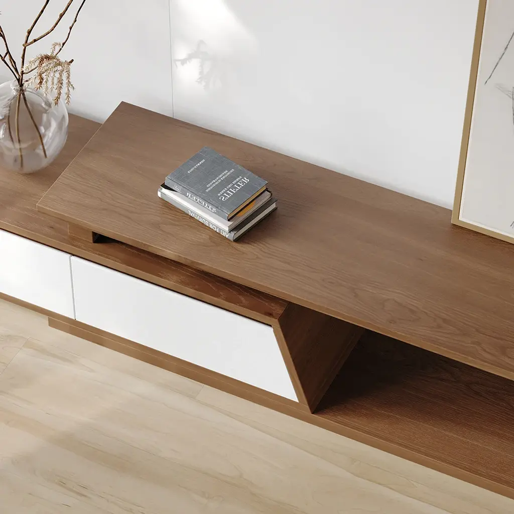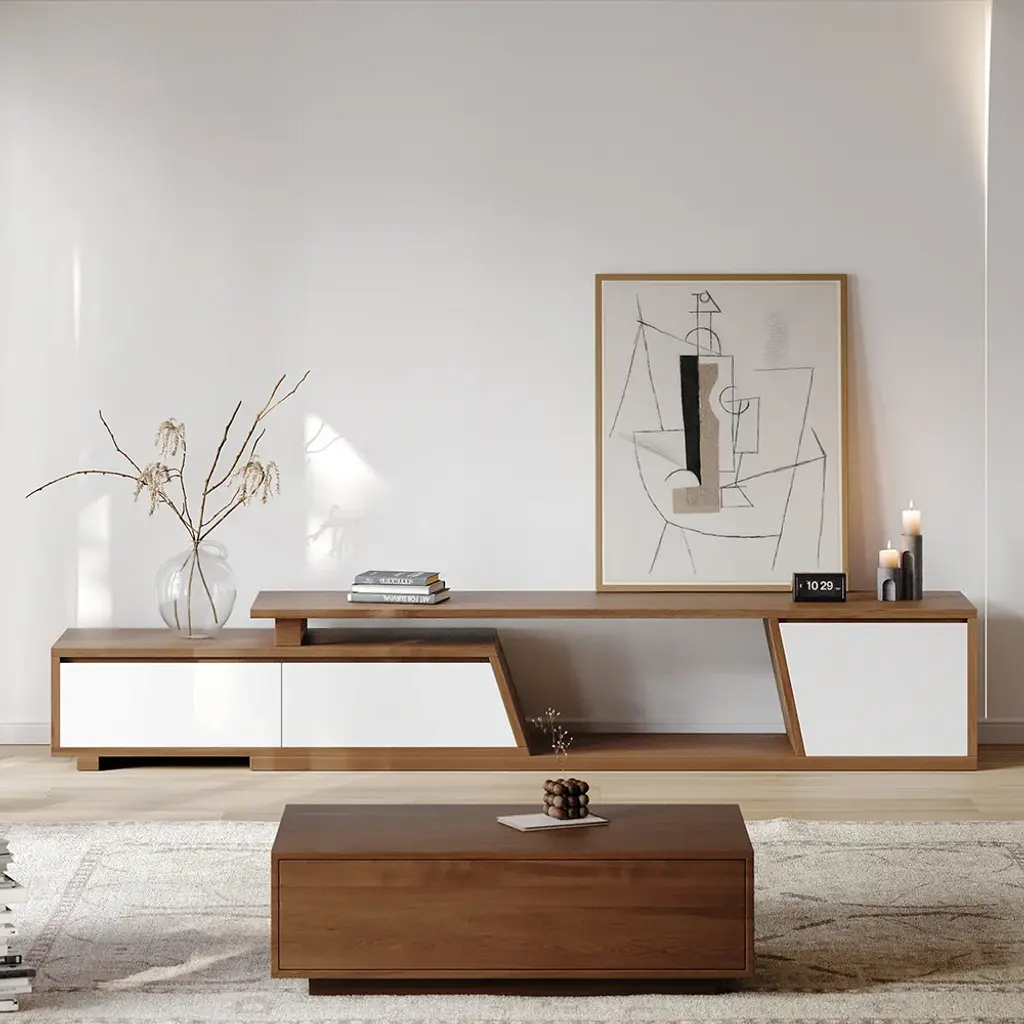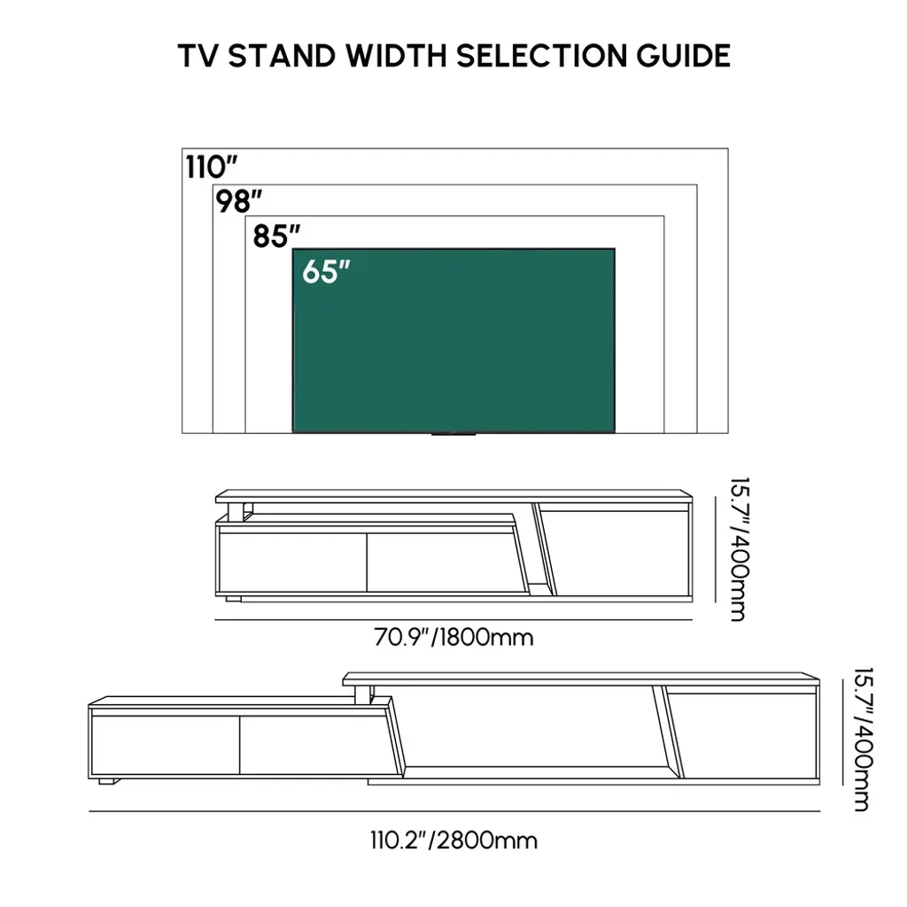 Fero TV stand features an extendable design and three spacious drawers, designed to complement TVs up to 120 inches in size. The extendable function provides great flexibility to fit various room layouts. This TV stand offers stylish decoration and practical storage options for contemporary living rooms. Note: The central storage area is not suitable for items weighing more than 22 lbs (10 kg).