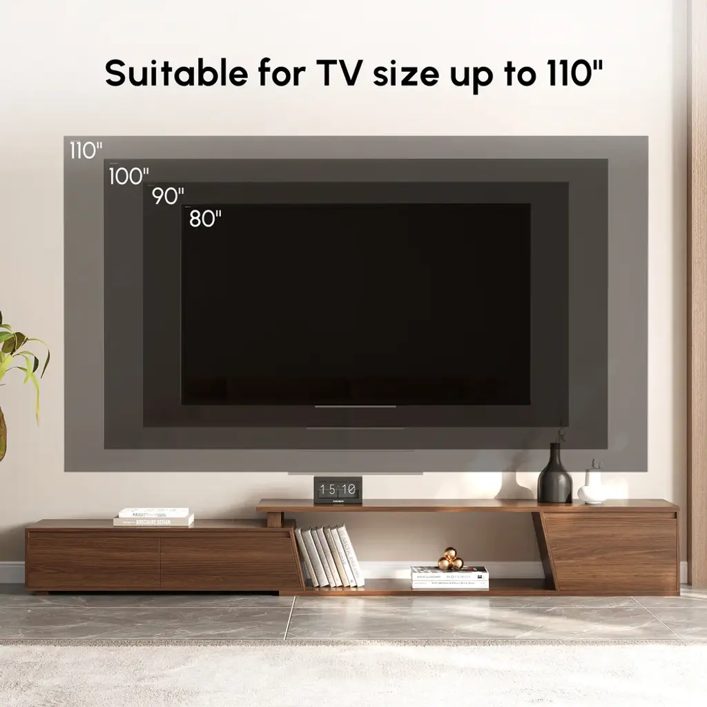 Fero TV stand features an extendable design and three spacious drawers, designed to complement TVs up to 120 inches in size. The extendable function provides great flexibility to fit various room layouts. This TV stand offers stylish decoration and practical storage options for contemporary living rooms. Note: The central storage area is not suitable for items weighing more than 22 lbs (10 kg).