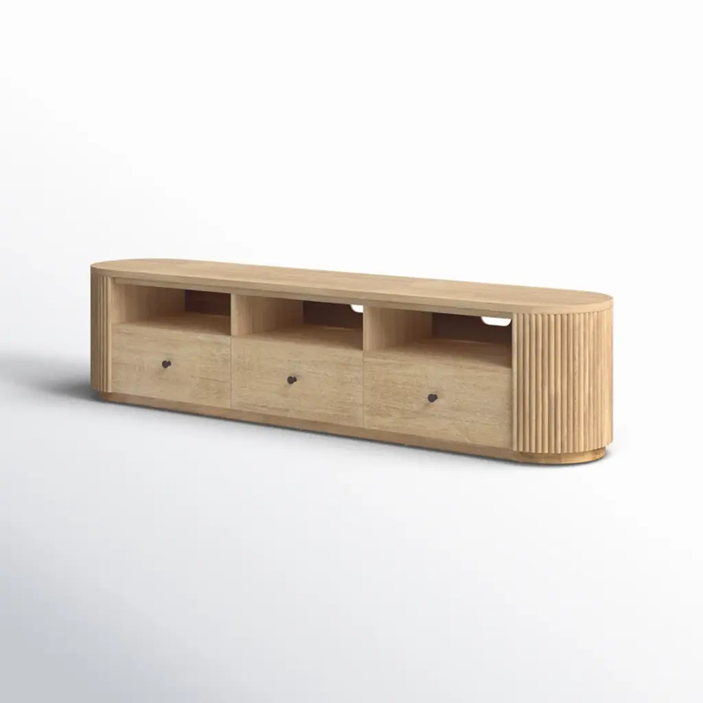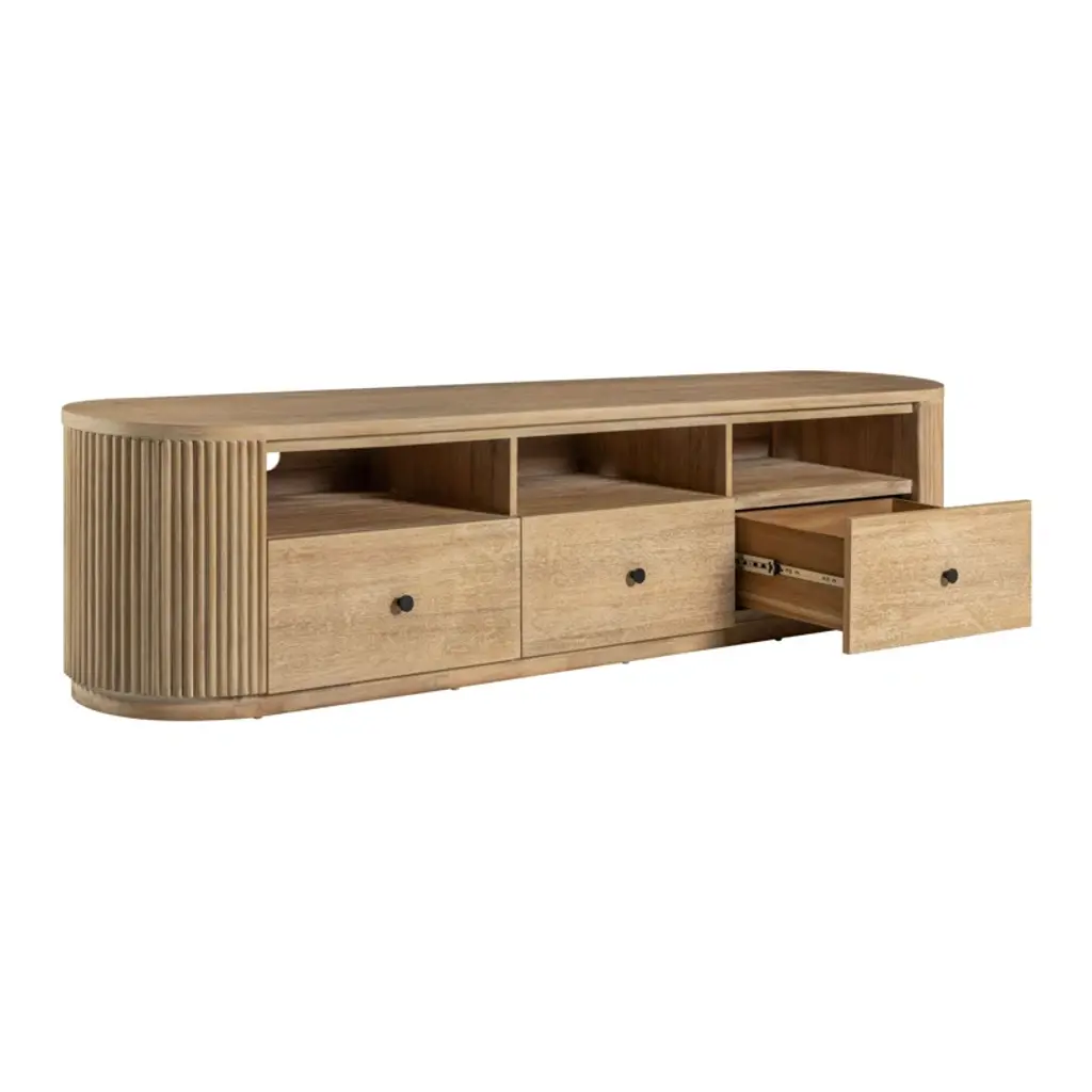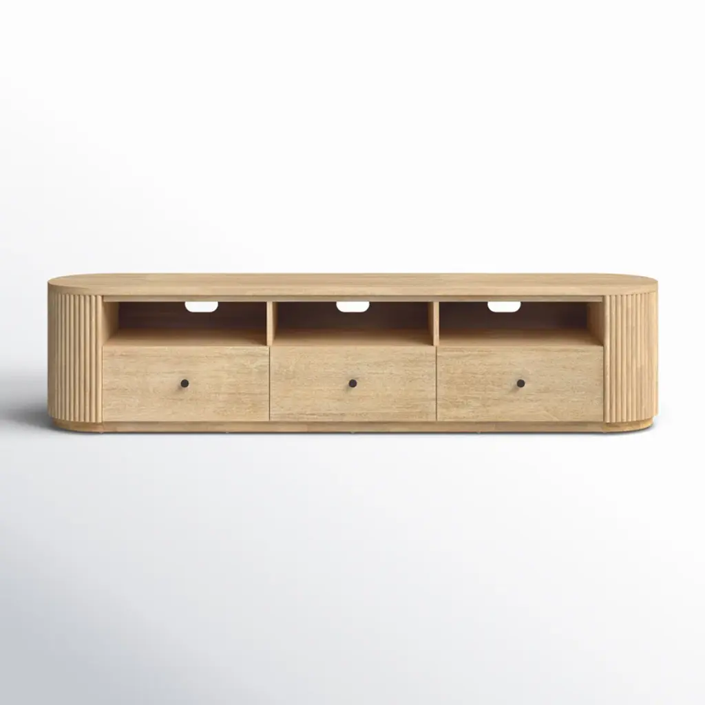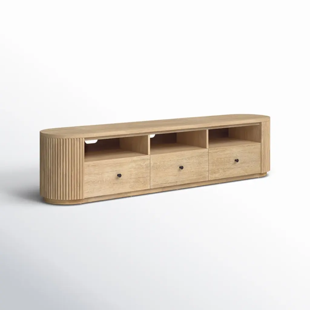 The Jacobson TV Stand exudes a modern charm with its natural acacia wood finish. Featuring a stylish, elongated design, it includes three spacious drawers and three open compartments, perfect for organizing media devices and accessories. The subtly curved edges and ribbed sides add a touch of elegance, making it a striking centerpiece for any contemporary living space. The balanced combination of functionality and aesthetic appeal truly elevates the decor of your home entertainment area.