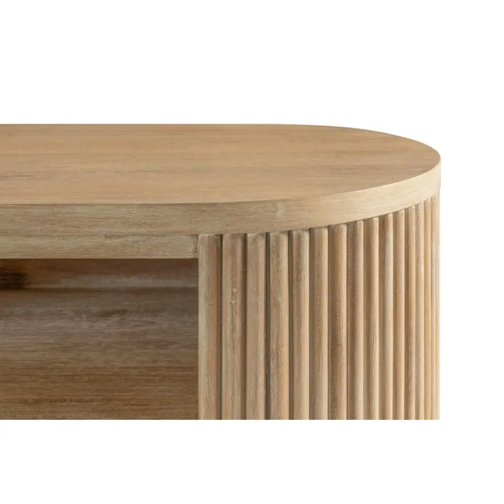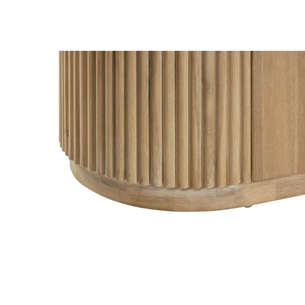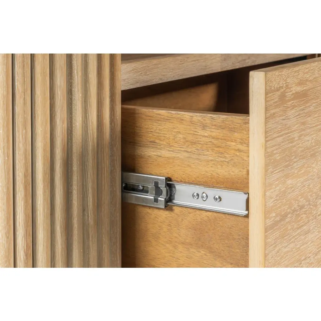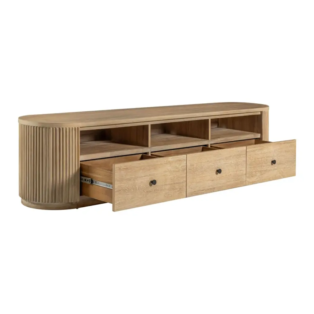 The Jacobson TV Stand exudes a modern charm with its natural acacia wood finish. Featuring a stylish, elongated design, it includes three spacious drawers and three open compartments, perfect for organizing media devices and accessories. The subtly curved edges and ribbed sides add a touch of elegance, making it a striking centerpiece for any contemporary living space. The balanced combination of functionality and aesthetic appeal truly elevates the decor of your home entertainment area.