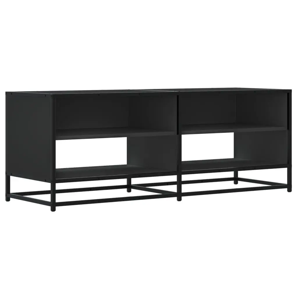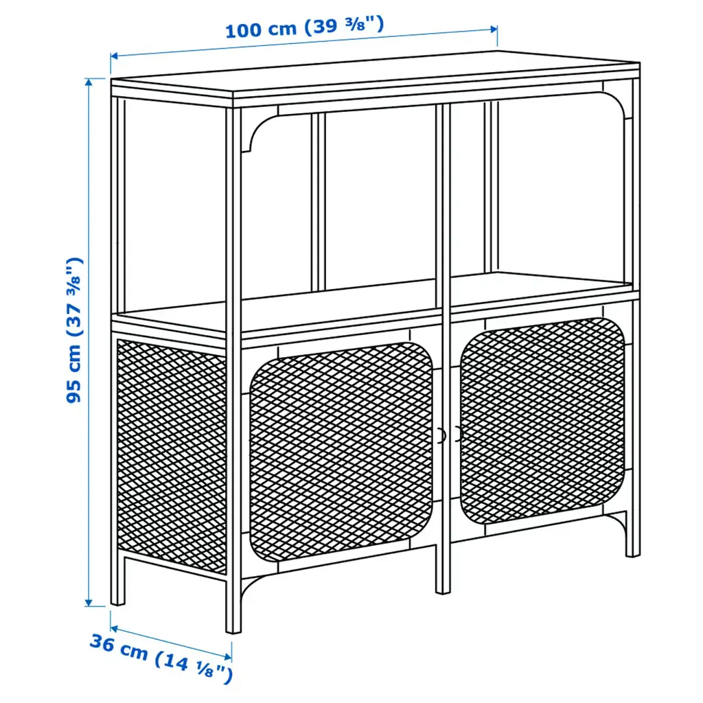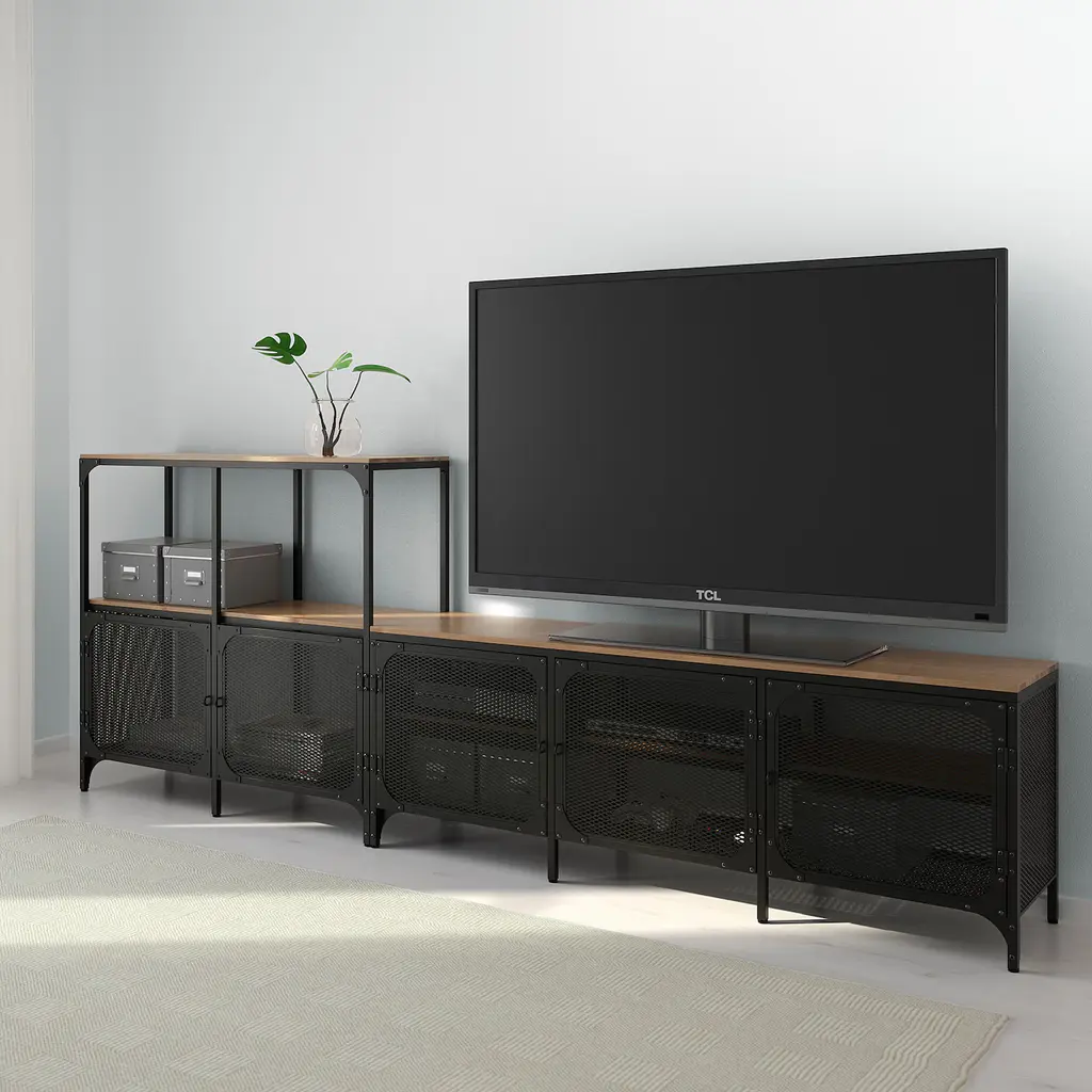 FJÄLLBO TV storage combination - black 98 3/8x14 1/8x37 3/8 ". This rustic metal and solid wood shelf has an open back, so it’s easy to arrange cords and access power outlets. The storage unit stands steady on uneven floors since it has adjustable feet.