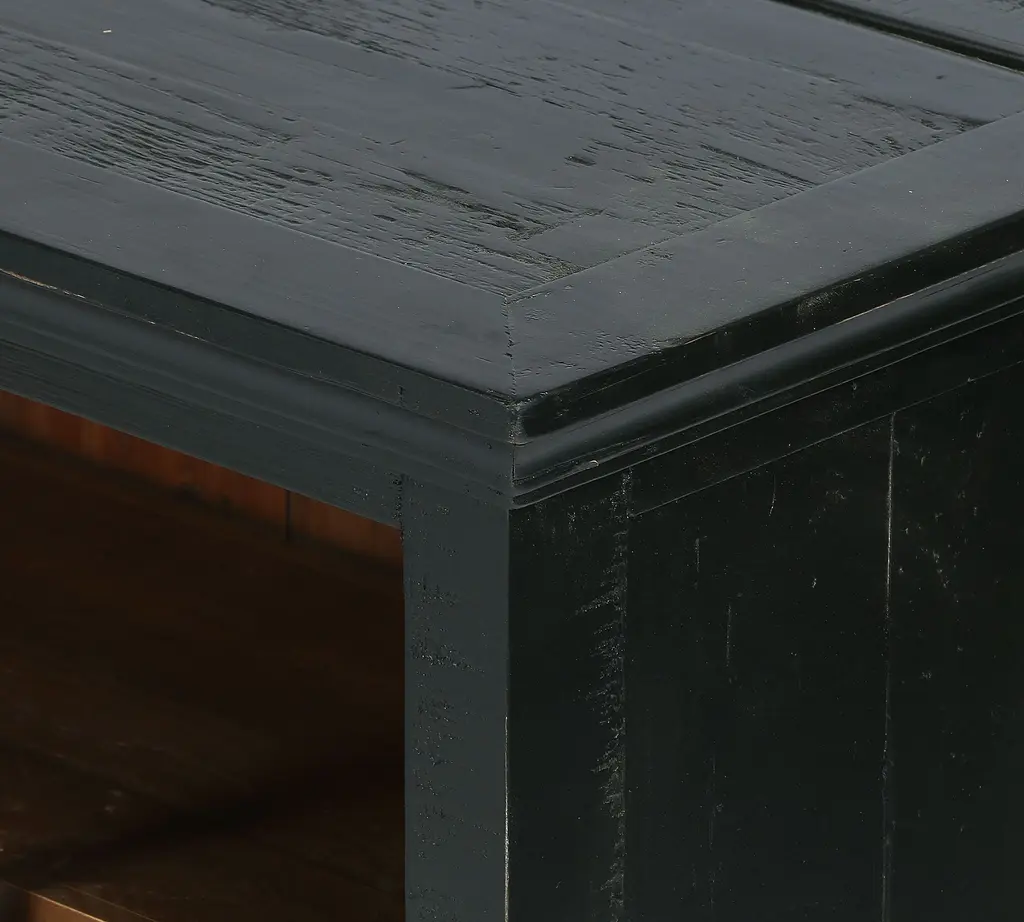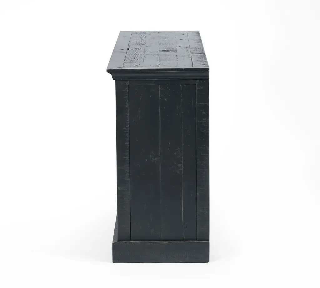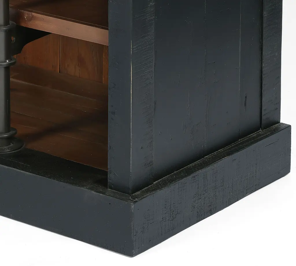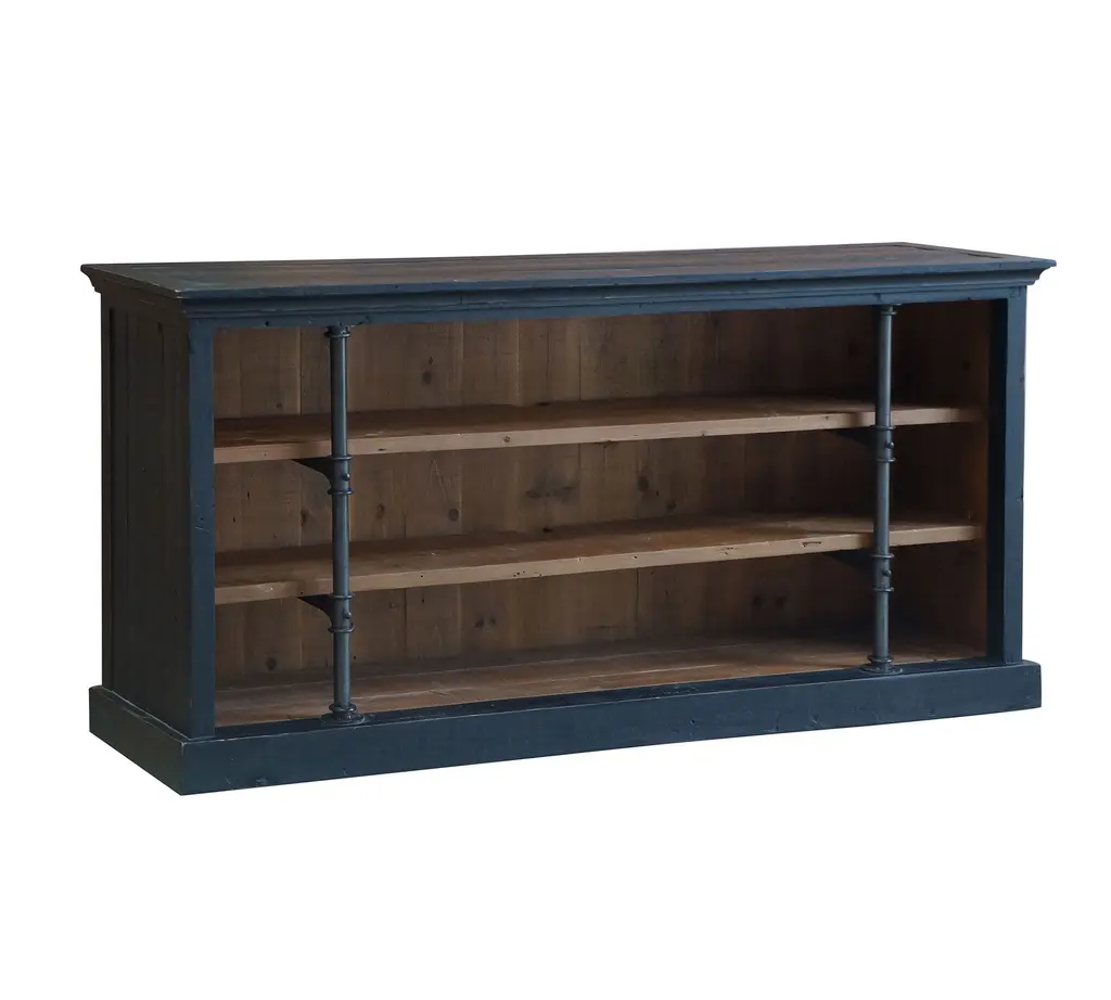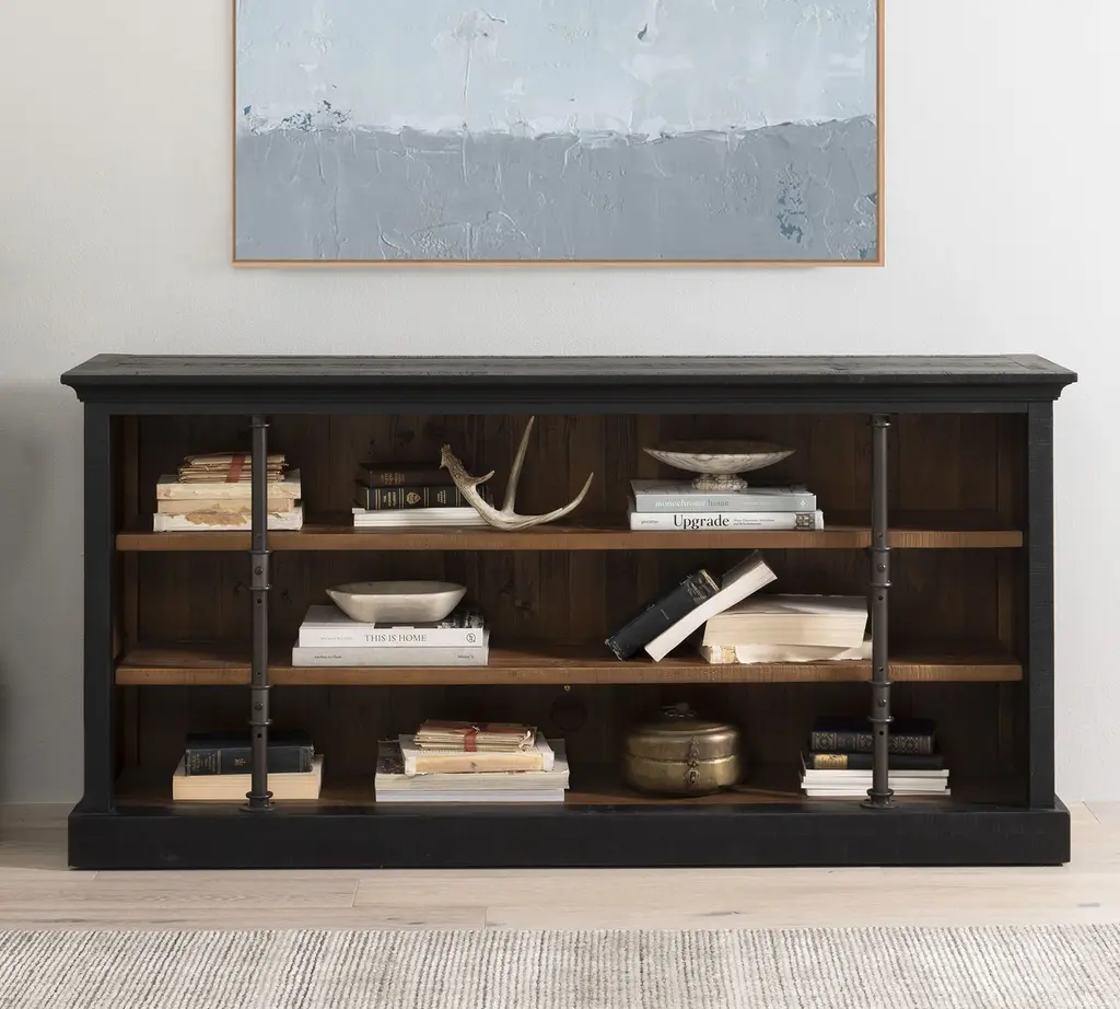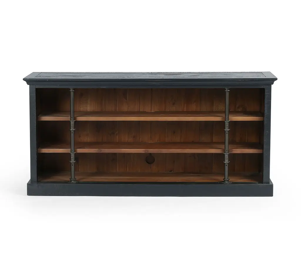 Rustic pine and metal bars pair neatly in this contemporary take on vintage library shelving. Rings fitted along the vertical bars of the Gavin Media Console allow adjustment to the shelf heights, and a cutout on the back facilitates cord management. A mix of warm wood hues and a black matte distressed finish adds to its visual appeal.