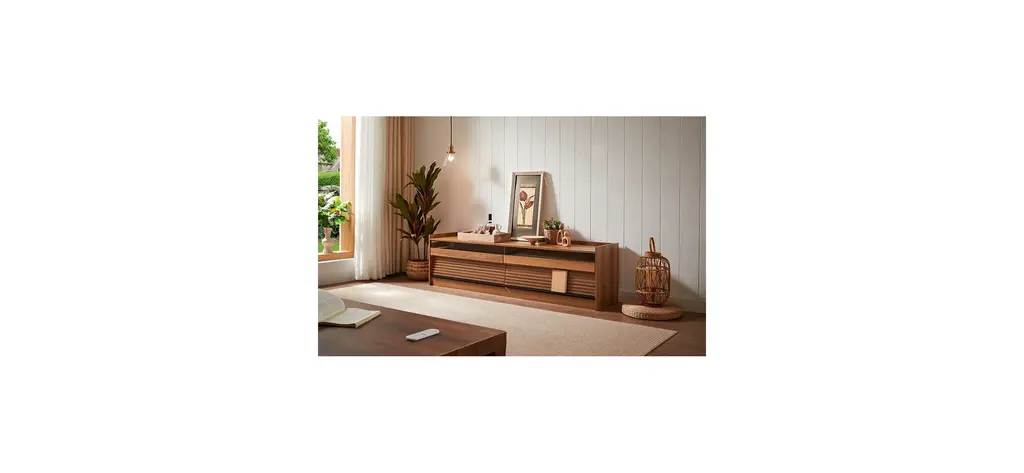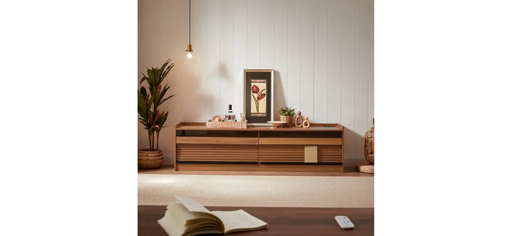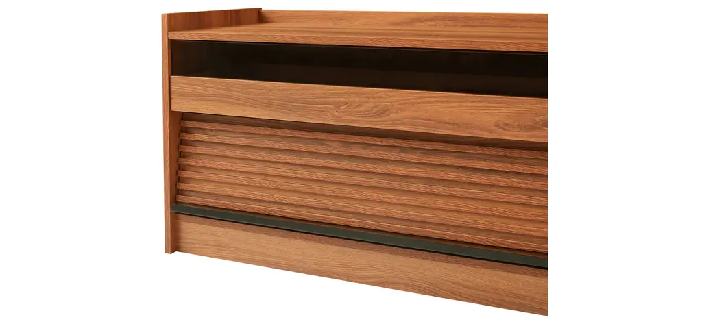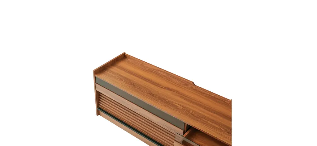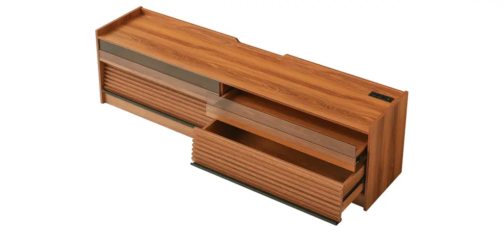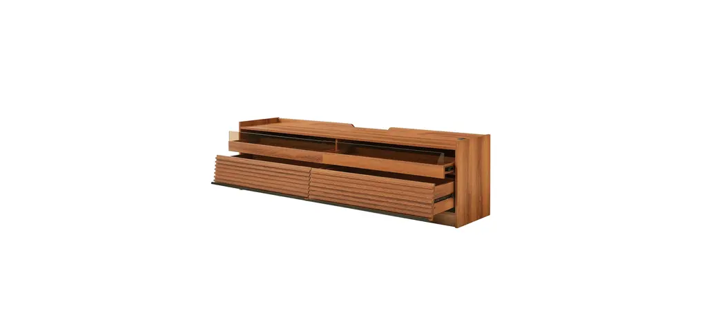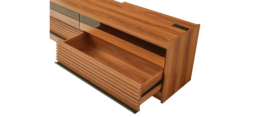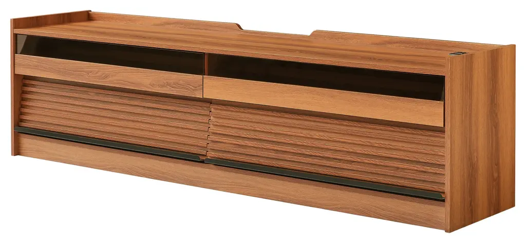[Spacious Storage] Featuring four large drawers with tempered glass fronts and sleek horizontal stripes, this TV stand offers ample storage while adding a touch of modern sophistication.[Built-in Charging Ports] Equipped with integrated Type-C, USB ports, and standard outlets, keeping your devices powered while enjoying your entertainment setup.[Ambient LED Lighting] Enhance your viewing experience with built-in LED lighting that creates a cozy and cinematic atmosphere in your living space.[Functional Magazine & Book Storage] Designed with a top surface on the drawer fronts, offering a stylish and convenient space for magazines and books within arm's reach.[Sleek & Versatile Appeal] With its smooth lines and minimalist structure, this TV stand seamlessly blends with contemporary, modern, or traditional decor styles.Includes: One (1) TV StandMaterial: Tempered Glass + MDF + MetalColor: Multiple Color Options AvailableAssembly: RequiredDimensions: 68.90 inches W x 15.80 inches D x 19.30 inches H
