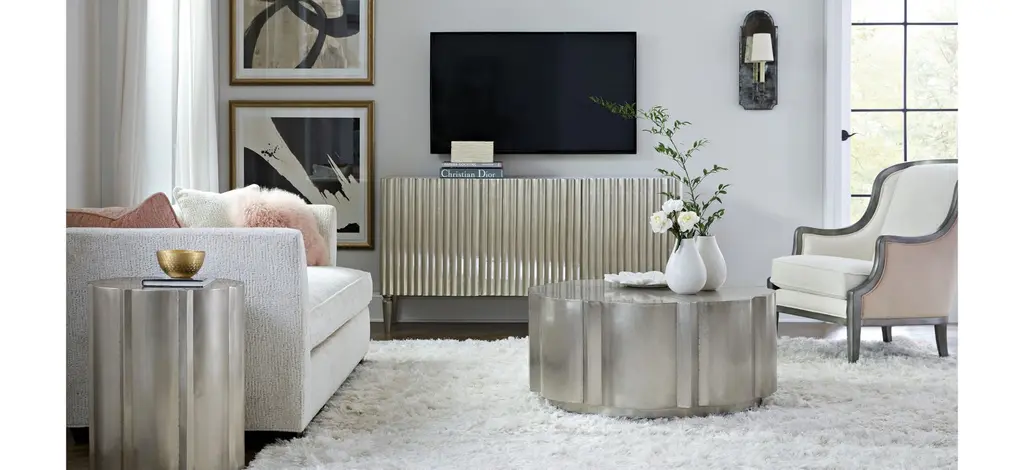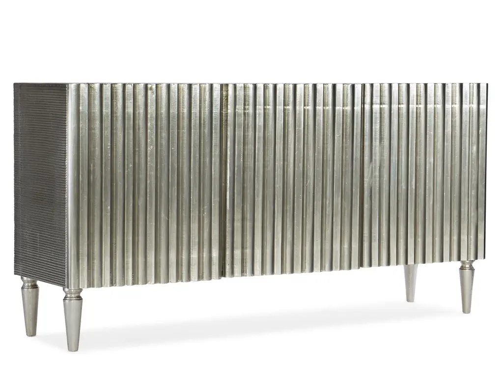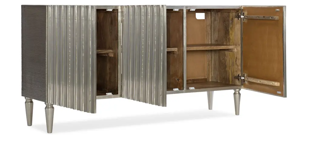 With the look of hand-forged craftsmanship and a hint of glam, the German Silver console combines mango solids with a German silver foil finish for a bold focal point piece. Accommodating up to a 65-inch TV, the console has 3 doors, 2 adjustable wood shelves and a ventilated back panel.