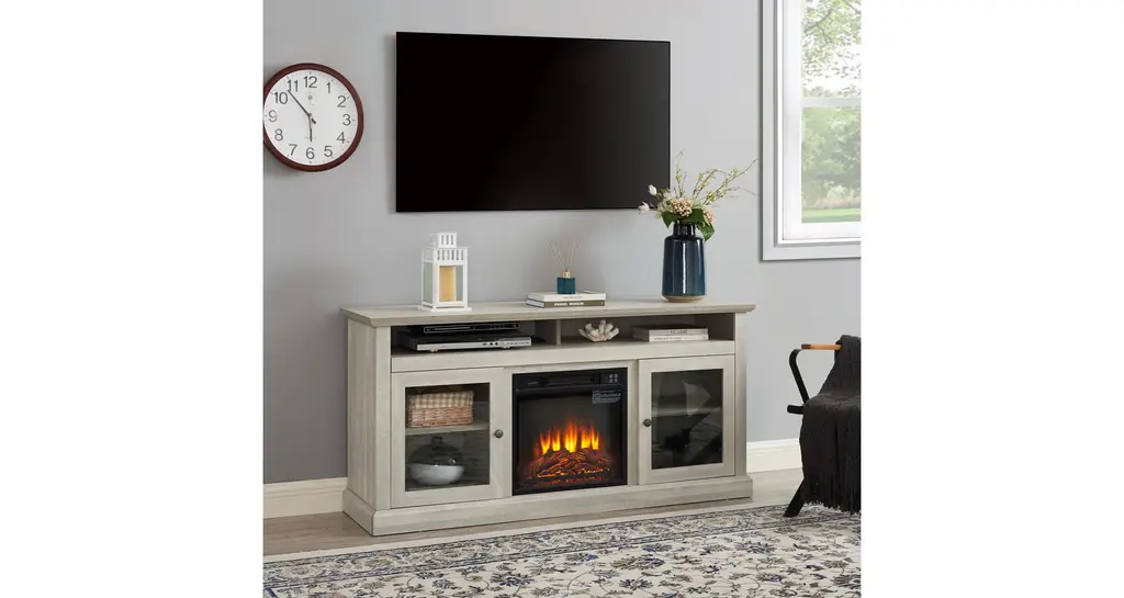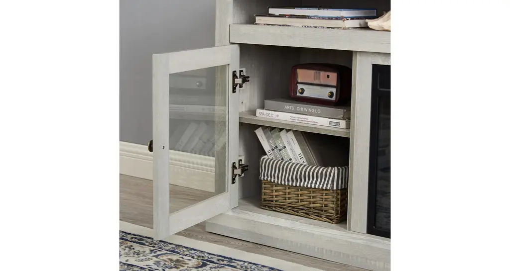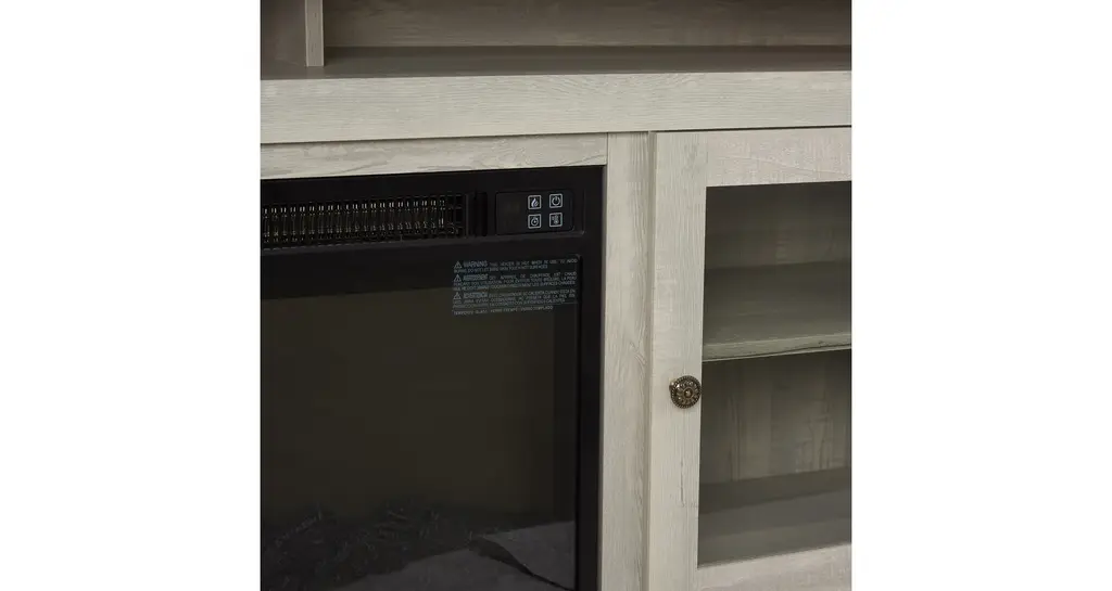 [Your Home Entertainment Center] With a width of 60'', this fireplace provides perfect space for most TVs up to 65'', and ample amount of storage space for all your consoles, DVD players, and any other home entertainment gadgets.[Realistic Fireplace Charm, Just Push of a Button Away] Equipped with a remote, this fireplace adds elegant charm to your living space, with or without heat.[Easy Cable Management] Wire pass-through on the back of the fireplace allows simple cable management for your entertainment equipment.[Classic American Design] Textured finishes, antique metal hardware, and glass doors bring a classic touch to your home.