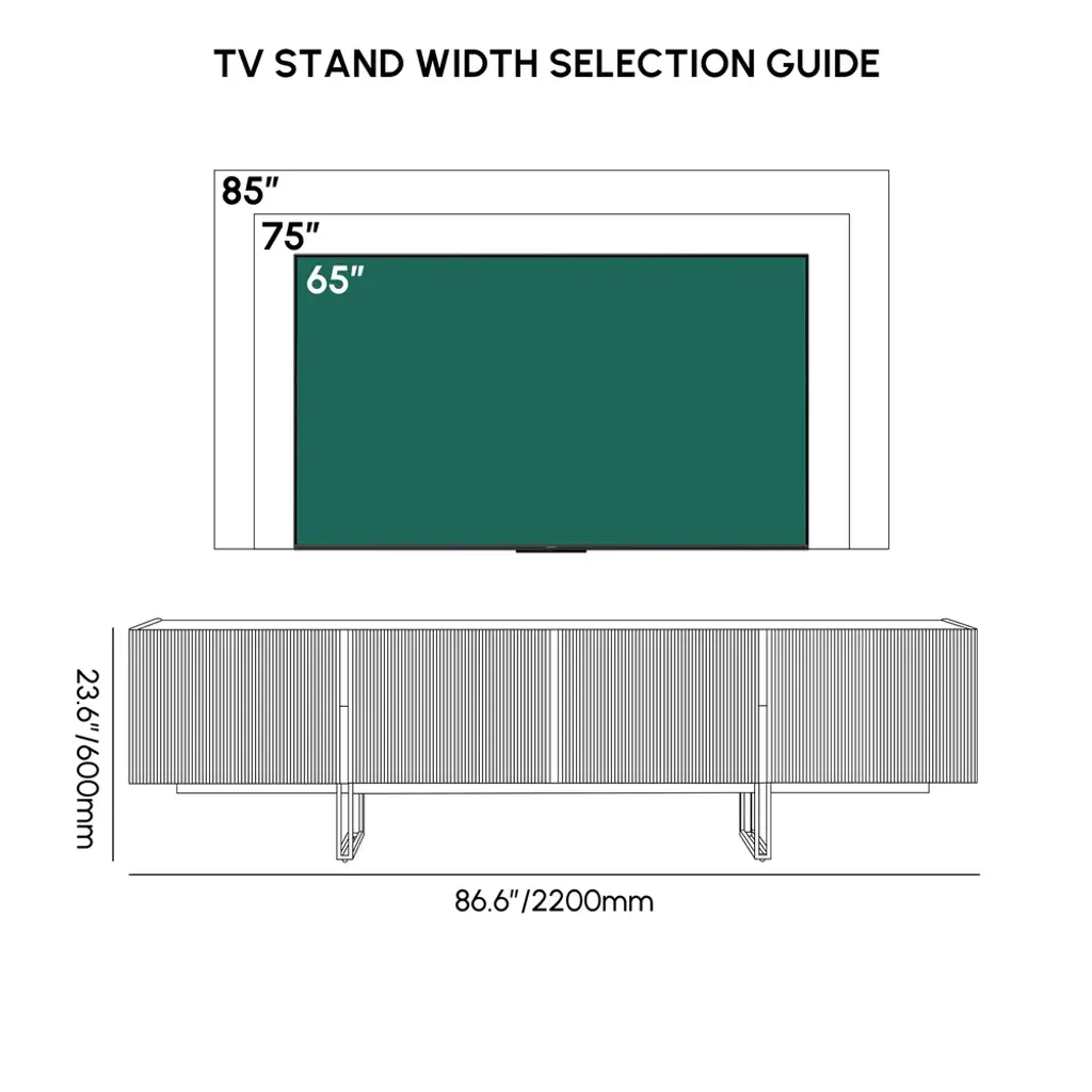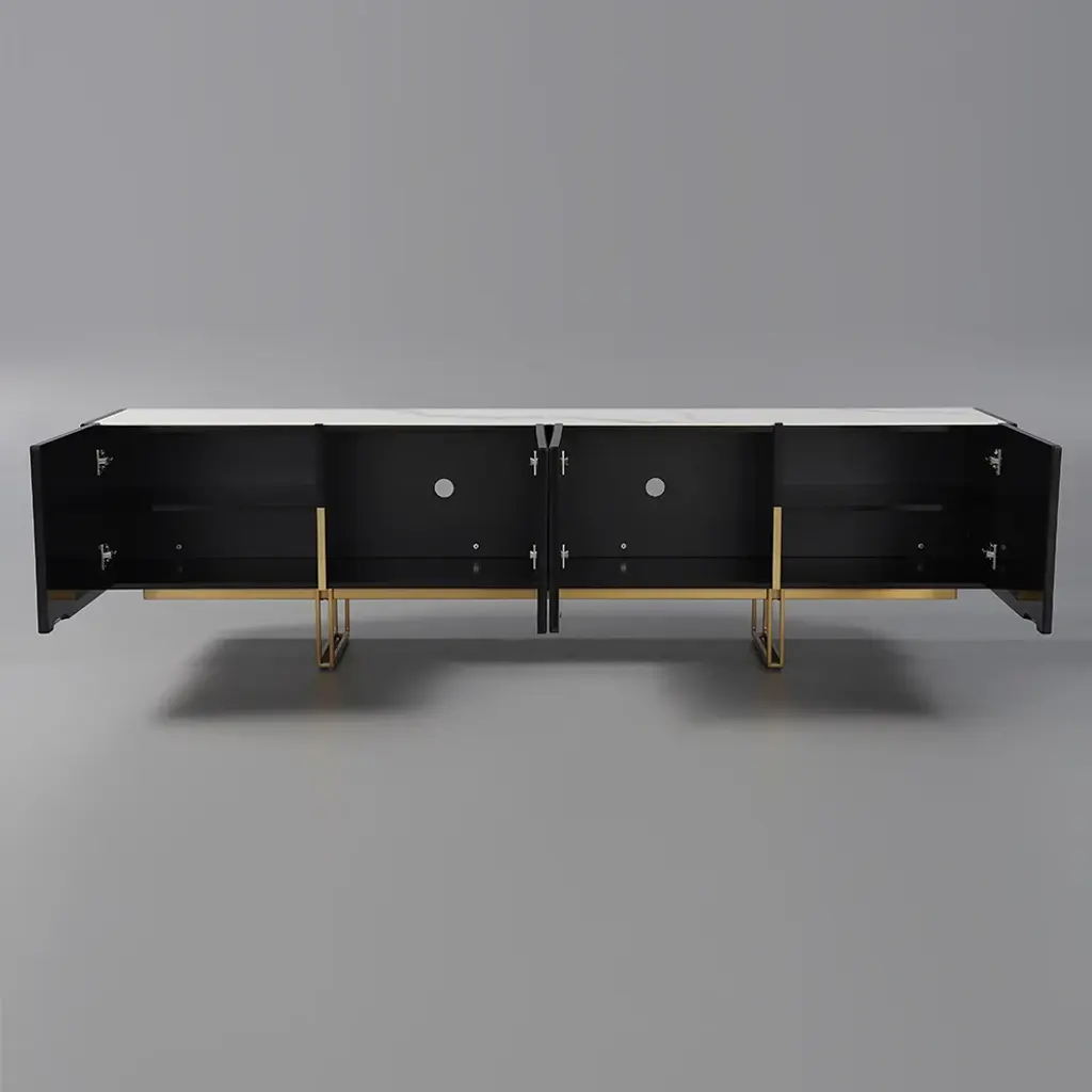 Elevate your entertainment area with Grovyn's sleek design. The heat-resistant stone surface withstands daily use while four spacious cabinets hide clutter, creating a polished foundation for 80" screens in elegance.