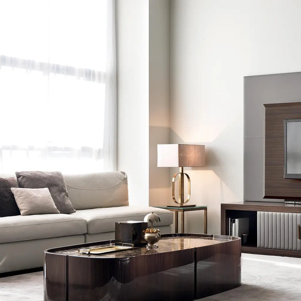 An idea of lightness and natural grace is the leitmotif in this piece, created to seem almost suspended. Its design features a rectangular floating structure in wood with a myrtle burl veneer and brushed gloss finish. The upholstered open compartment reveals a single shelf and has a front panel covered in grosgrain design leather (in Clayton Lumiere 1639) with a single handle in burnished brass. This is a stream-lined media unit that will transform any room into a cosmopolitan loft.