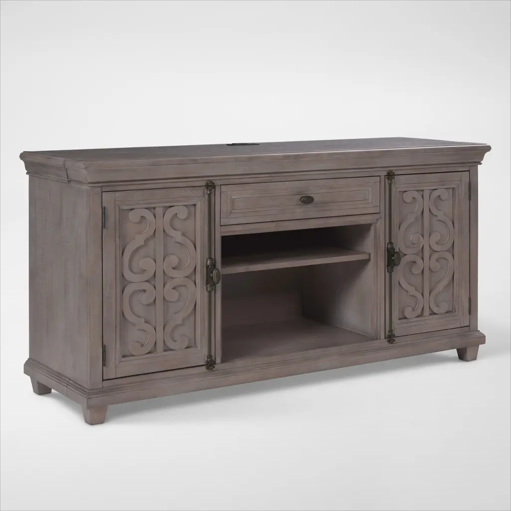 Classic good looks, rustic brushed finish, sleekly shaped legs—the Hazel TV Stand also has lots of storage for all your entertaining essentials.