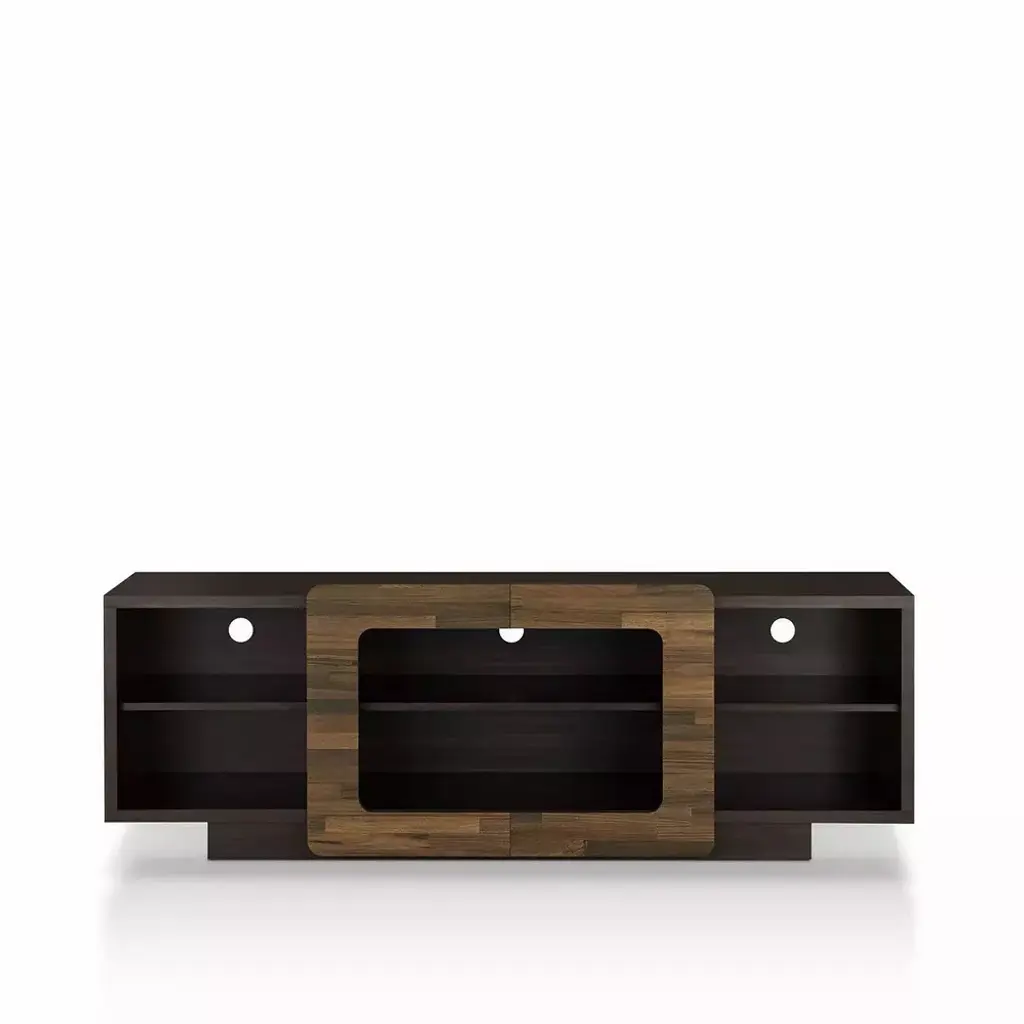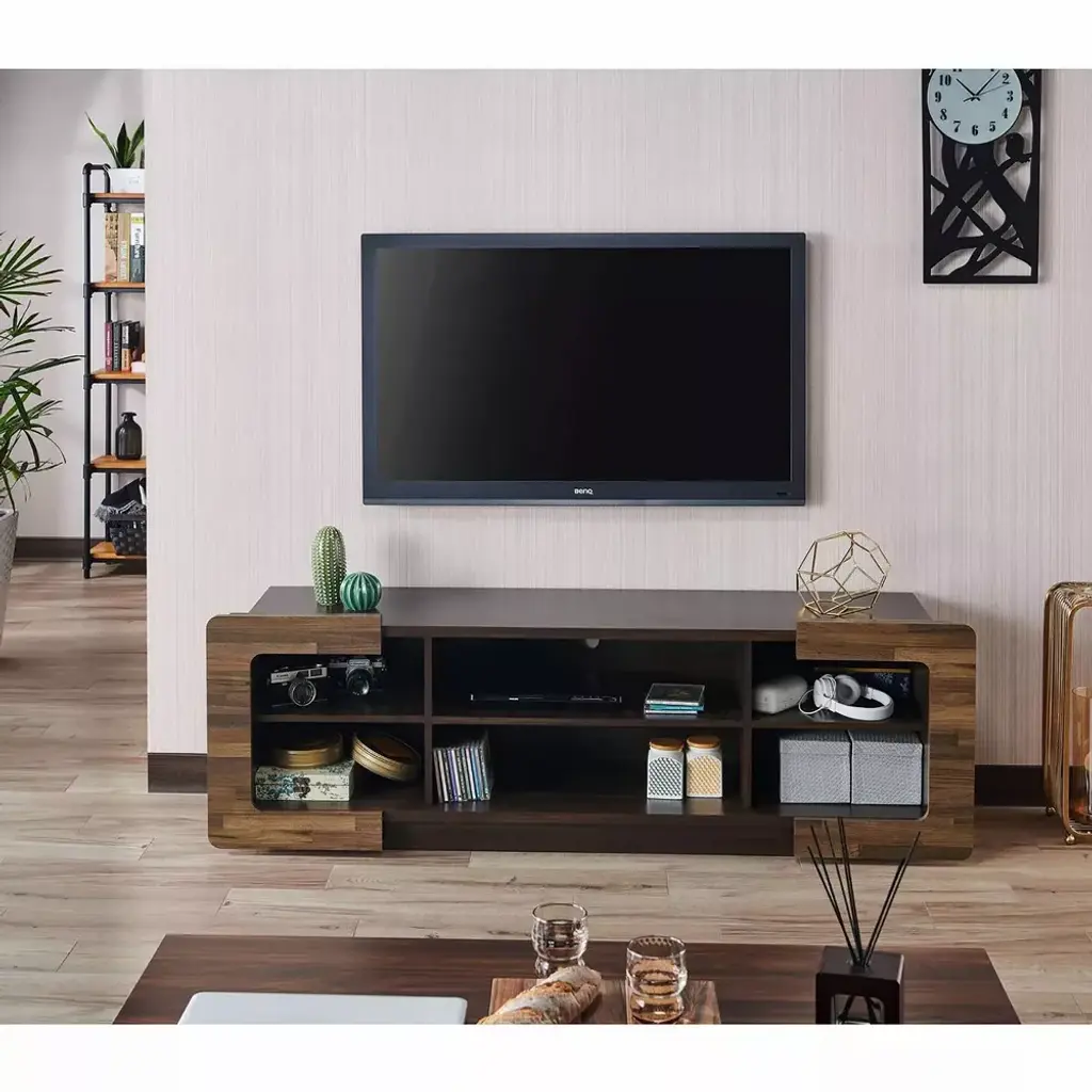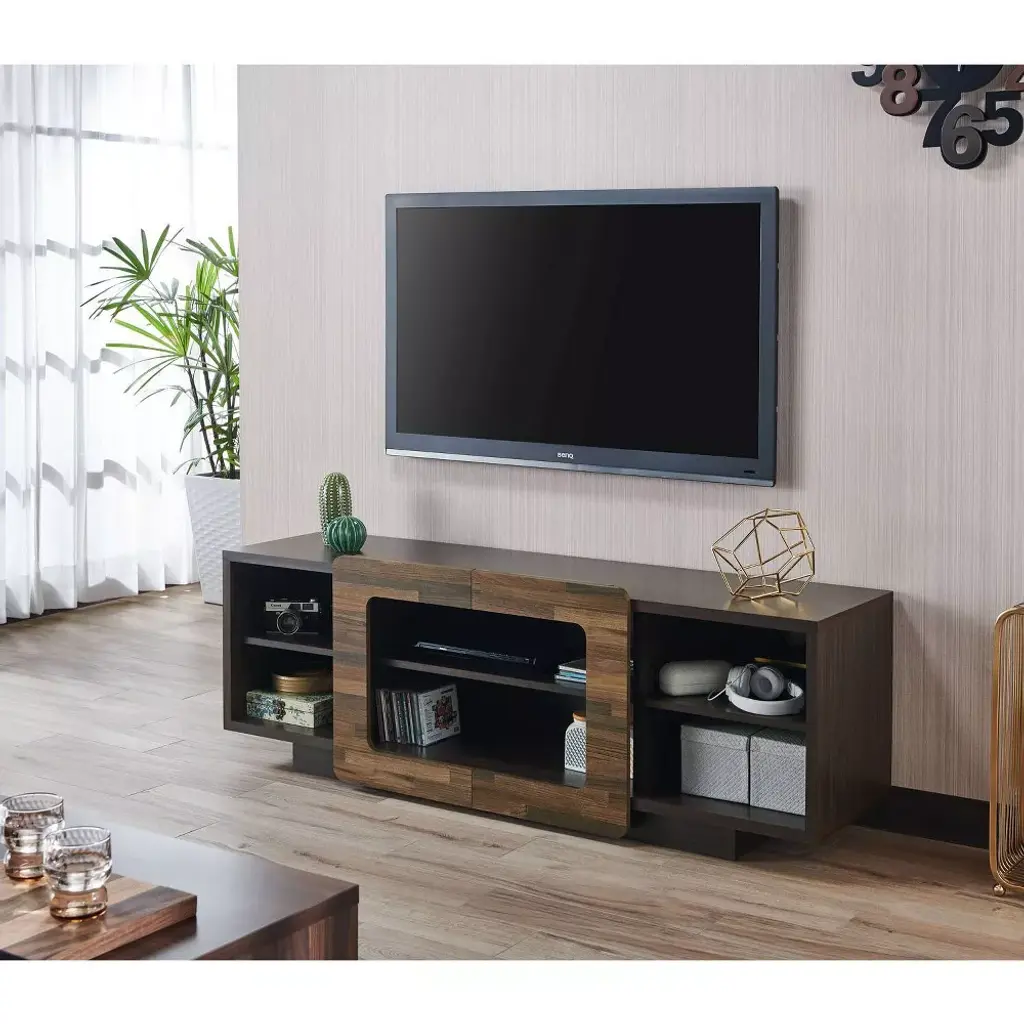 Don't limit your entertainment center to simply serving as a storage space for all your electronics. This TV stand offers accommodation for consoles and a room enhancer. Three of the six open shelves feature rear holes for wire organization. But its the unique wood trim slides that decorate a room with natural warmth. The central panels open to the edges whenever you feel you need a change in the room.