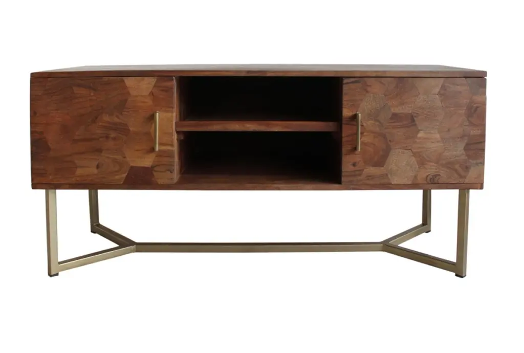 Elevate your living space with the Honeycomb Pattern 2 Door TV Stand with Metal Base. This modern TV stand, crafted from natural acacia wood, features a striking honeycomb pattern and a sturdy metal base, blending style and functionality seamlessly.