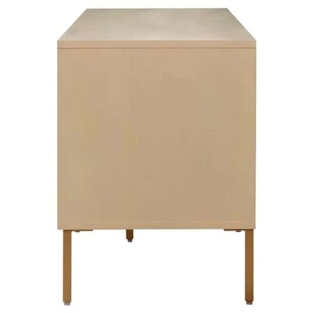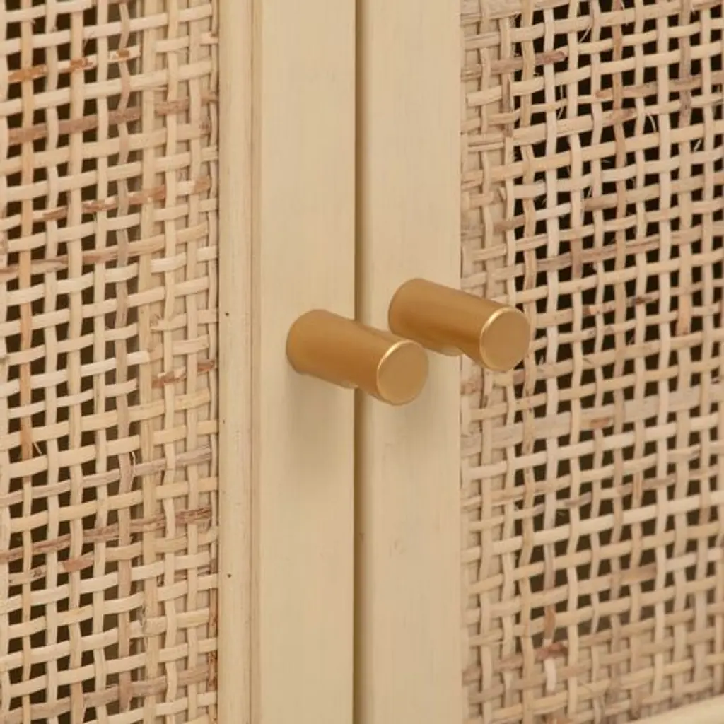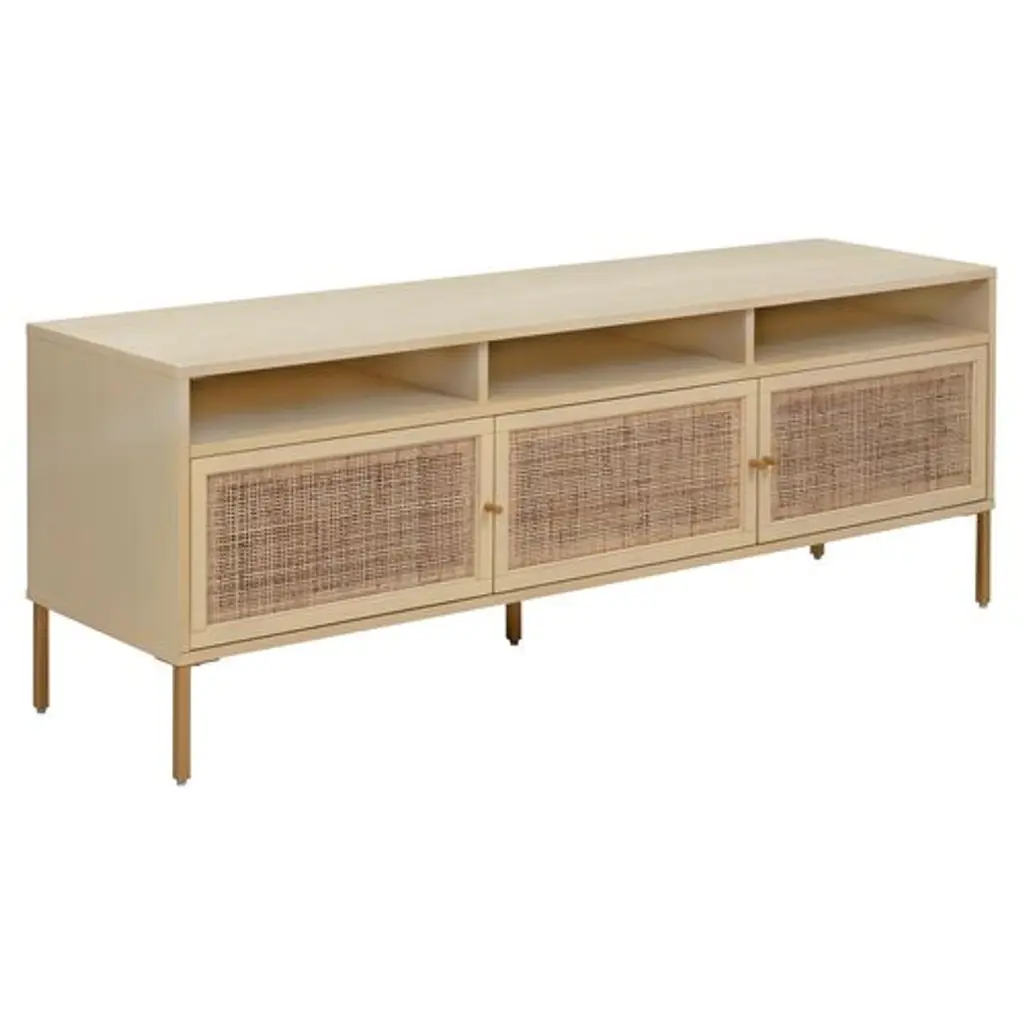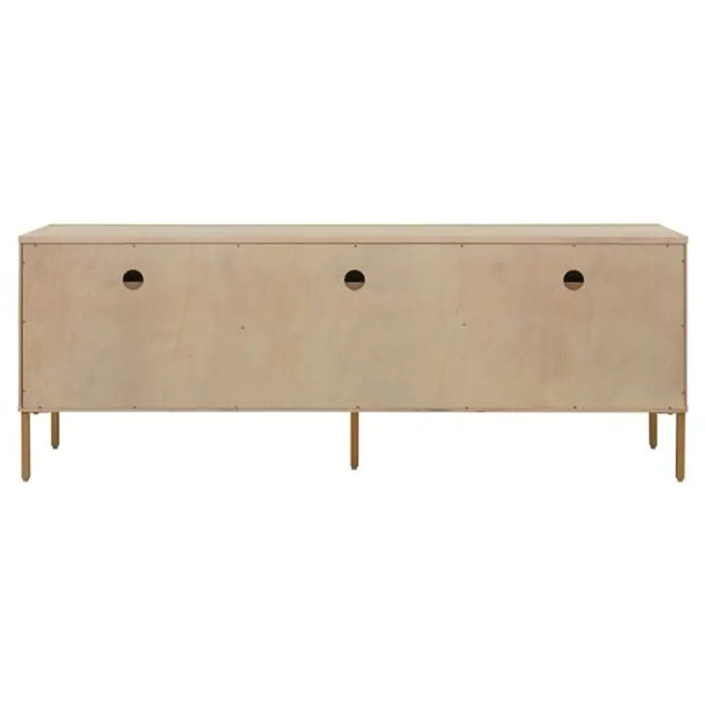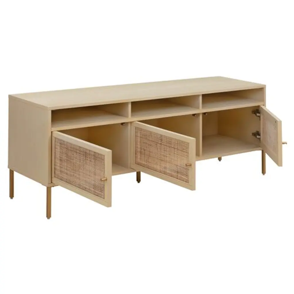 Door inserts of woven cane give this media console organic elegance; gleaming brass legs and door pulls provide timeless glamour. Behind each of the three soft-close doors is a rear cutout for cord management.