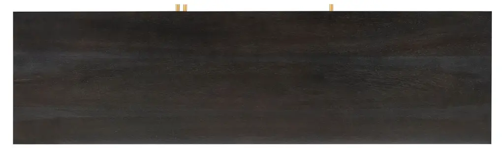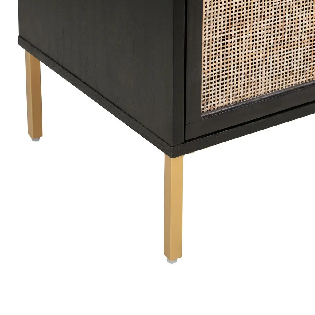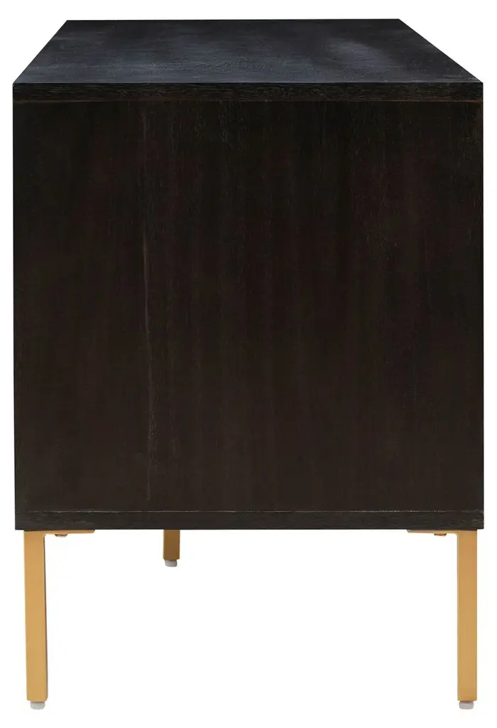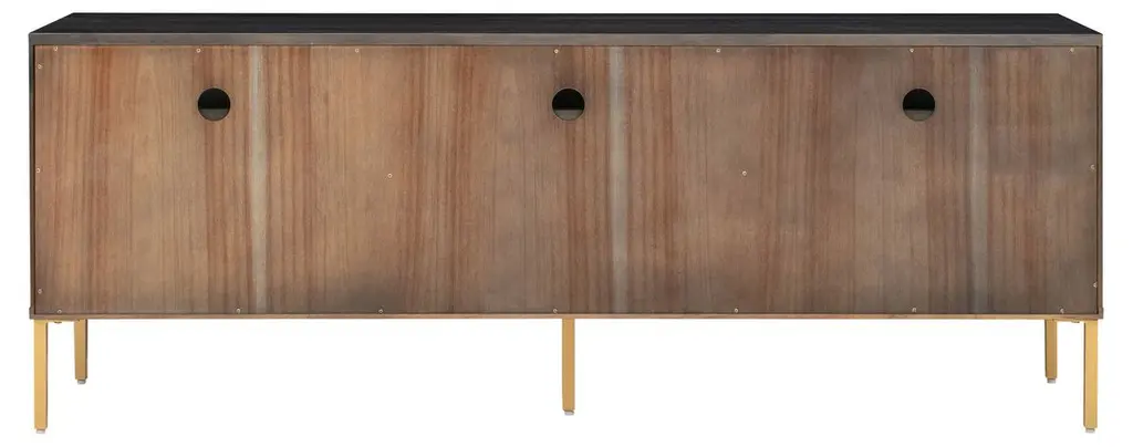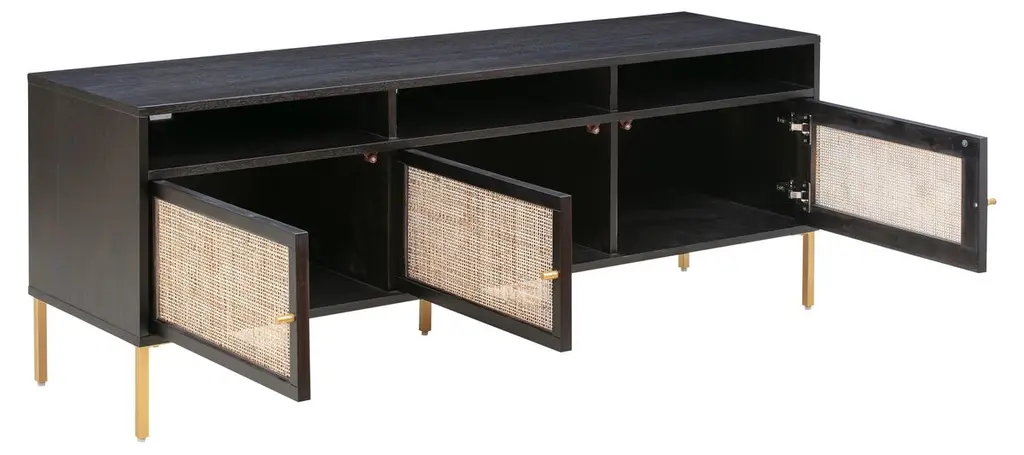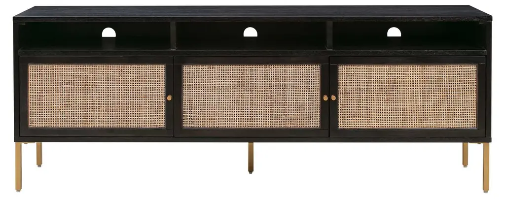 Door inserts of woven cane give this media console organic elegance; gleaming brass legs and door pulls provide timeless glamour. Behind each of the three soft-close doors is a rear cutout for cord management.