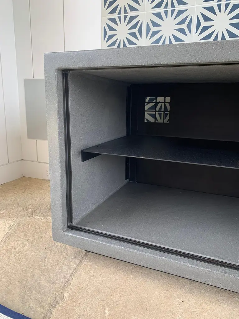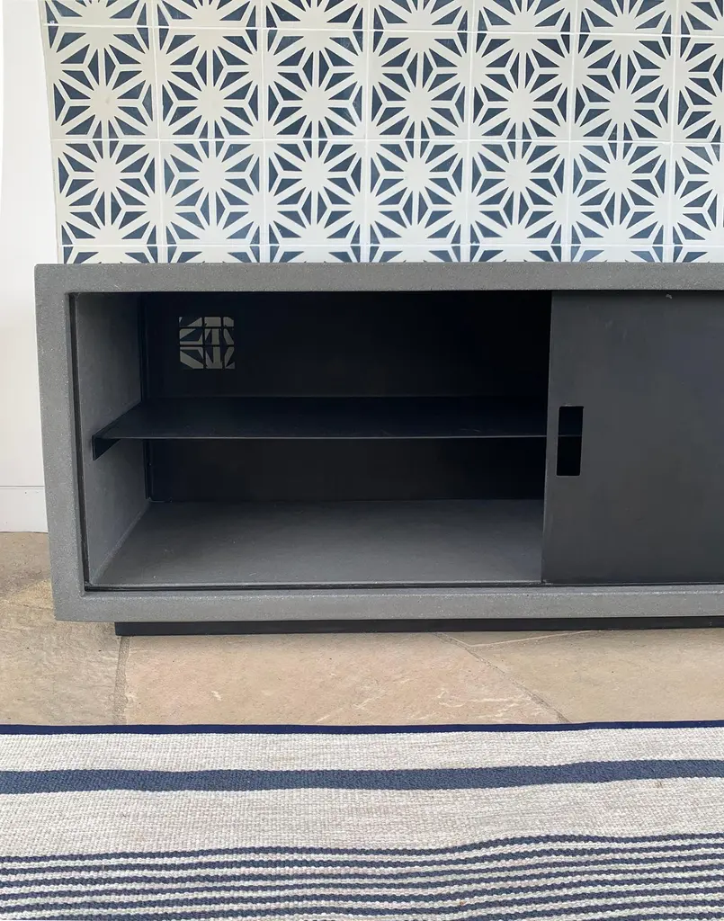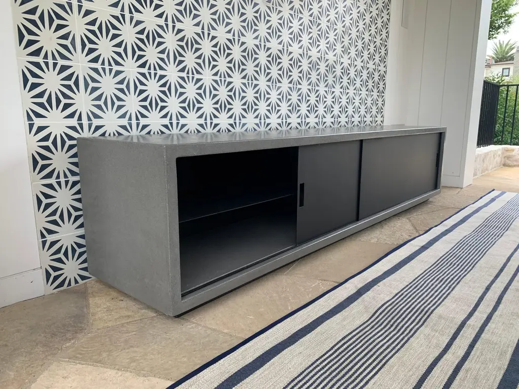 For sophisticated audiophiles, pro gamers, and gear heads: the James de Wulf concrete media console. Seamless concrete console holds two levels of storage, divided by a solid steel shelf, all protected by a pair of sliding steel doors. Concrete is polished and finished for a smooth, subtle lustre. Suitable for indoor and covered outdoor use.A cabinet as strong as your game.