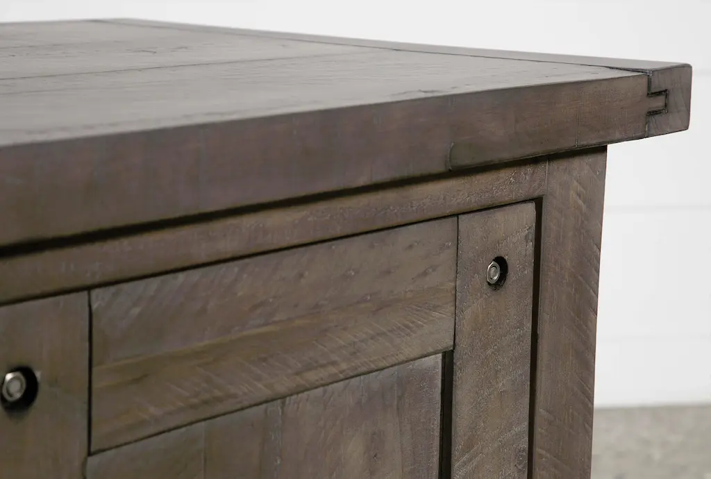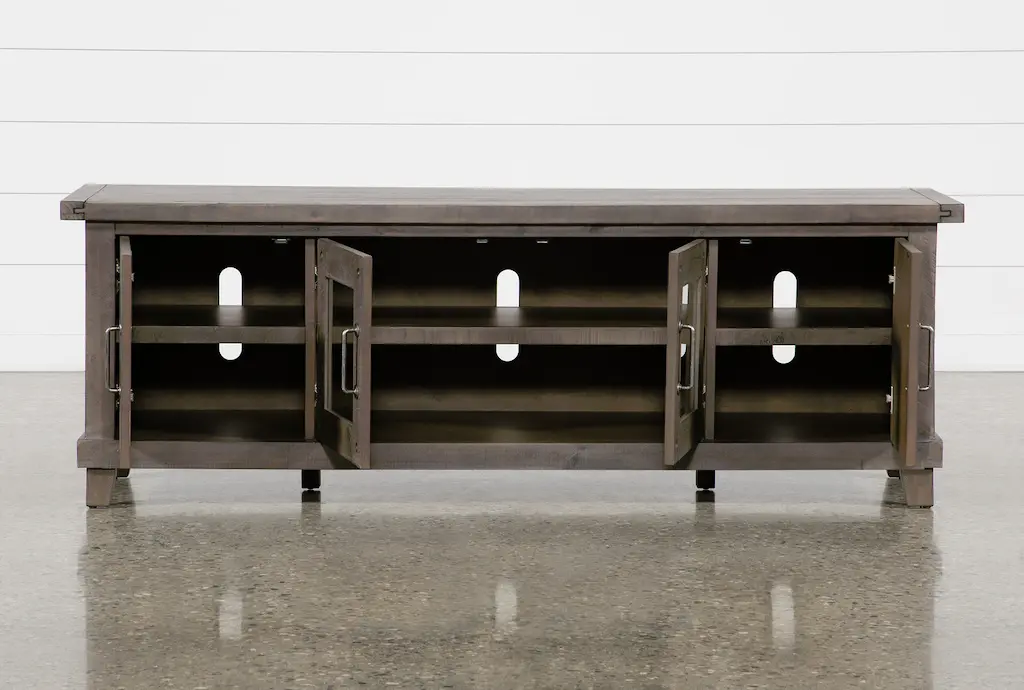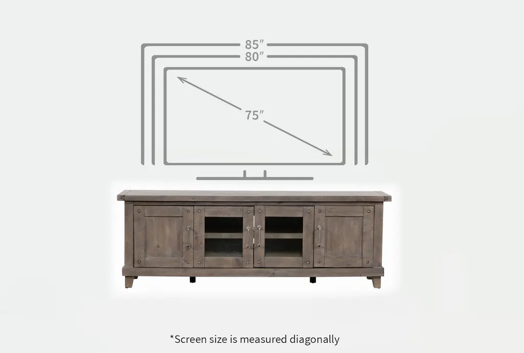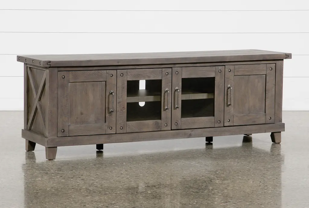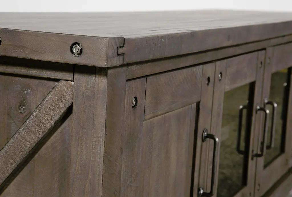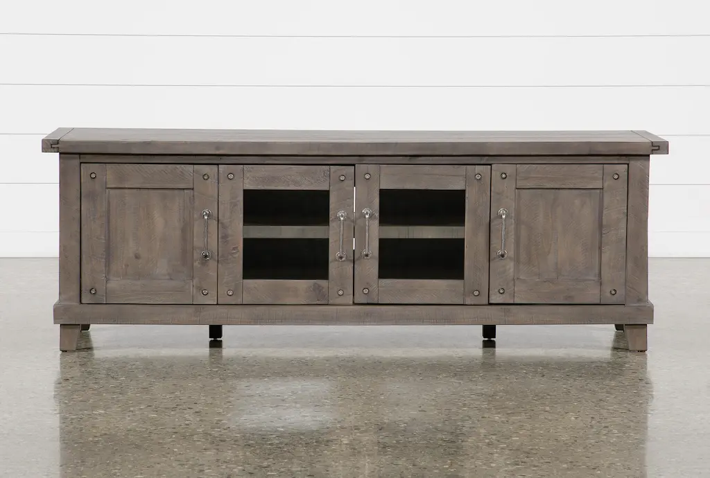 Thanks to 100% solid pine construction, our Jaxon TV console is truly designed by nature. The wood's character plays a central role in its authenticity and rustic charm, from the rugged texture, to the knots, nicks, splits and imperfections that ensure it's one-of-a-kind. Decked in a grey finish and distinguished by metal bolt detail, this unit also features hammered pewter pulls.
