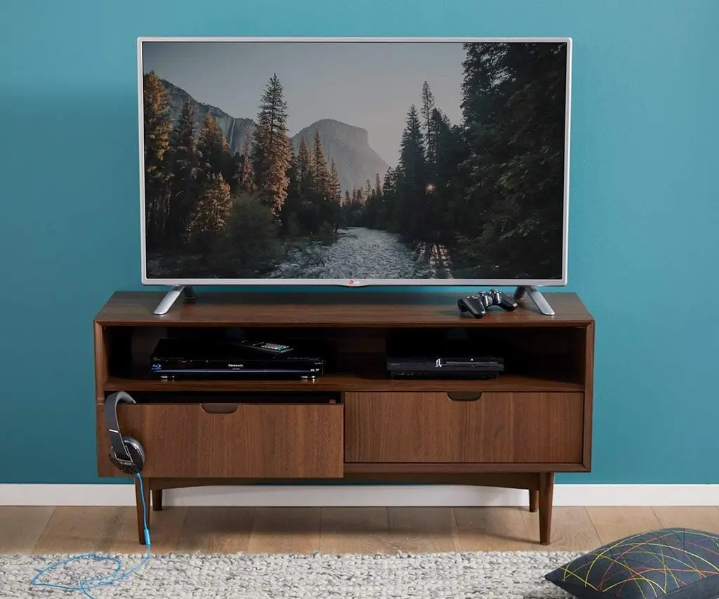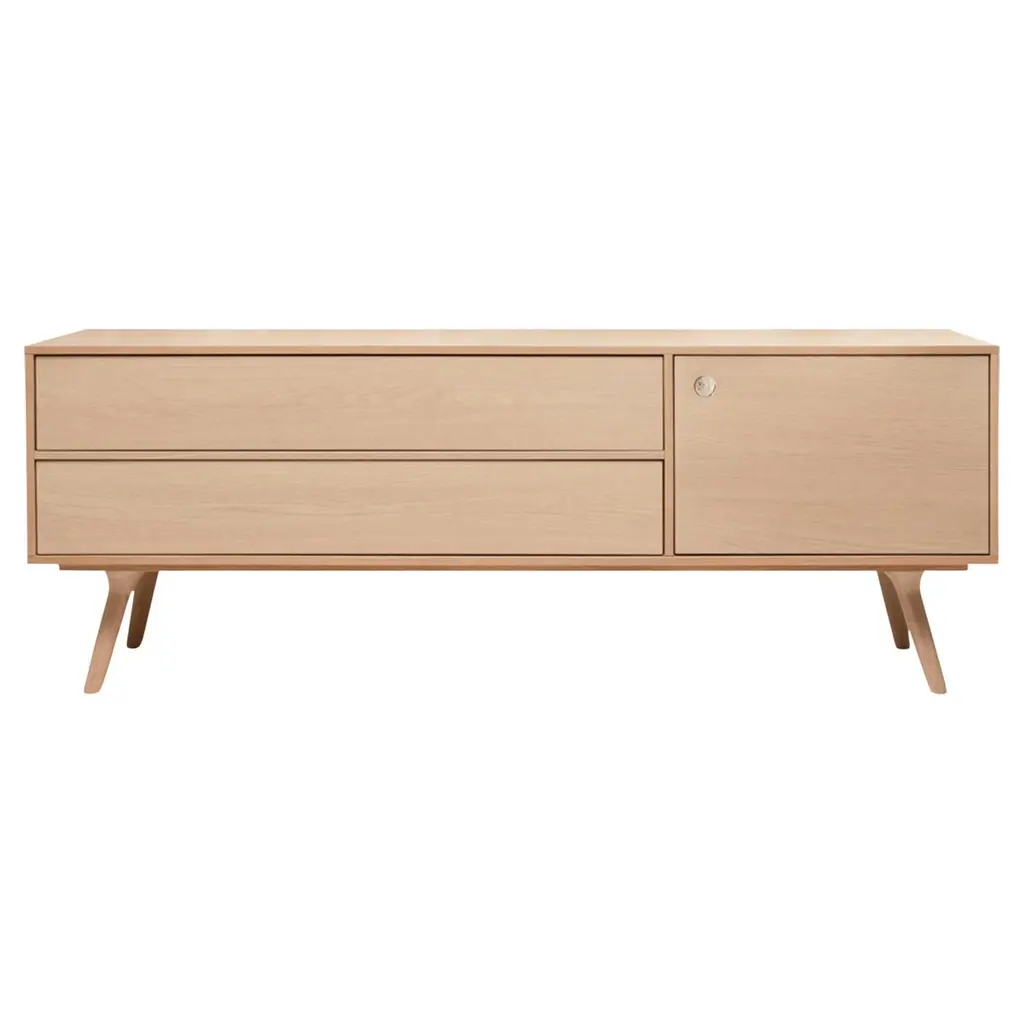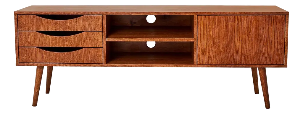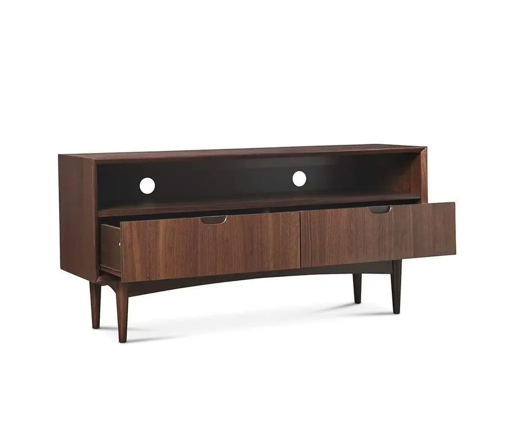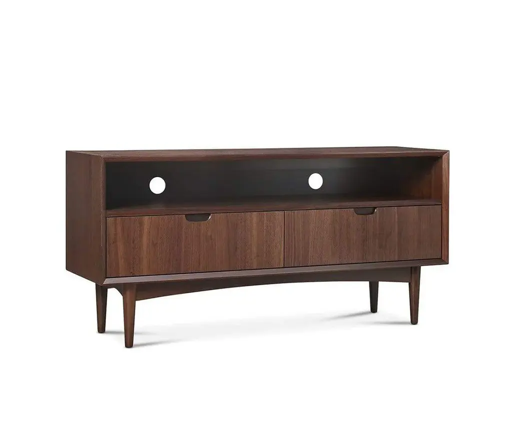 Mid-century modern style abounds in the Juneau Media Stand. Simple lines, a warm finish, convenient drawers, subtle curves in the small details and classic tapered legs define this design as an elegant piece worthy of your entertainment area. Timeless design such as this ensures it will house your electronics beautifully for generations to come.