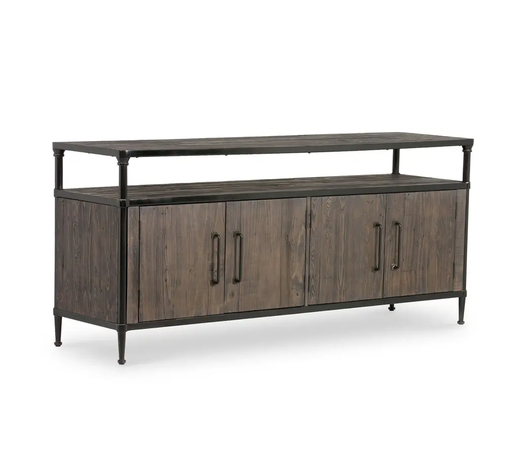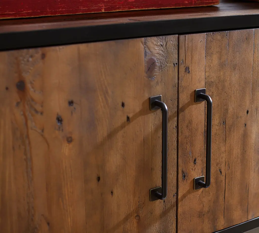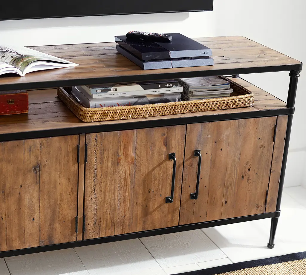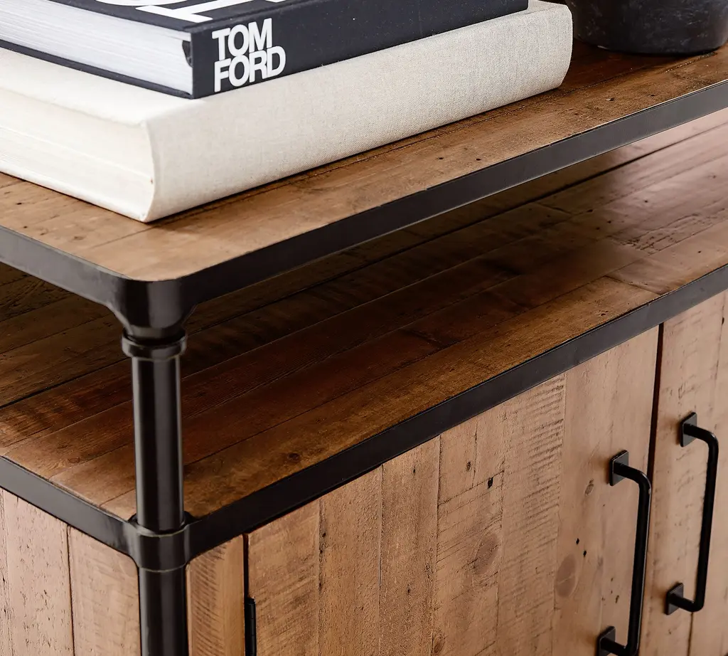The rustic character of reclaimed pine complements the industrial style of the metal framework on Juno. Crafted with reclaimed wood, its grain and color variations make each piece unique. The mix of an open shelf and concealed storage is perfect for a den.