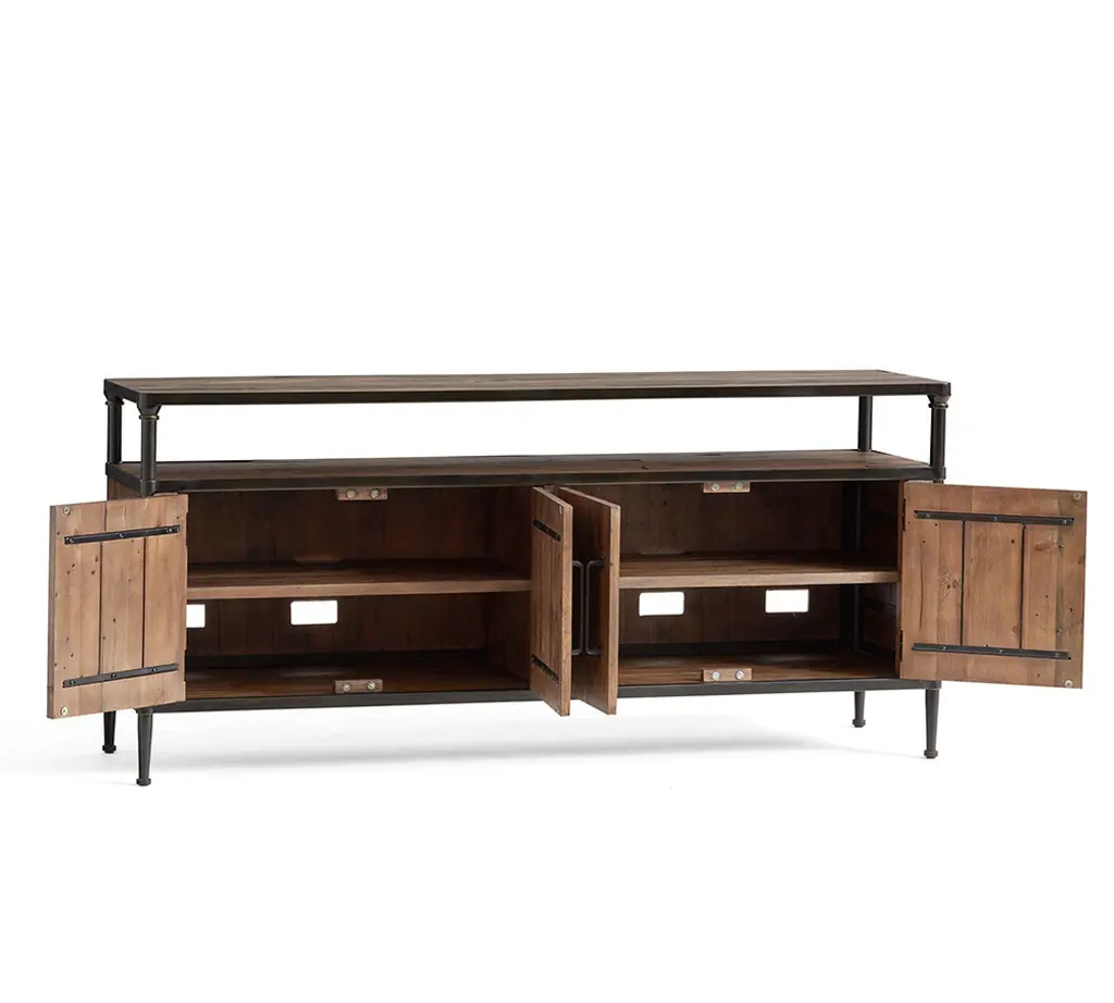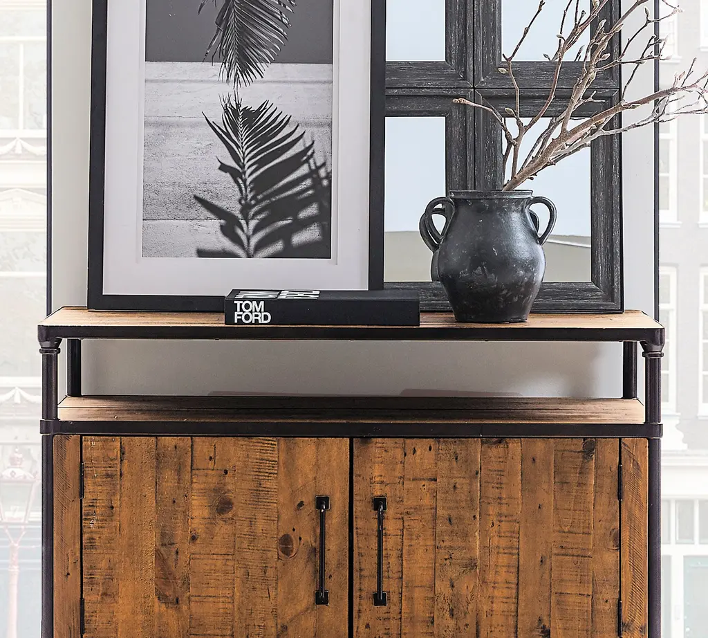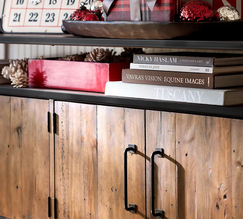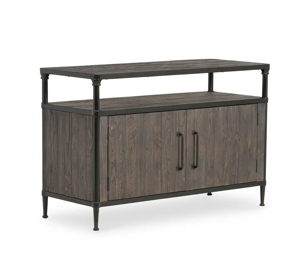 The rustic character of reclaimed pine complements the industrial style of the metal framework on Juno. Crafted with reclaimed wood, its grain and color variations make each piece unique. The mix of an open shelf and concealed storage is perfect for a den.