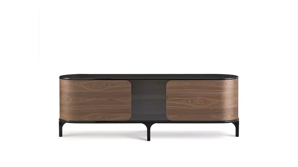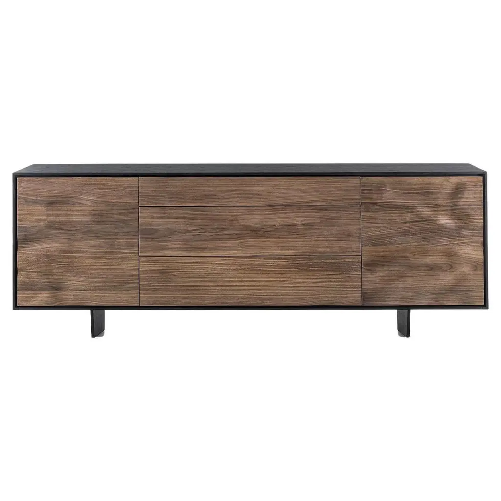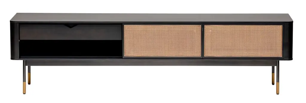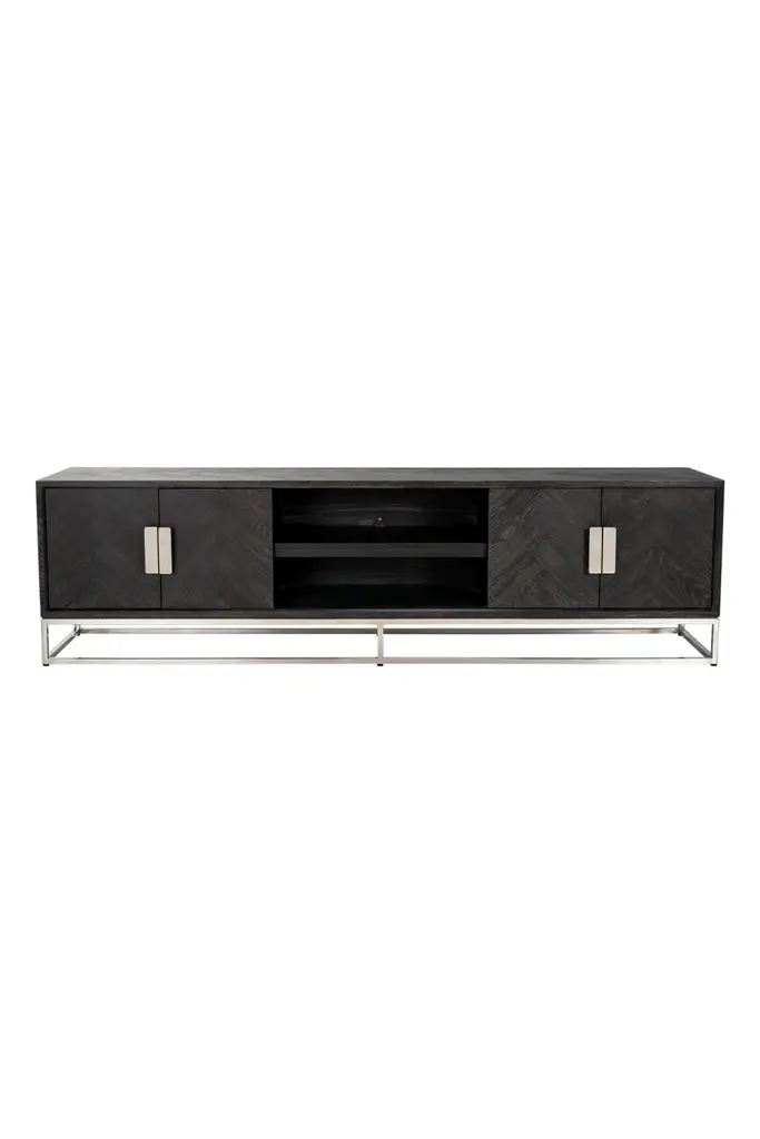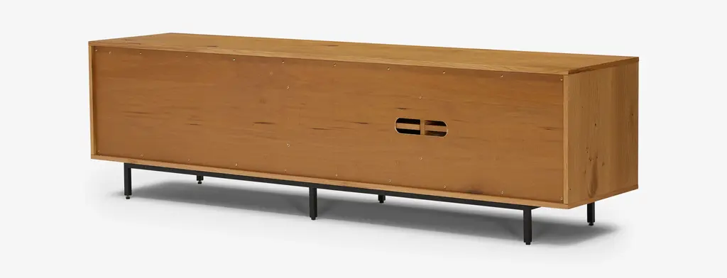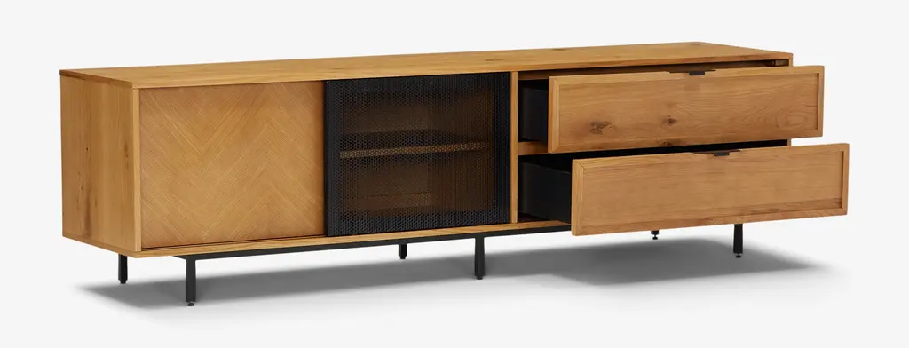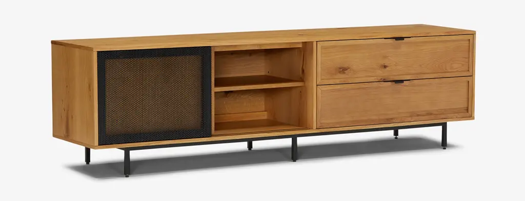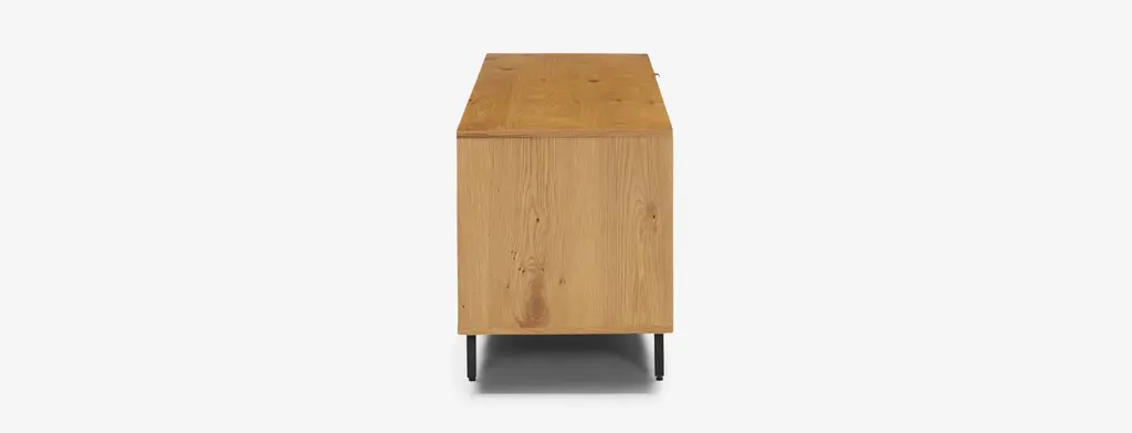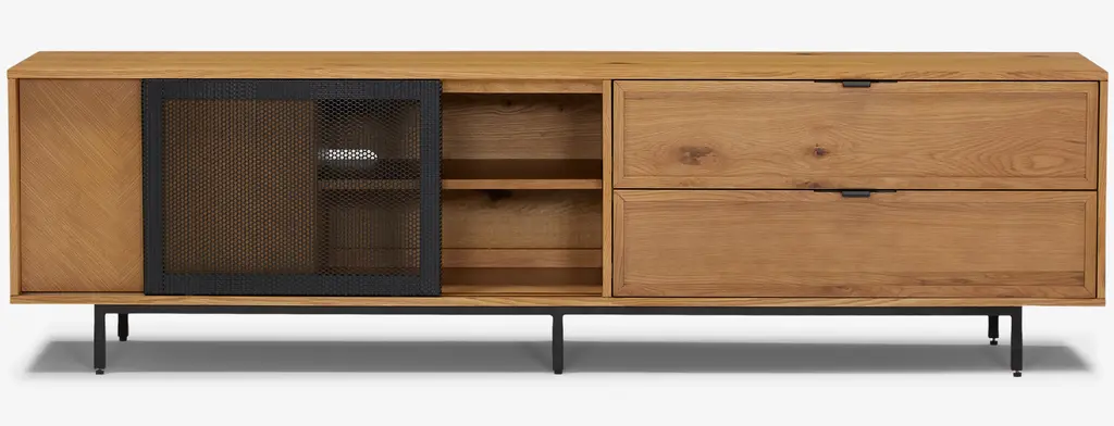 Keeping your media needs organized and clutter free has never been easier than with this modern rustic oak finished console. Natural wood whorls and markings are put on full display with this rustic oak finished console. Neatly resting on a black finished metal base and pin straight legs, this modern piece seamlessly blends rustic modern vibes with industrial elements.