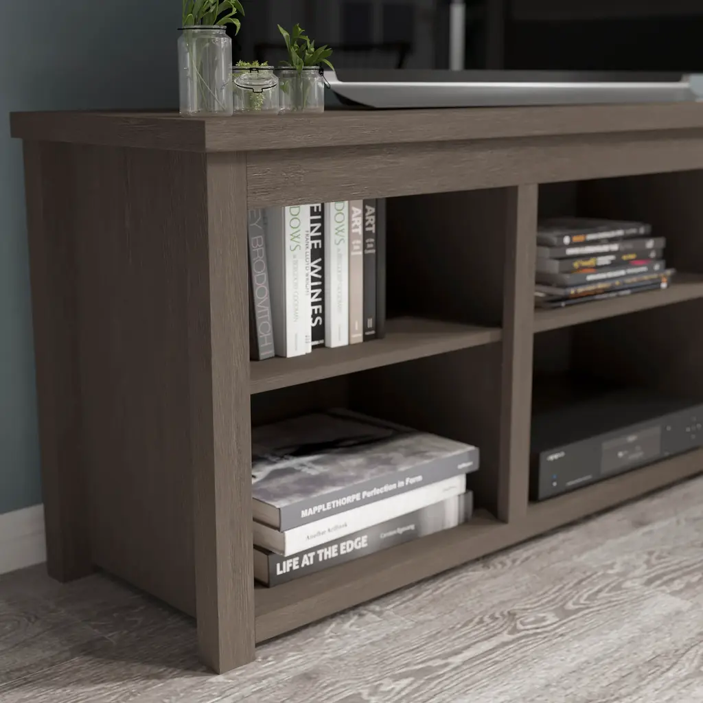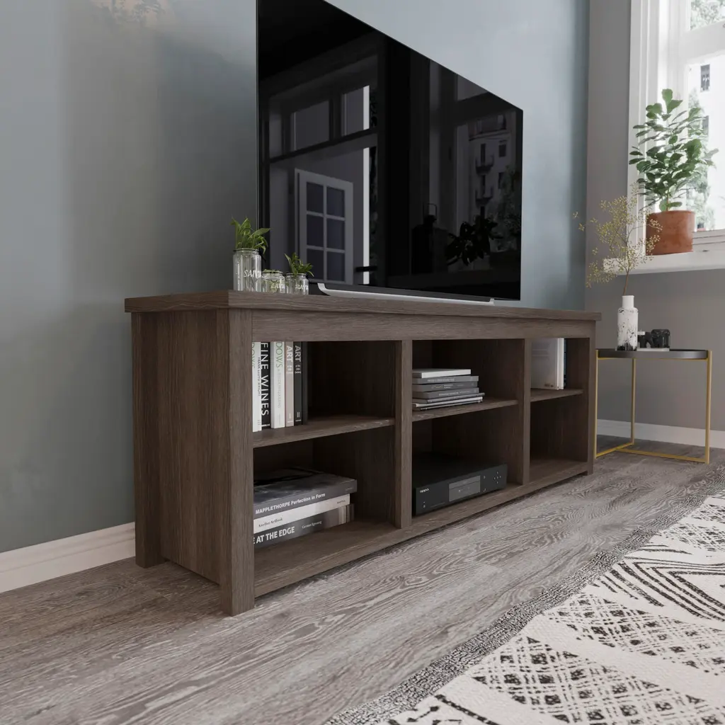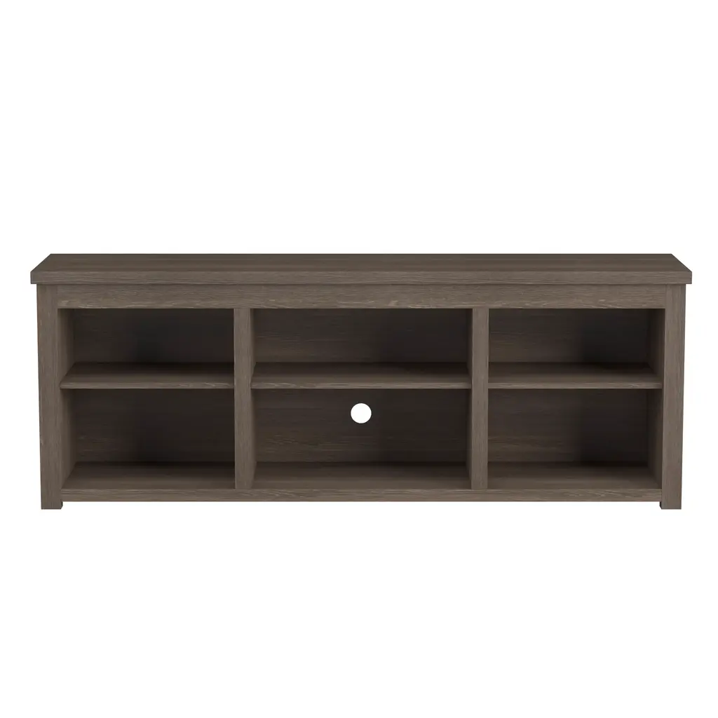 Simple lines and minimalist style abound in this TV stand for up to 80" TV's. Open concept storage and a cord management port are ideal for displaying the newest electronics and family mementos while keeping everything neat and tidy. The updated look of this media center would be a great addition to your new home or would give an instant upgrade to your current space. Mounting your television on the wall above this entertainment center will open up great design possibilities. Additional electronics like gaming consoles and soundbars will fit neatly on the top shelf while decor items can tuck into any of the 6 compartments. The 65 inch top supports 200 lbs. static weight capacity while the height adjustable shelves hold up to 30 lbs. to accommodate your display items. Step-by-step illustrated instructions or online PDF allow you to assemble this TV console in under an hour. Fixed plastic floor glides protect your hard flooring surfaces from scuffs and scratches if bumped into. Furniture mover pads can be purchased to help move this unit with minimal effort. Wipe clean with water and dry cloth to keep this storage cabinet looking new.