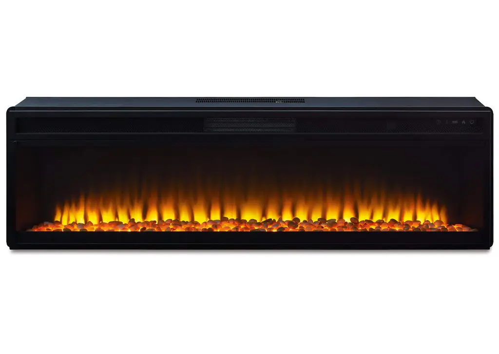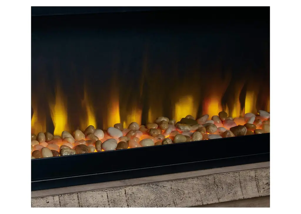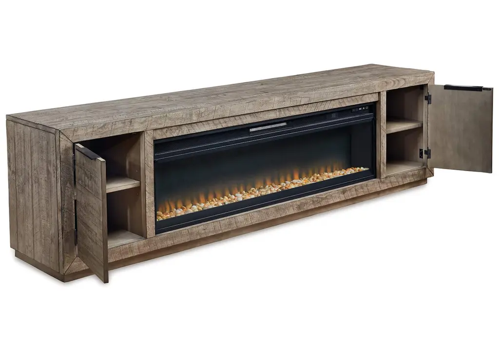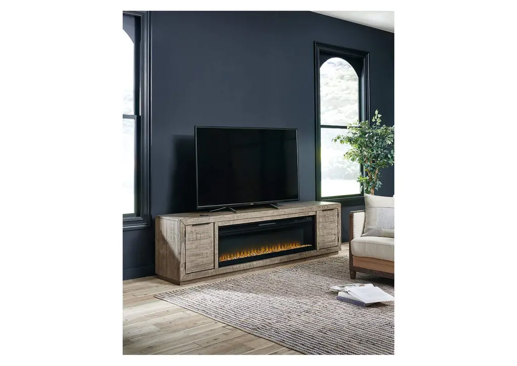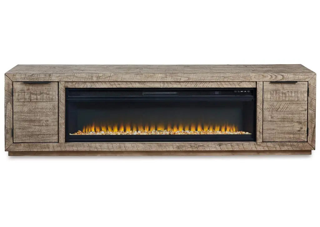 The Krystanza extra-large TV stand with fireplace insert is sure to win your heart with its daring take on modern rustic expression. Its crisp, clean minimalist-chic profile is enriched with striking pine wood grain and a weathered gray finish with distressed saw mark texture. For your added viewing pleasure, the wide fireplace insert gives you the cozy feel of a fireplace without the added hassle. With the touch of a button, adjust the temperature and the color-changing flames, and set the timer for long-lasting enjoyment. It comes with faux glass crystals and natural stones, so you can customize the look of the flame bed. Weight 248.000 lbs. (111.6kgs.)