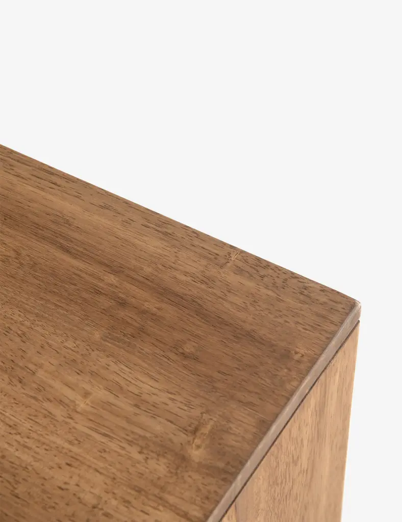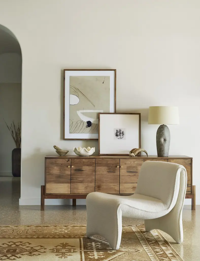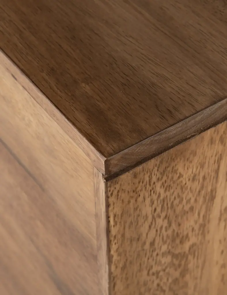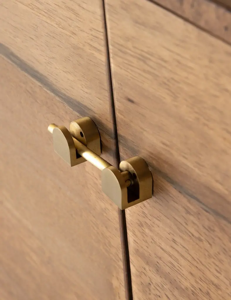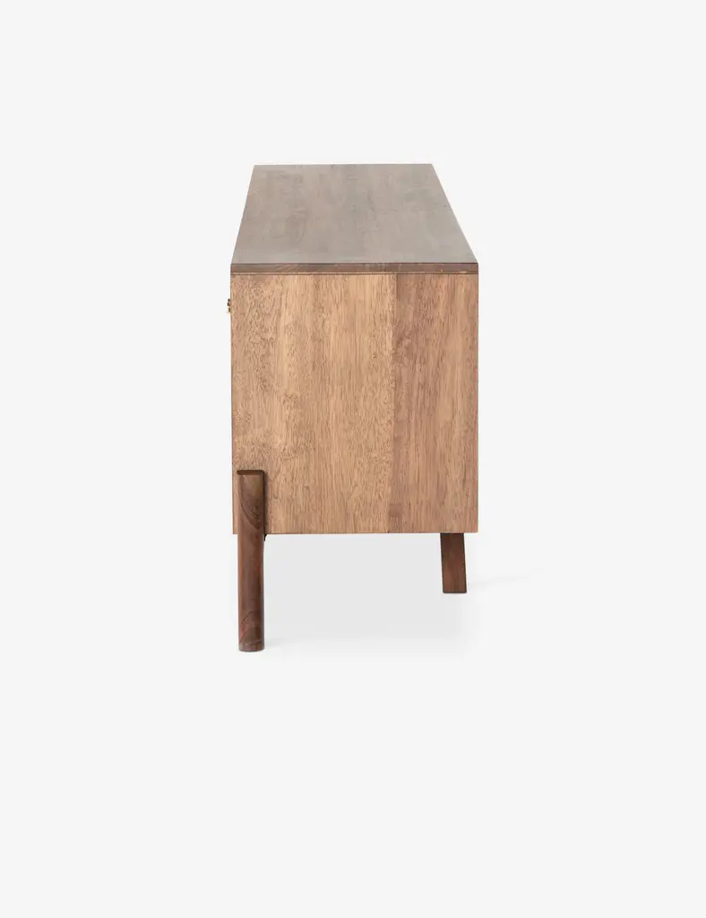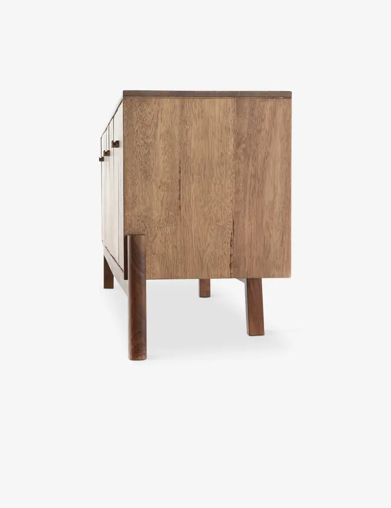 This media console table takes a statement-making approach to organic, natural materials. With contrasting legs for a floating look, sleek brass hardware on all six doors, and media cutouts, it's a perfect fit for your modern living room.