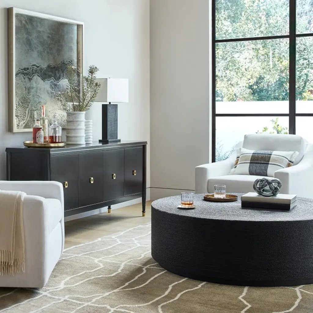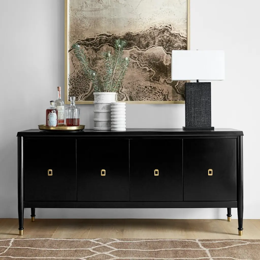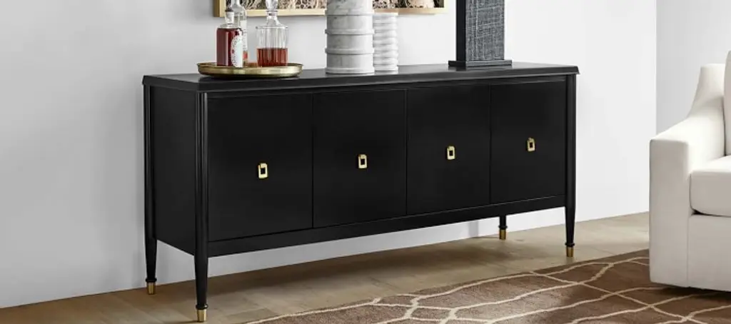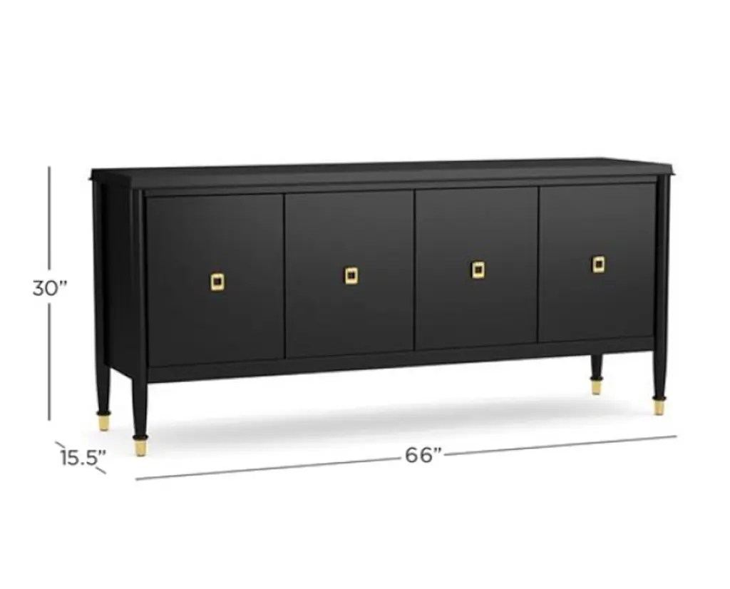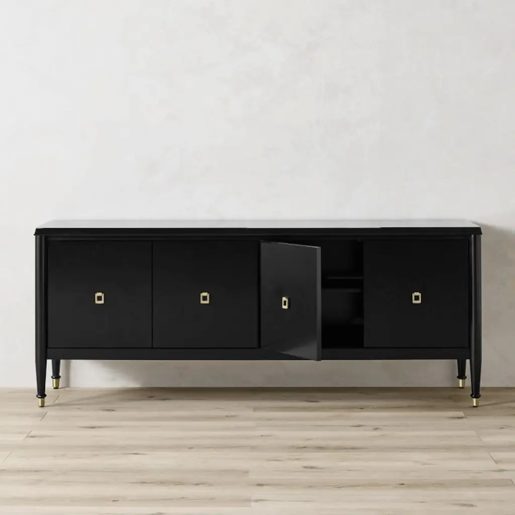The elegant restraint and pleasing proportions of 1940s French furnishings inspired our impeccably crafted Lacourte media console. The brass-handled doors conceal two adjustable shelves and six cord cutouts, and a semi glossy lacquer finish adds sophistication.